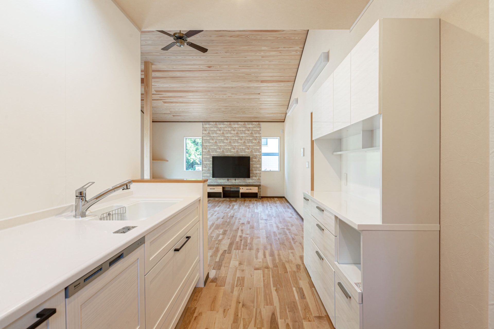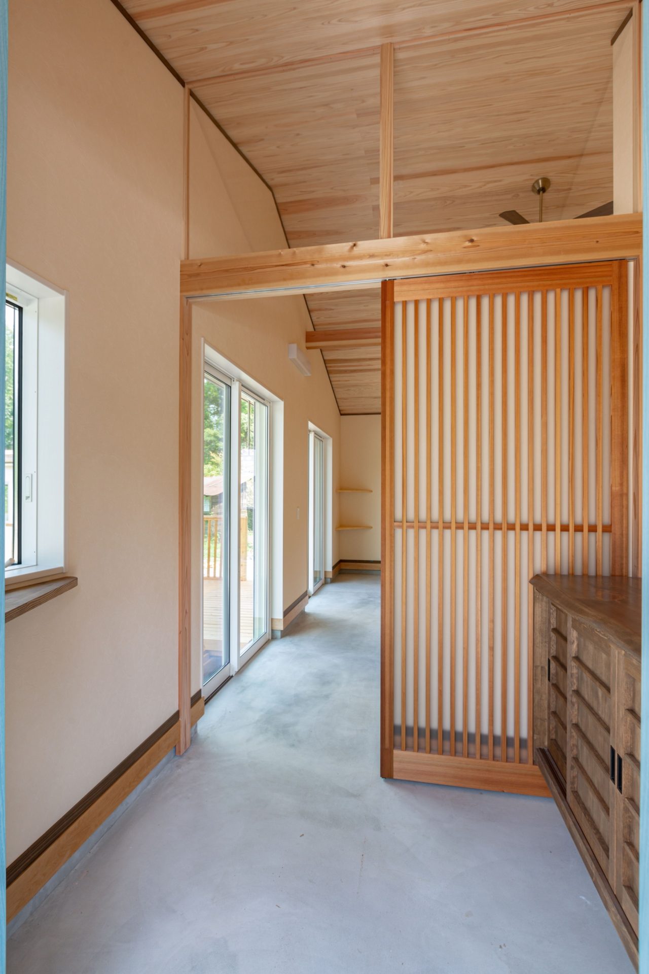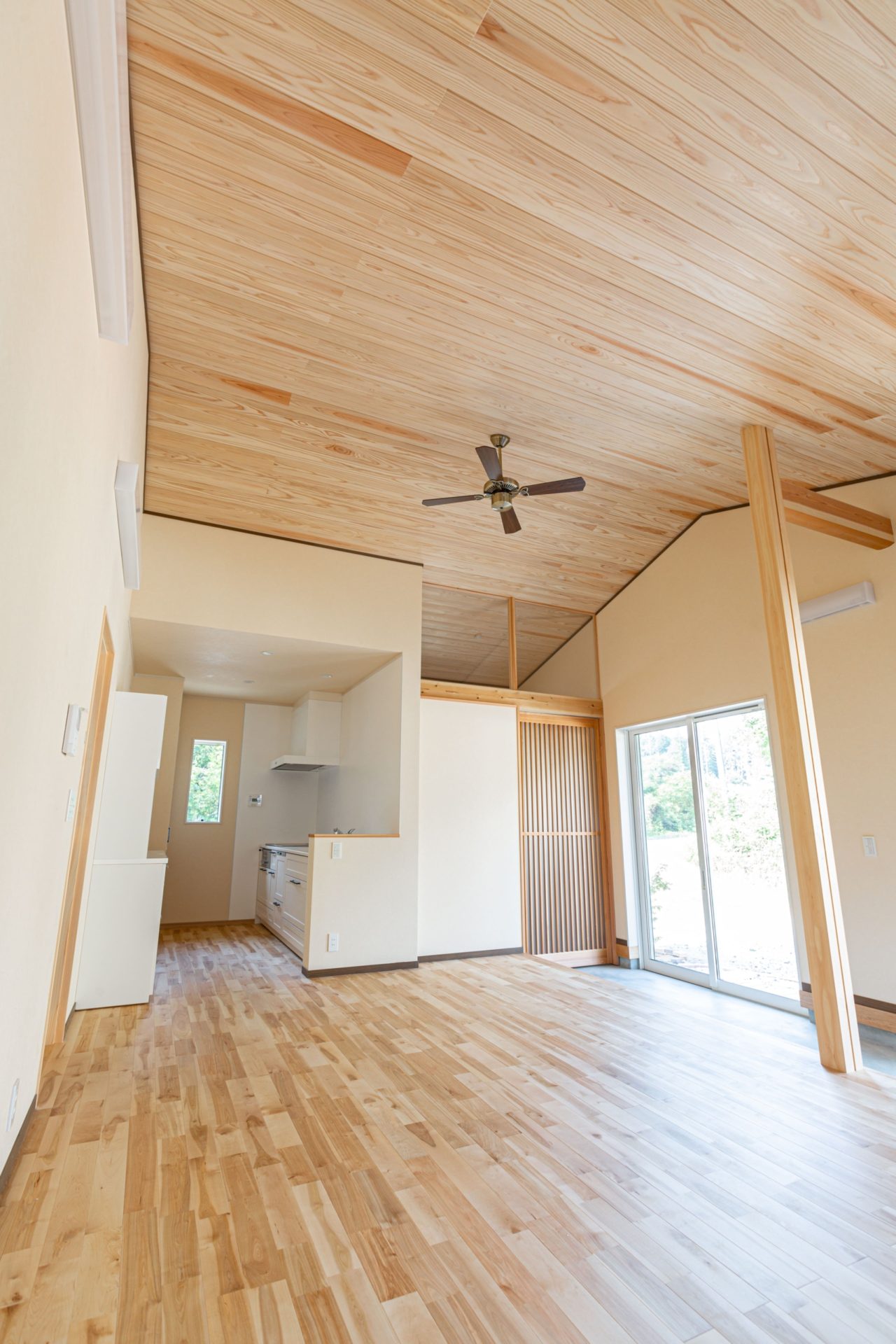 天井は杉の無垢板を使用した勾配天井!