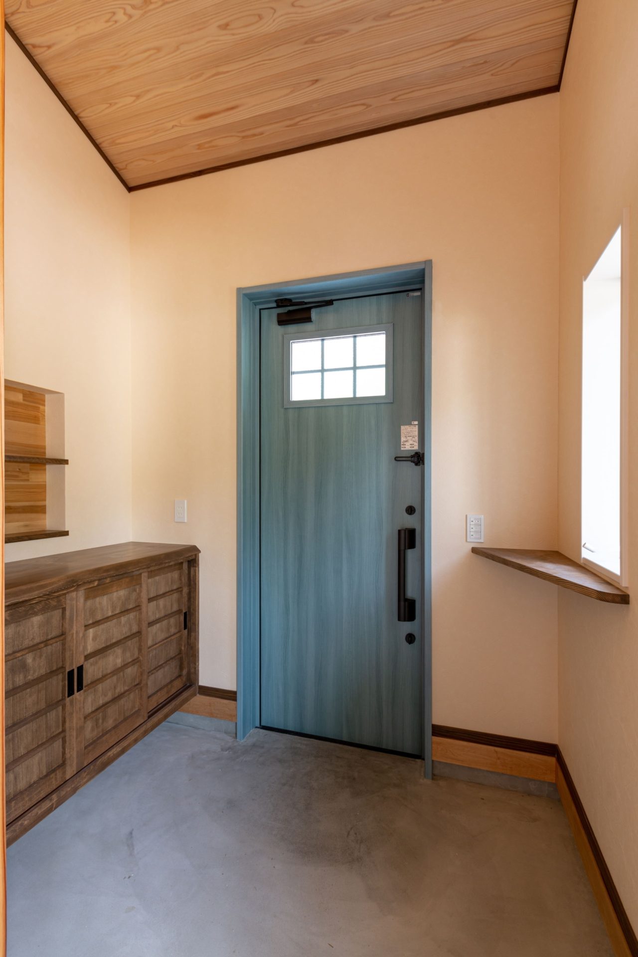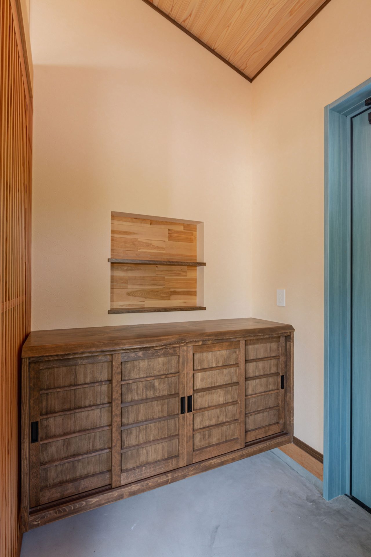 入って右手にはヒノキの無垢板で作成した下駄箱があります。