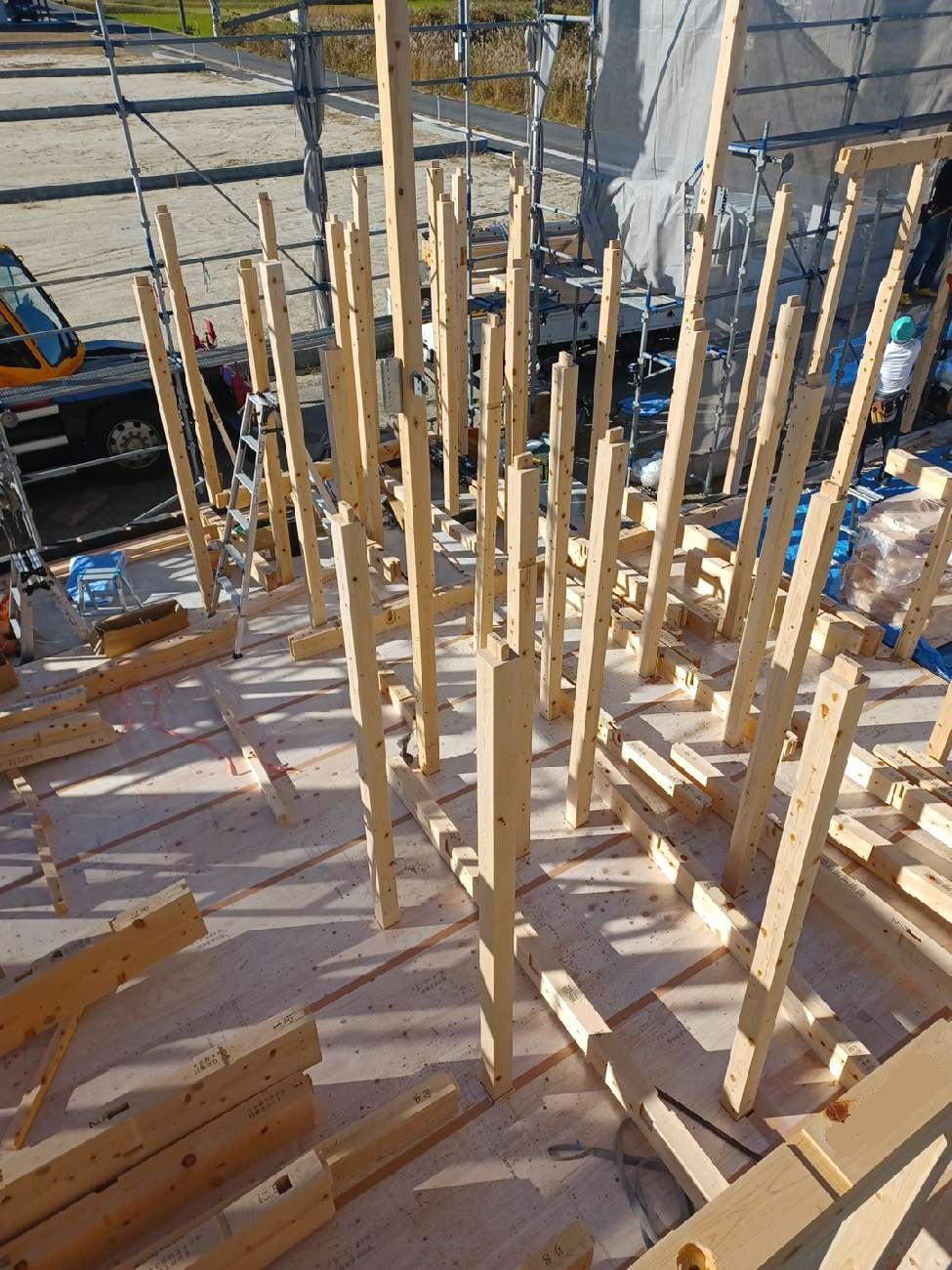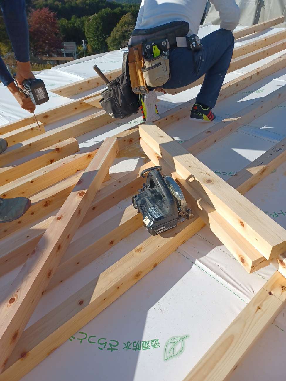 作業も順番に進み、大工さんには高い屋根の下地材の作業をしていきます。