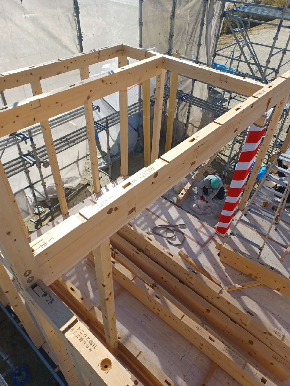 柱を建てた後は桁材を順番に組んでいきます。