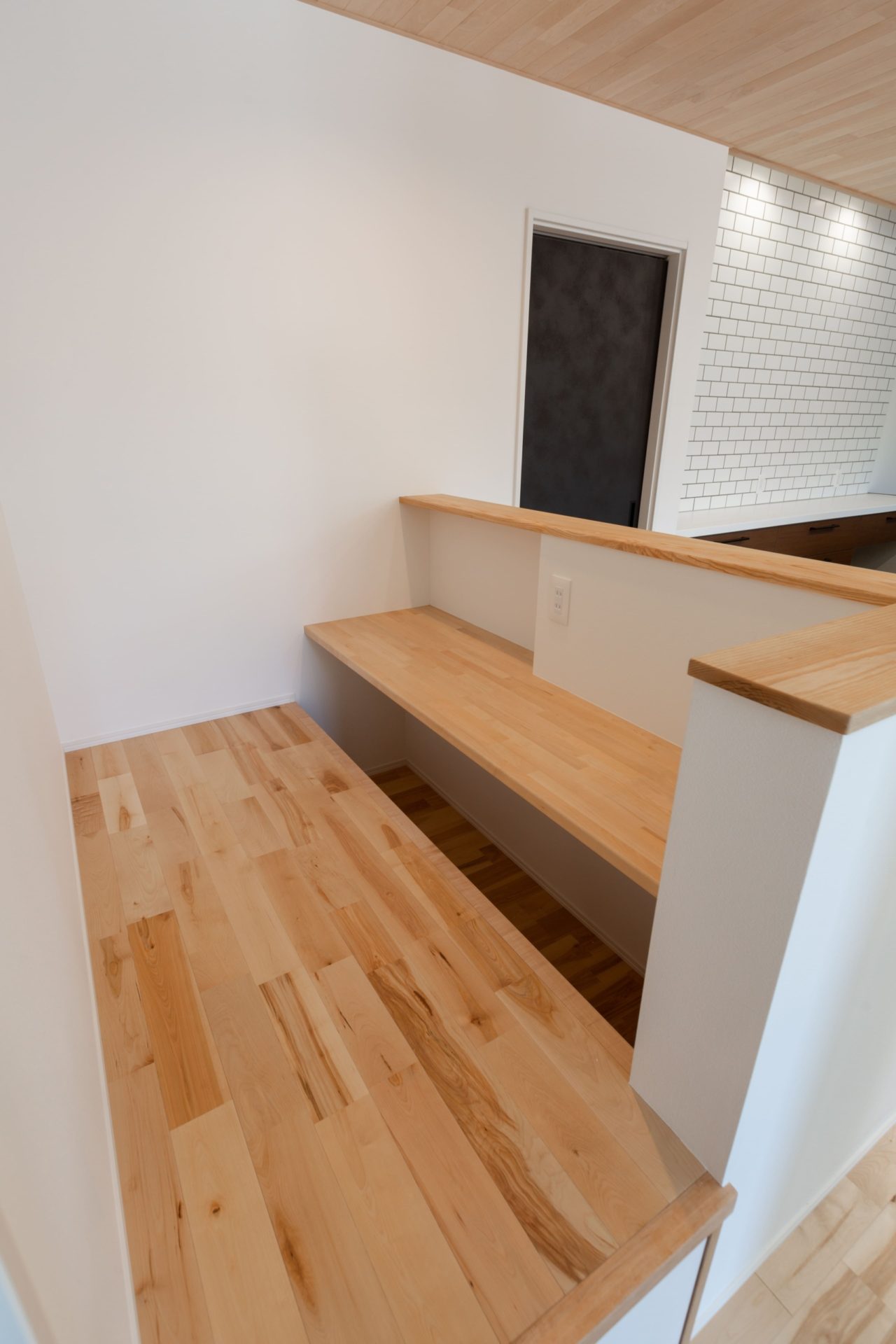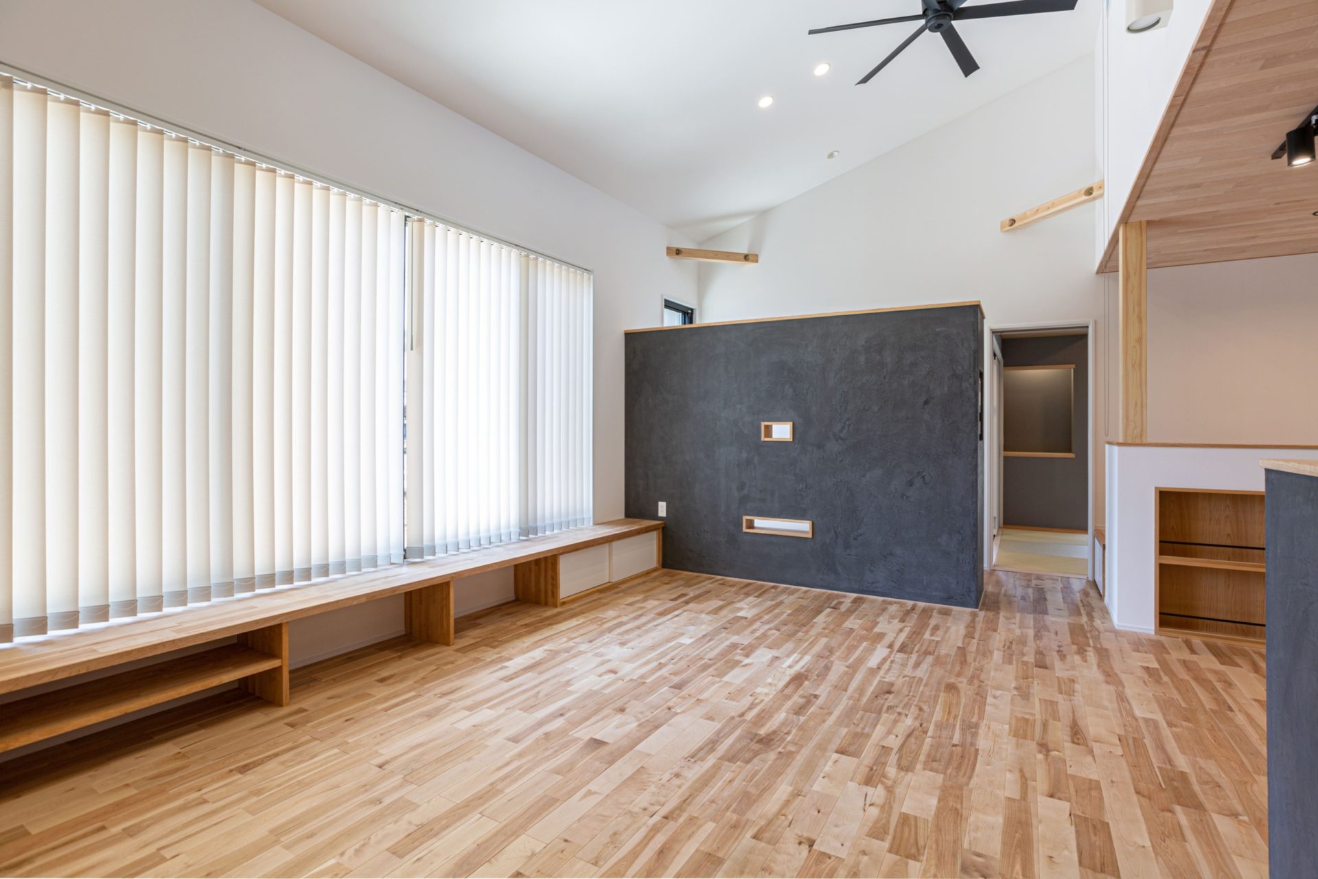 普段、掃出しの窓は床に置くように施工し、外に出られるようにします。I様邸は、床から40cm高い所にベンチとして使用できるようなつくりになっており、ベンチ上から掃出しの窓を設置し、外に出られる仕様になっています!