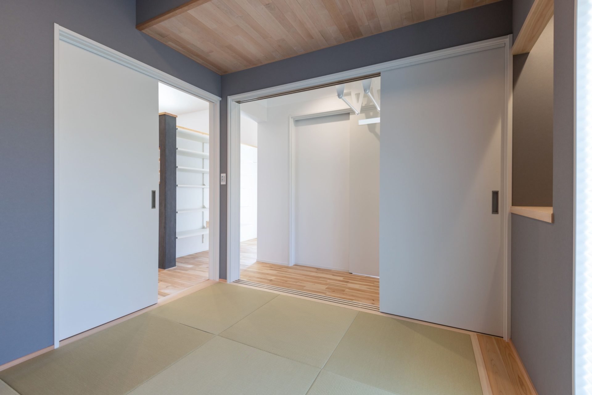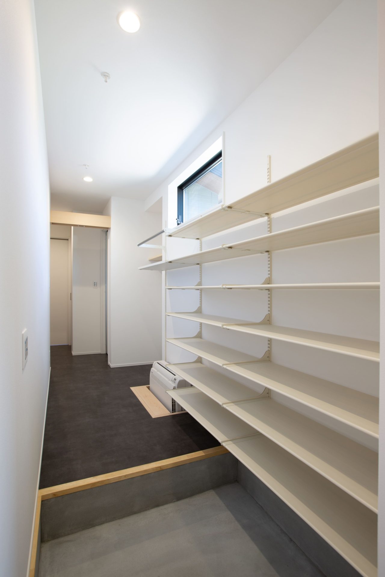 玄関は通り土間になっております!通り土間に隣接して、LDKやサニタリールームがあり、家事導線がまとまった間取りになっています。