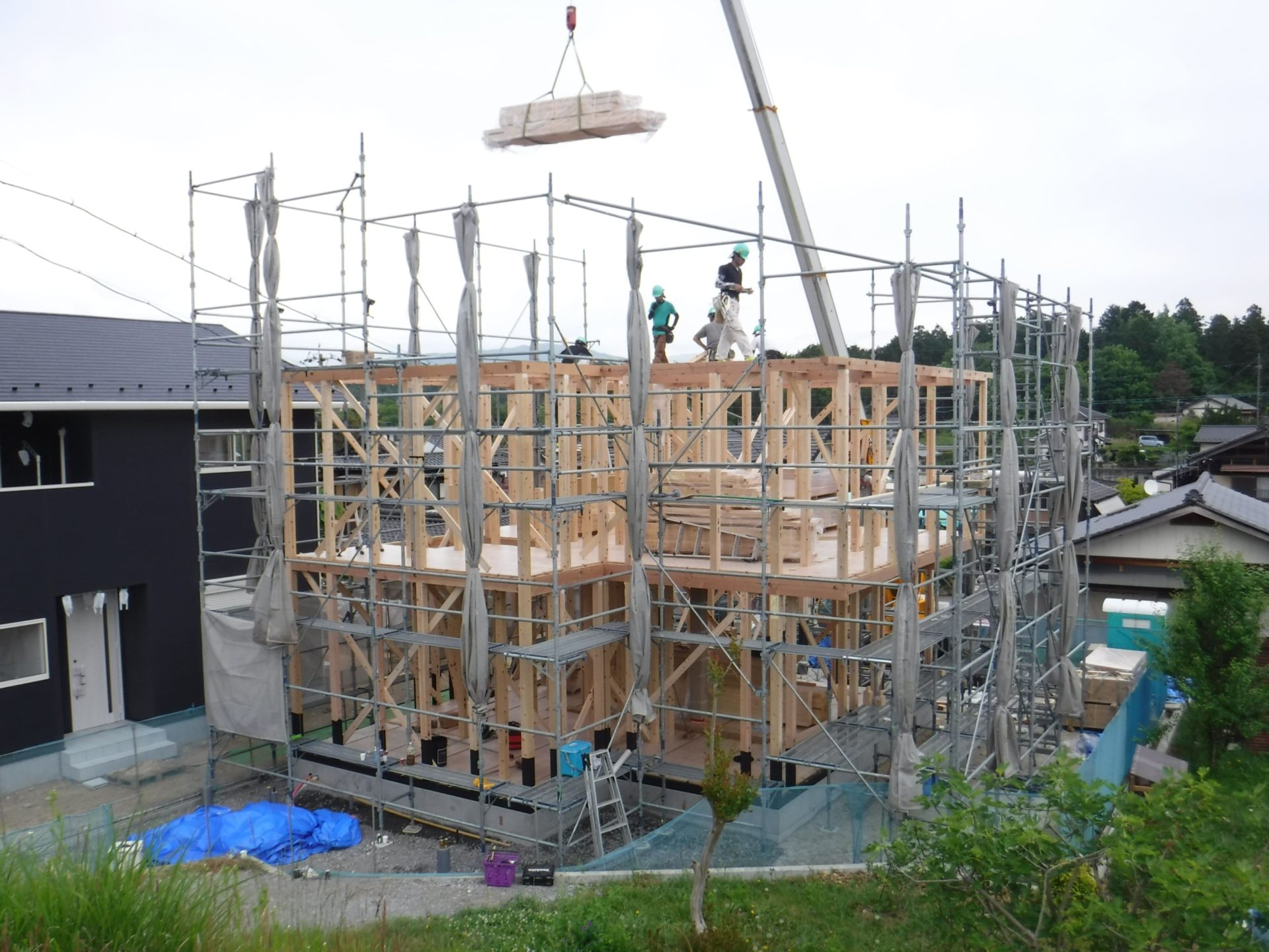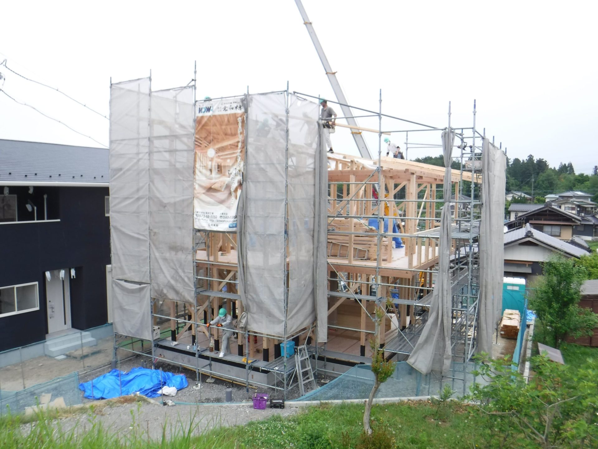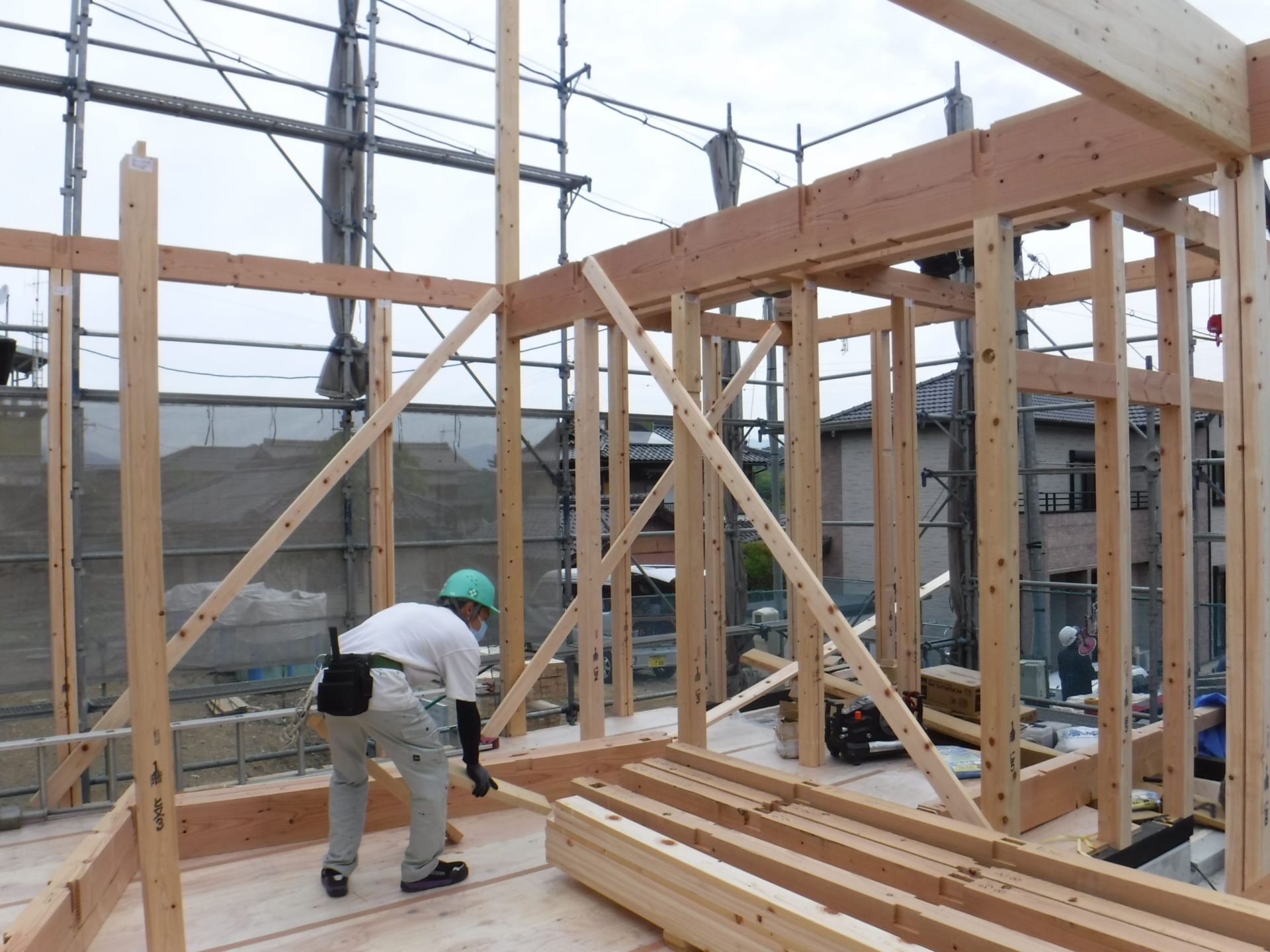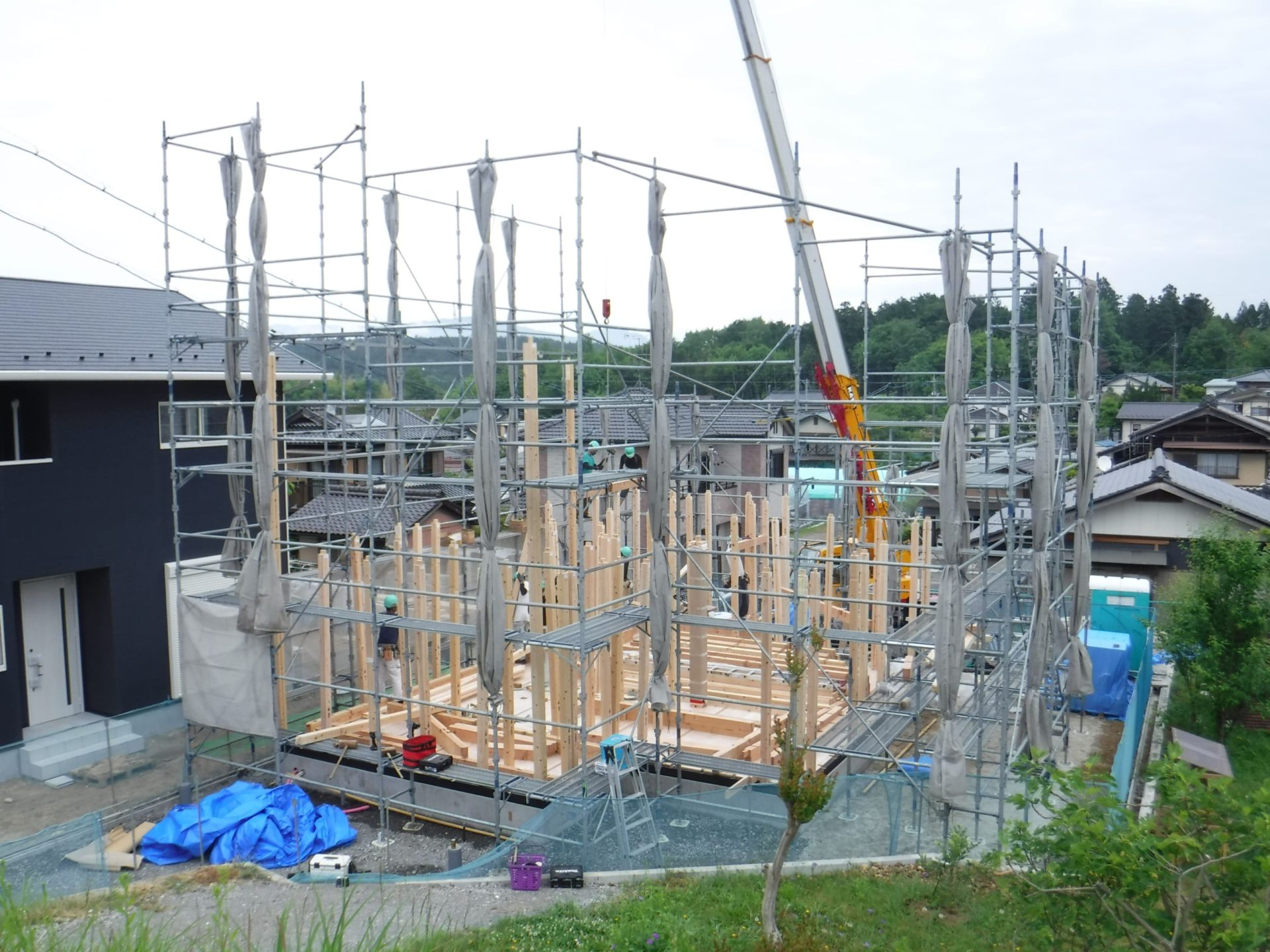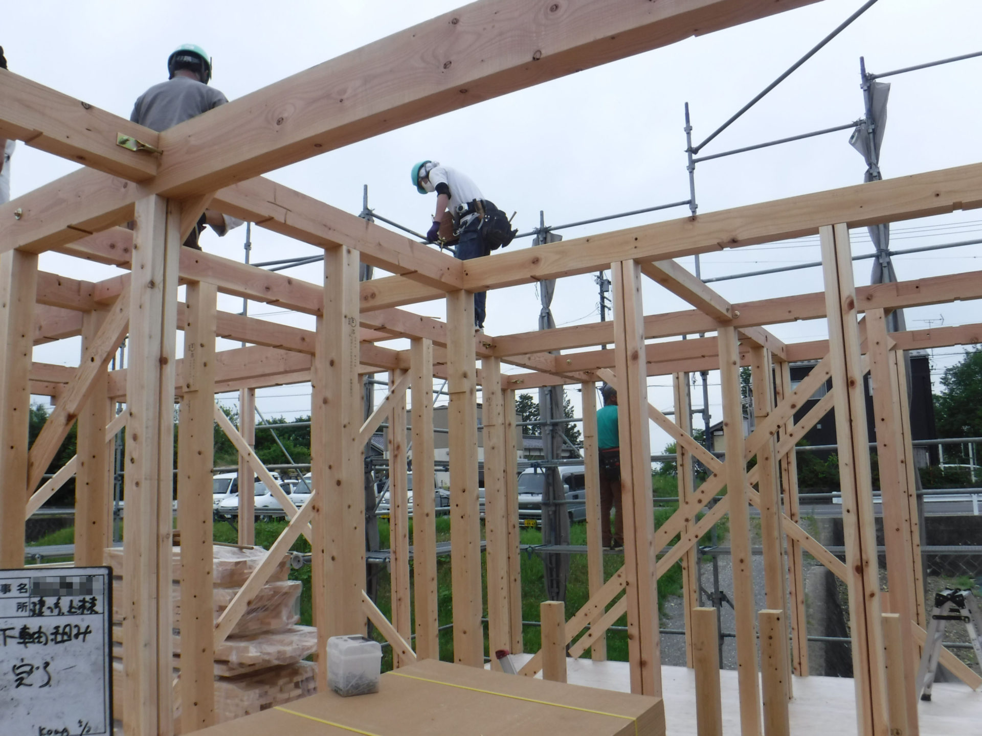 建て方初日、雨養生が出来るよう、屋根まで施工完了を目標に、作業をしていただきました。