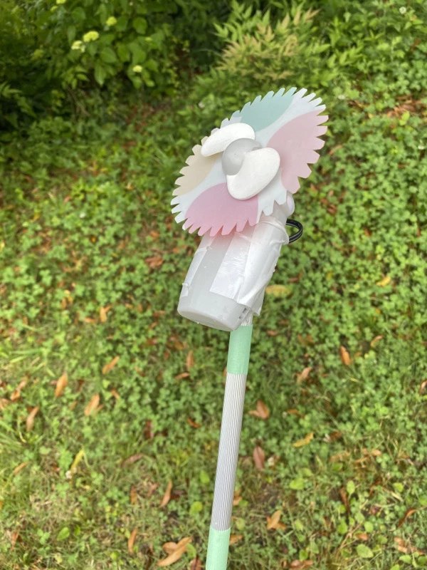 草刈り機の先端部分は、クリアファイルを丸く切り抜いてポーダブル扇風機の羽に取付けました。