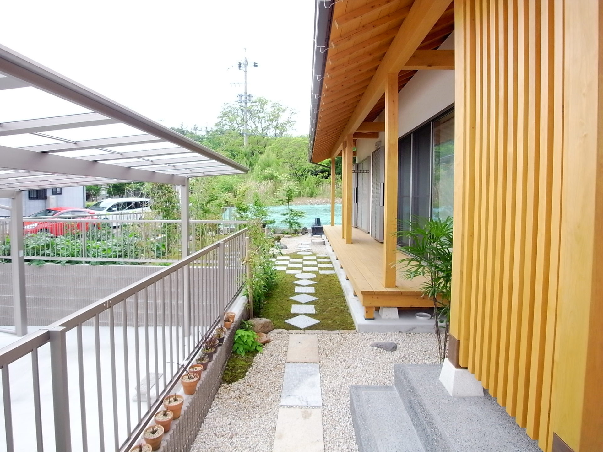アプローチ向かって左側は、エコキュート等の設備機器をあまり目立たなくするために木目調のフェンスを施工させていただきました!
