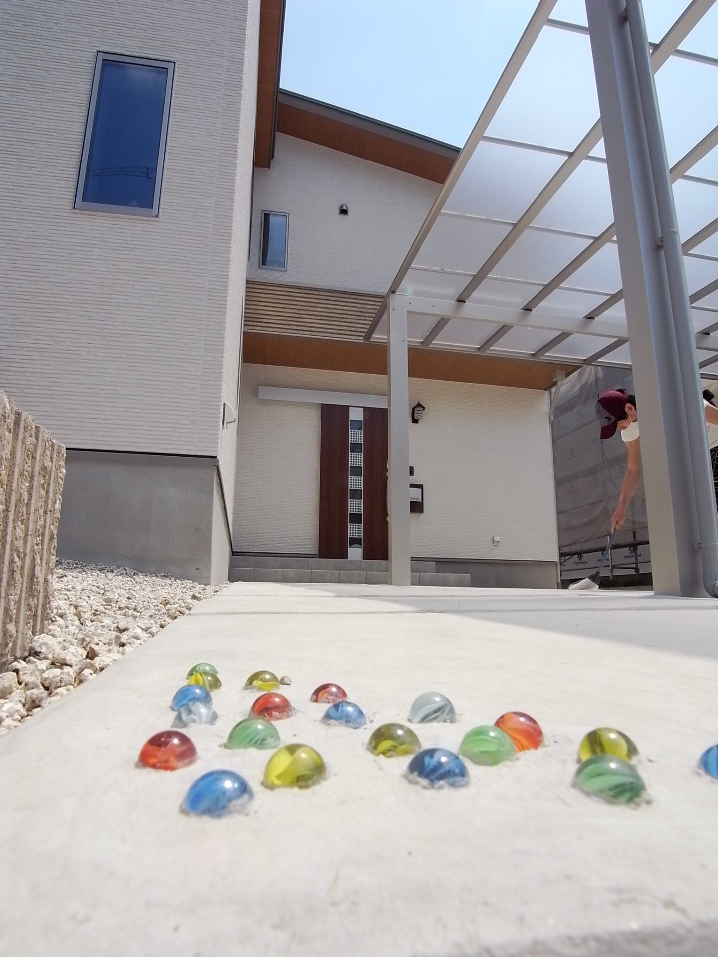 アプローチは、コンクリート仕上げになっており、金鏝で仕上げる際、H様御家族でアクセントにビー玉を入れて頂きました!