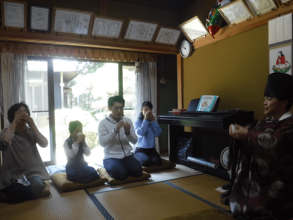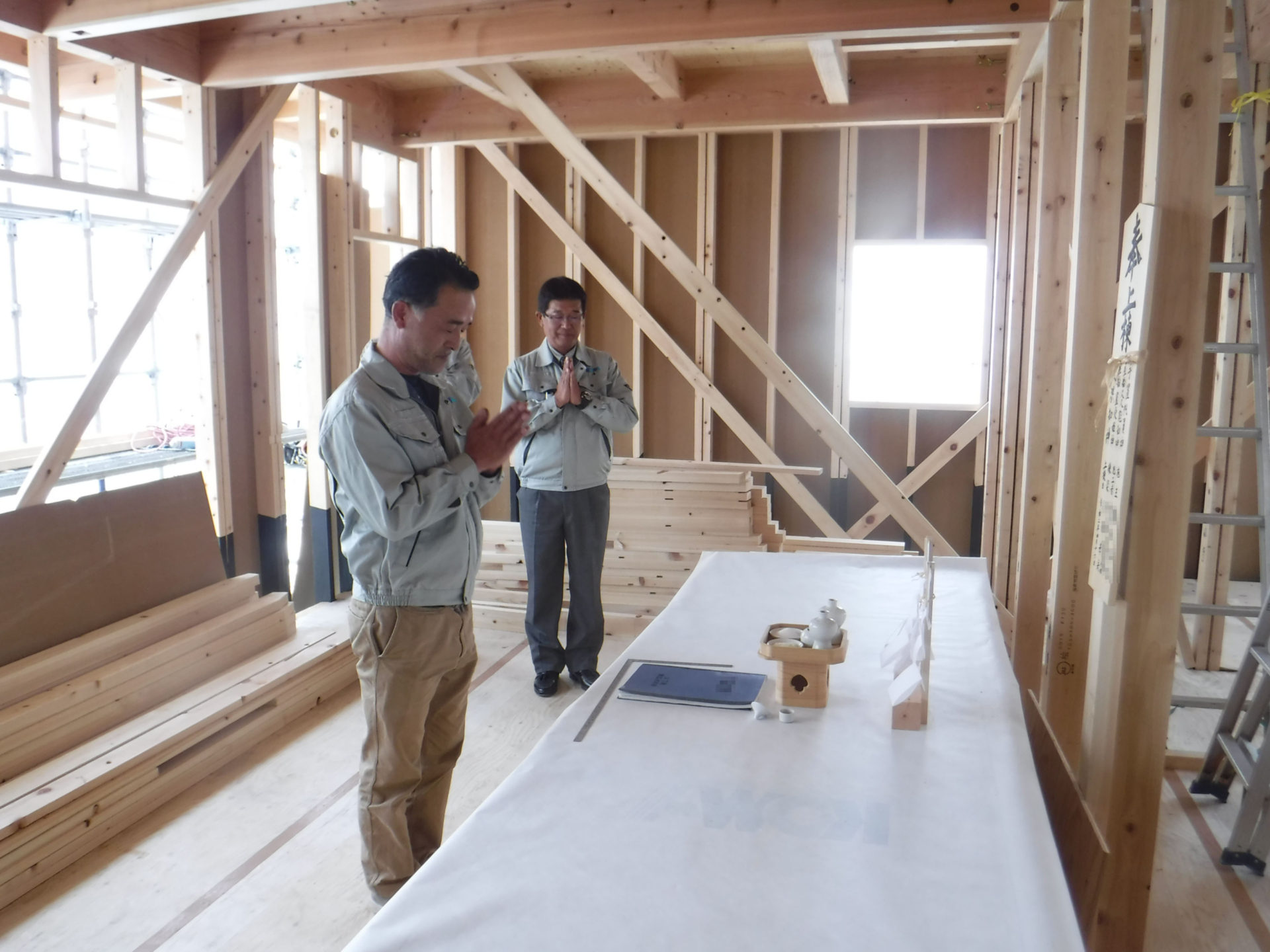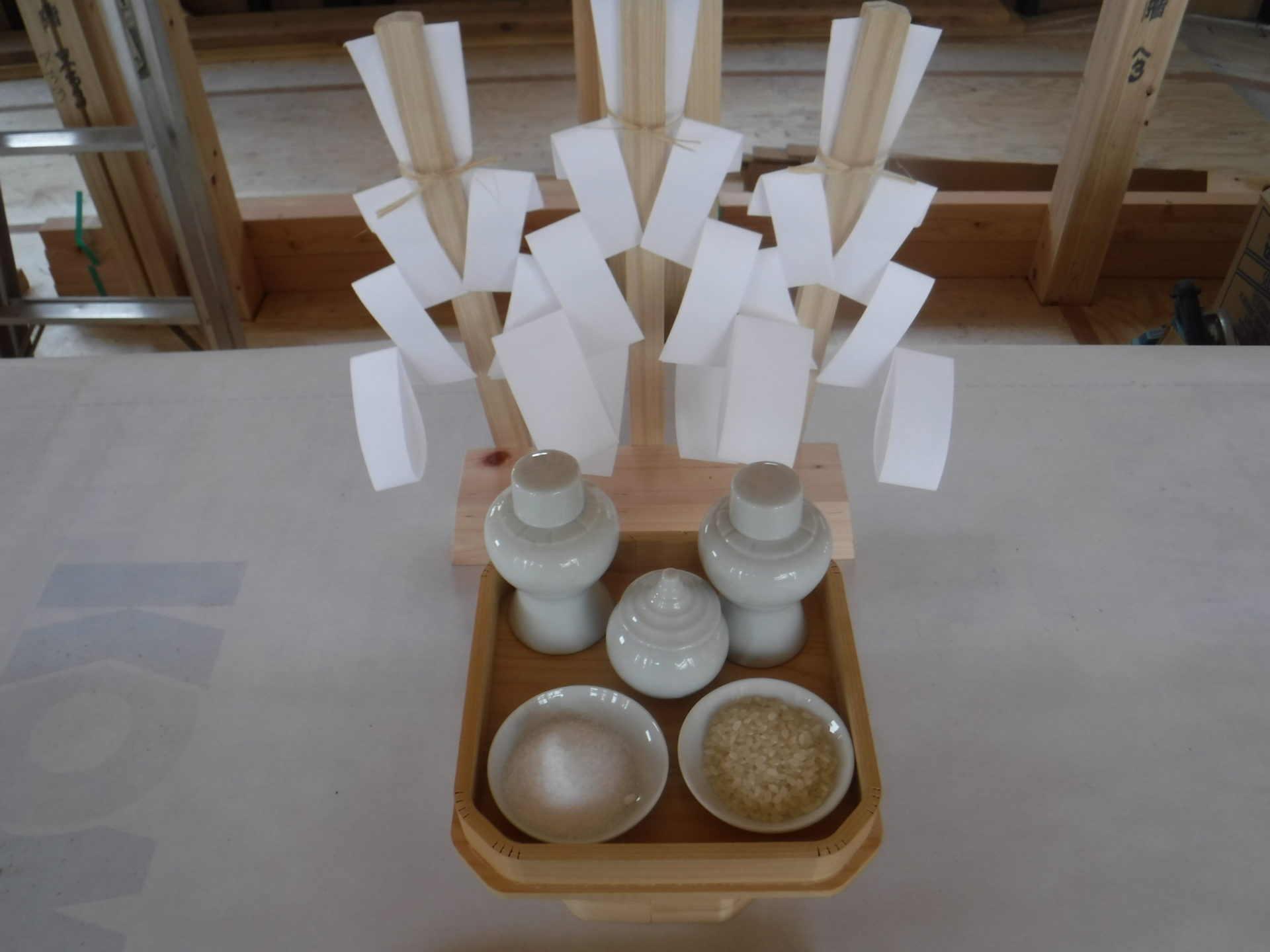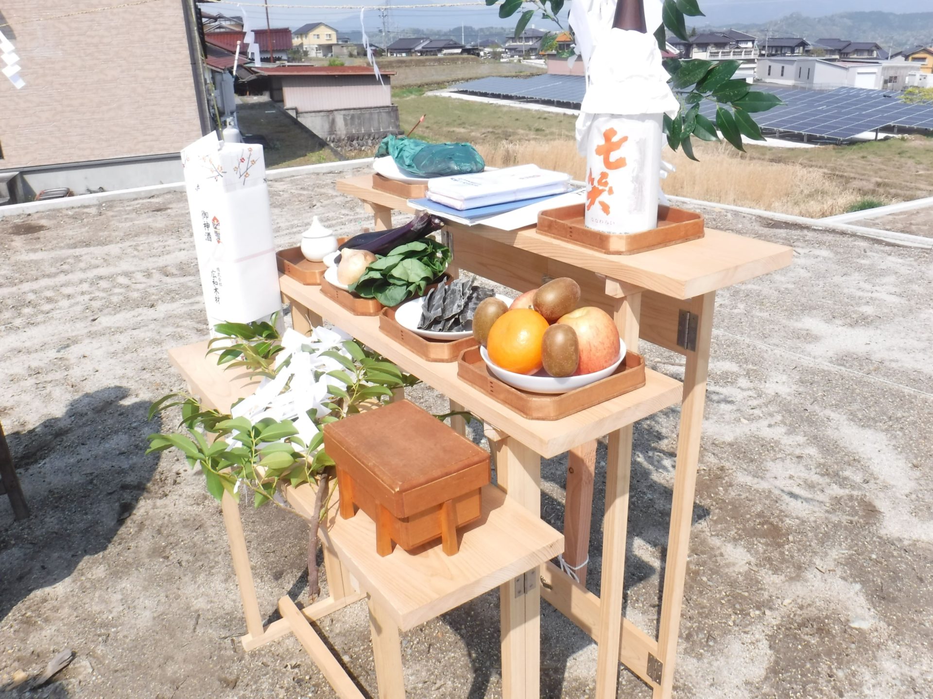 五月晴れの清々しい空気の中、恵那神社宮司の祝詞がひびき渡り、建物の神様に工事の報告し、敷地を清め、神様に感謝しこの建物を鎮めて貰い、完成までの無事故と住まいする家族の繁栄を祈願して頂きました。