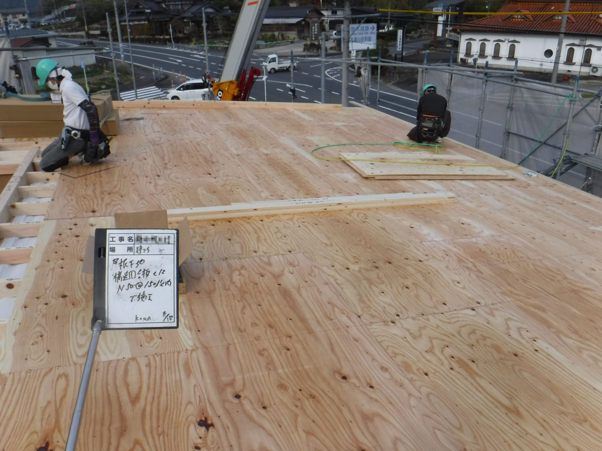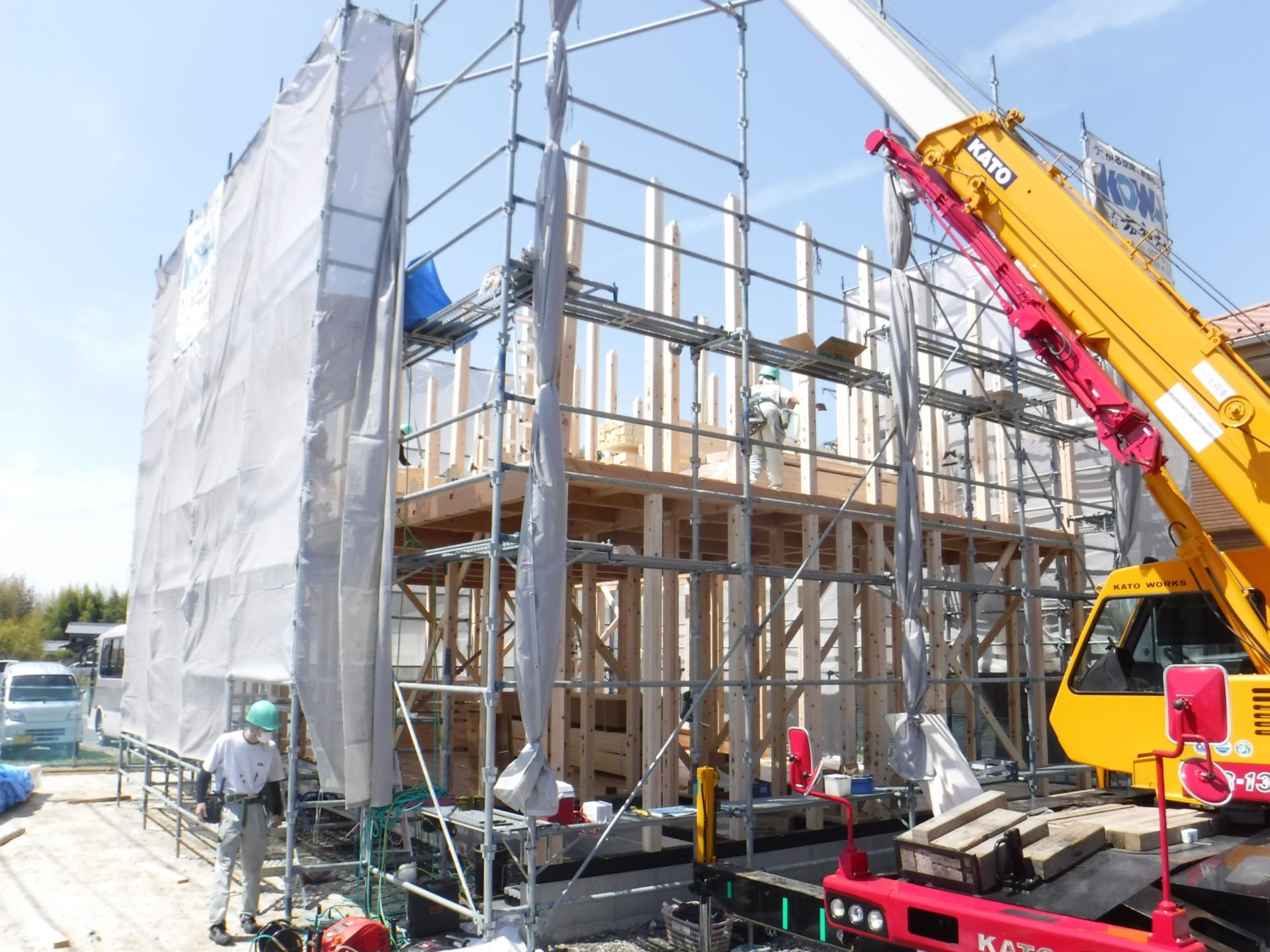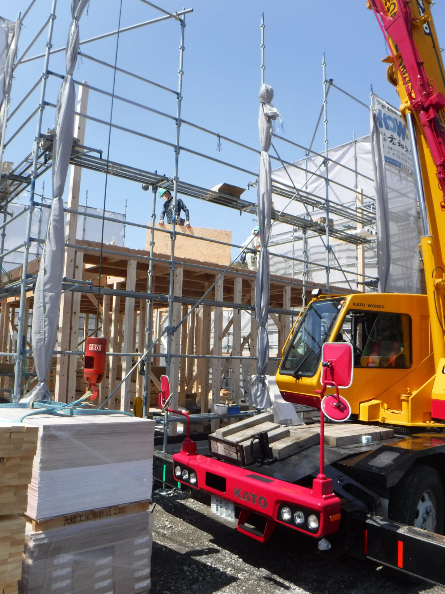 建て方初日、屋根まで施工完了を目標に、作業をしていただきました。