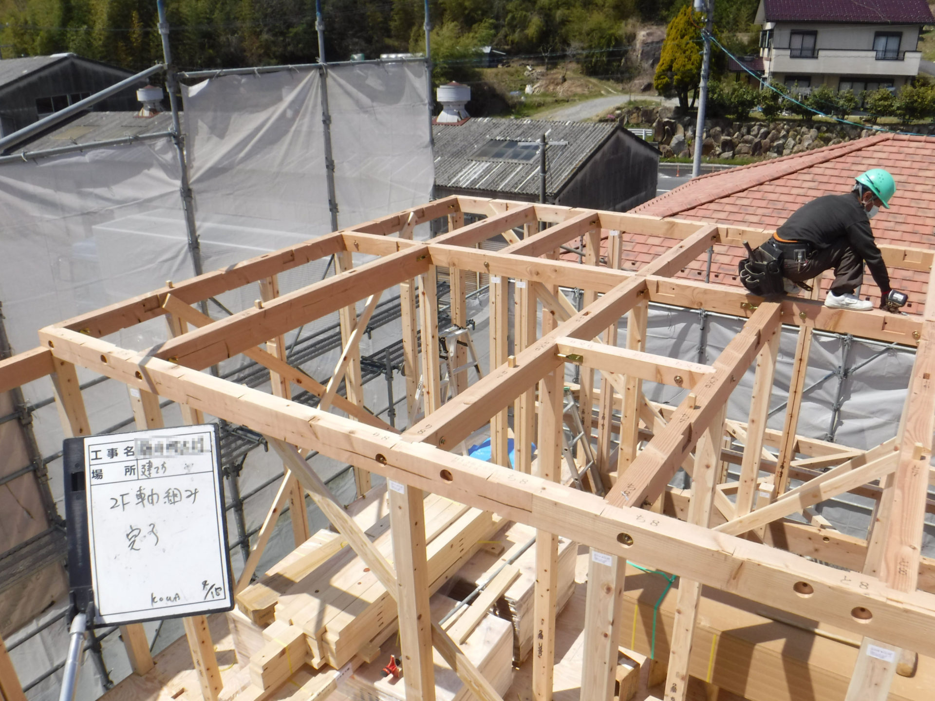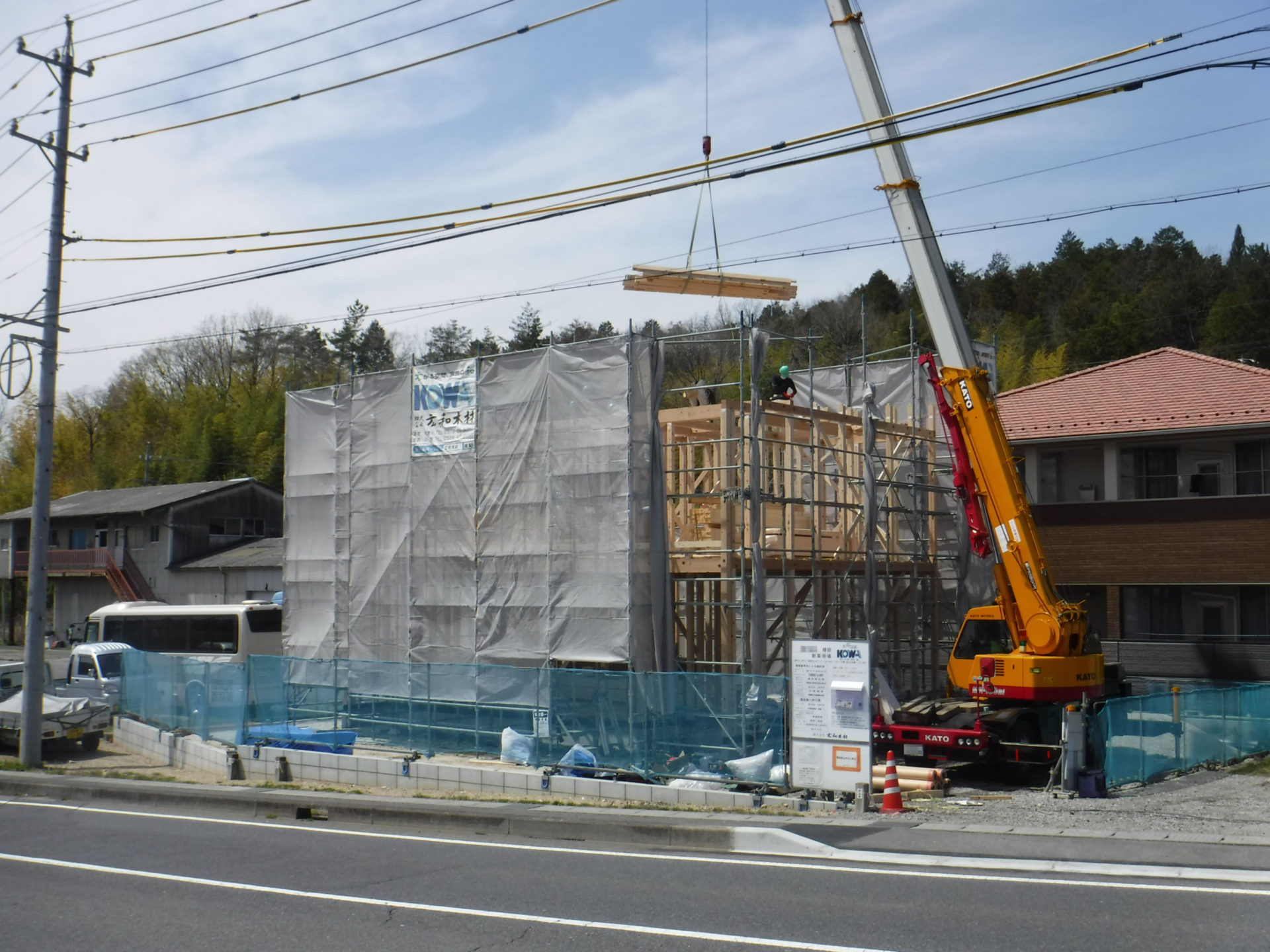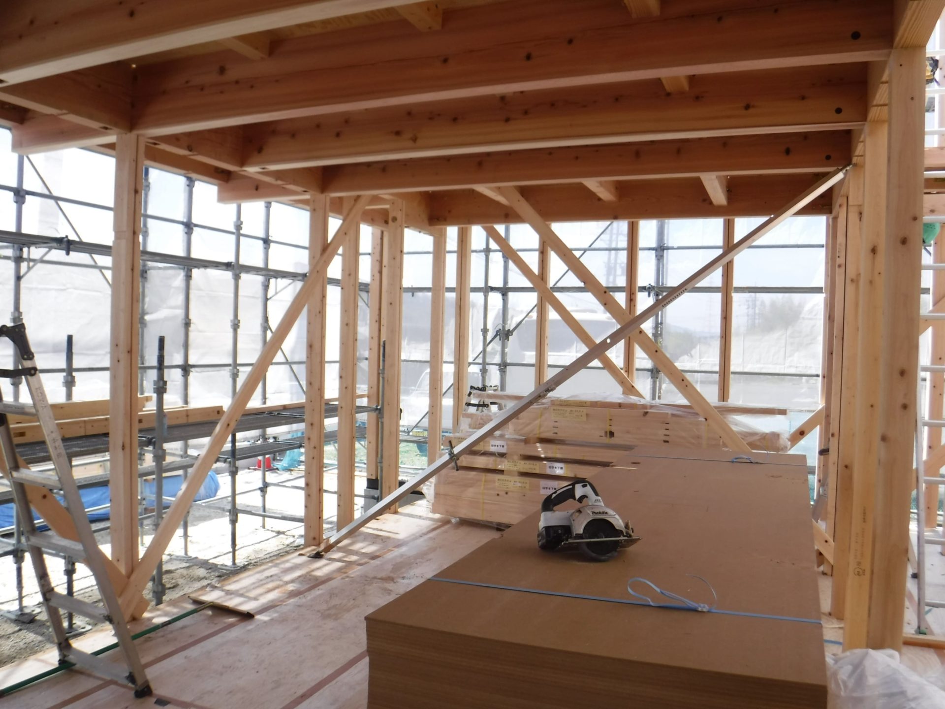 建て方初日、屋根まで施工完了を目標に、作業をしていただきました。