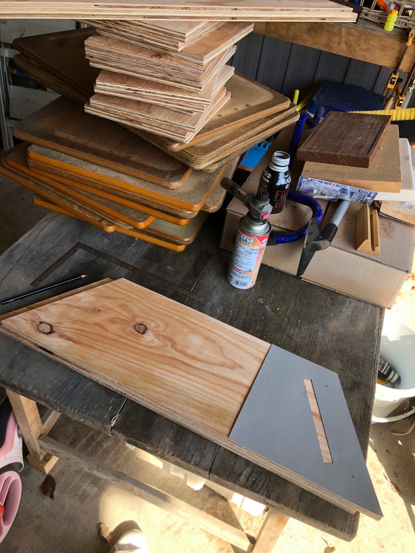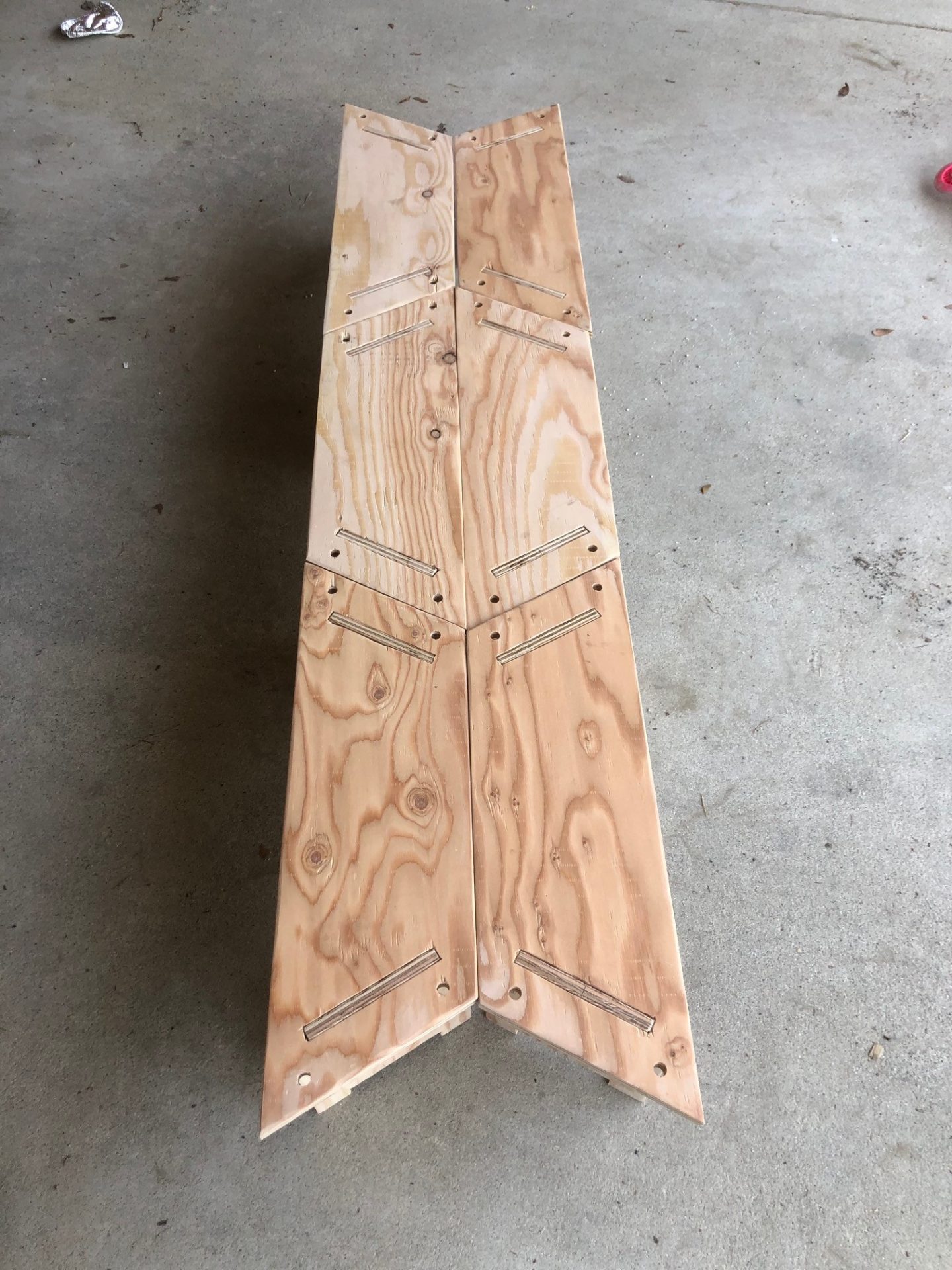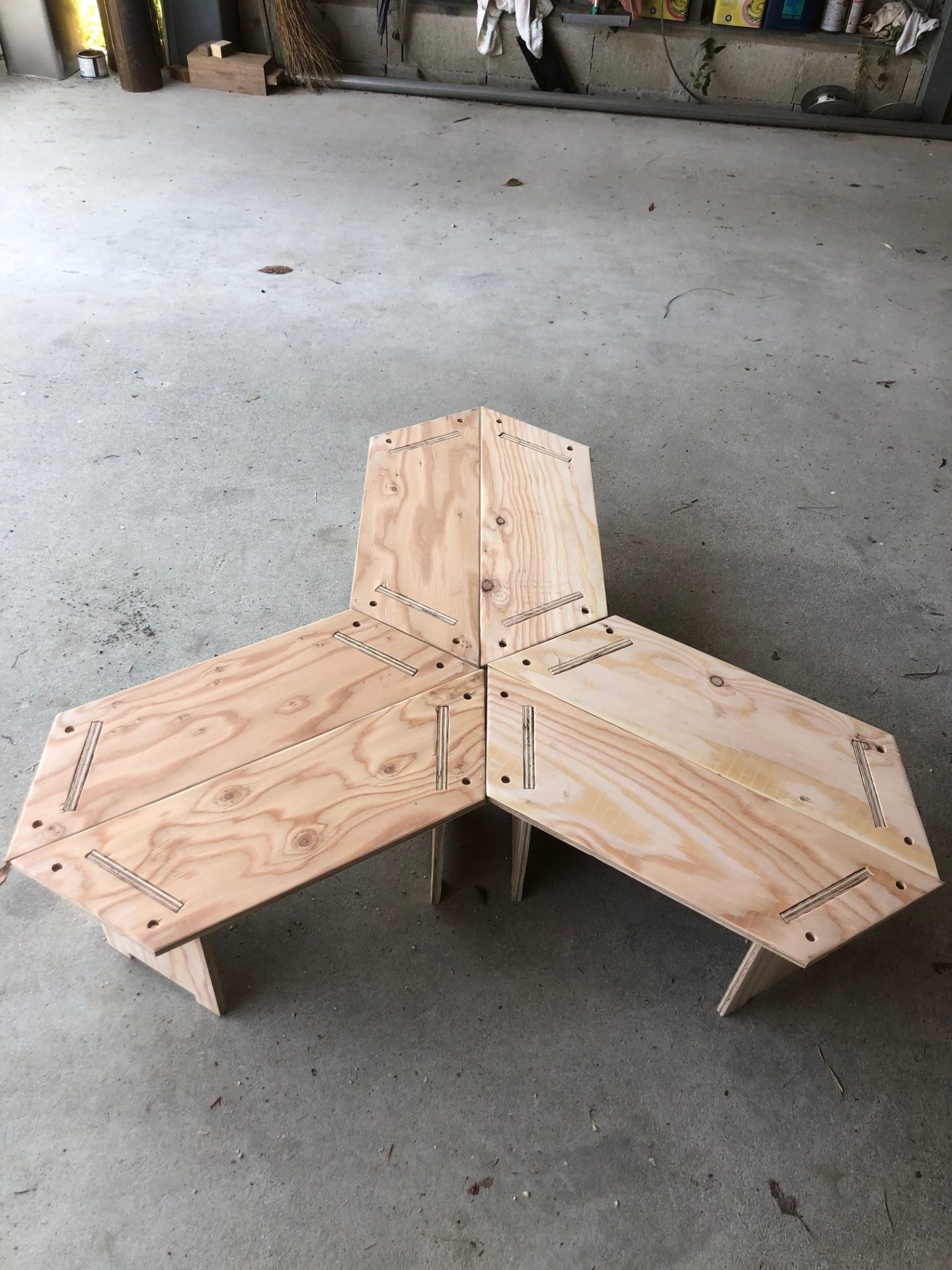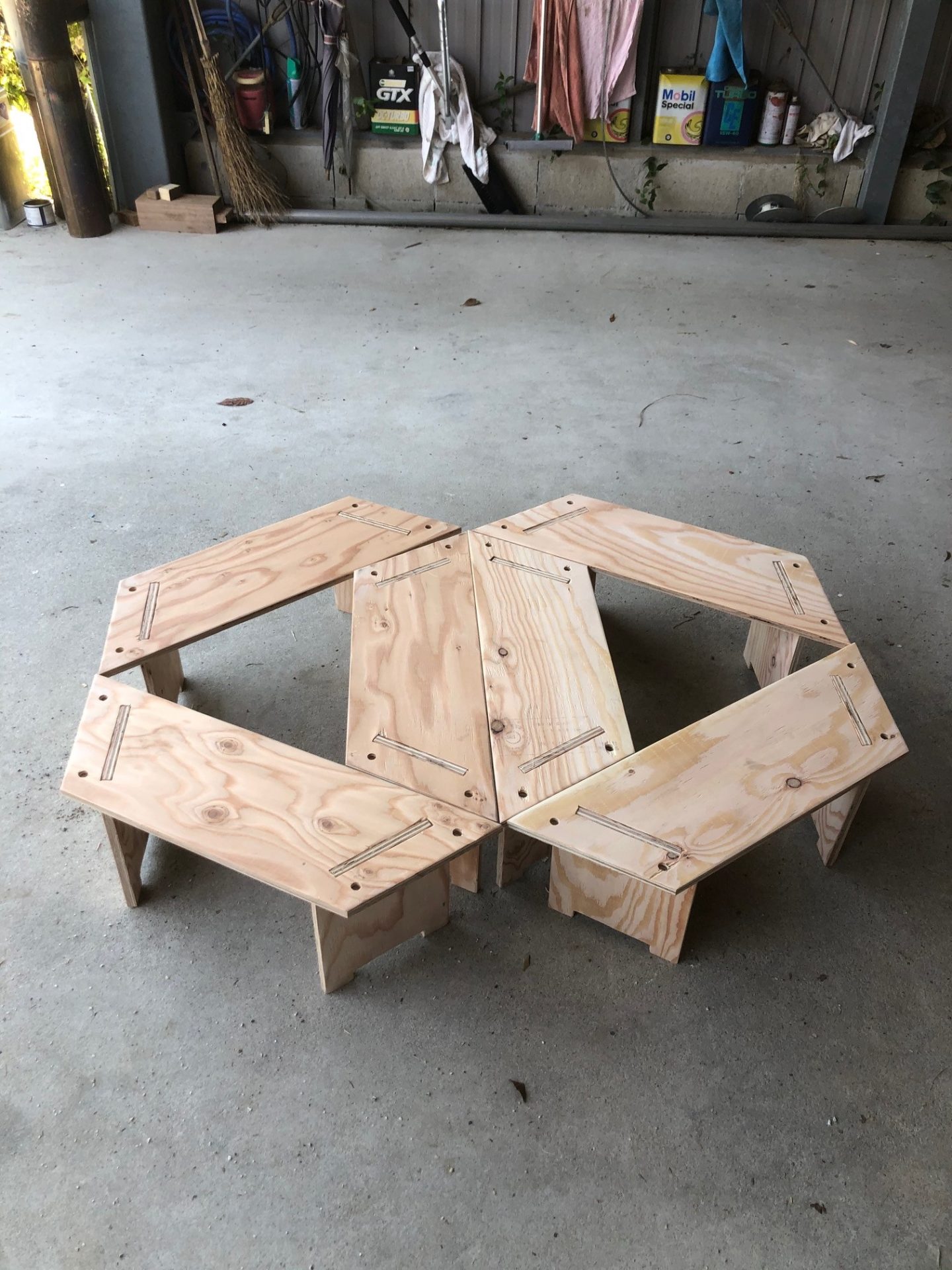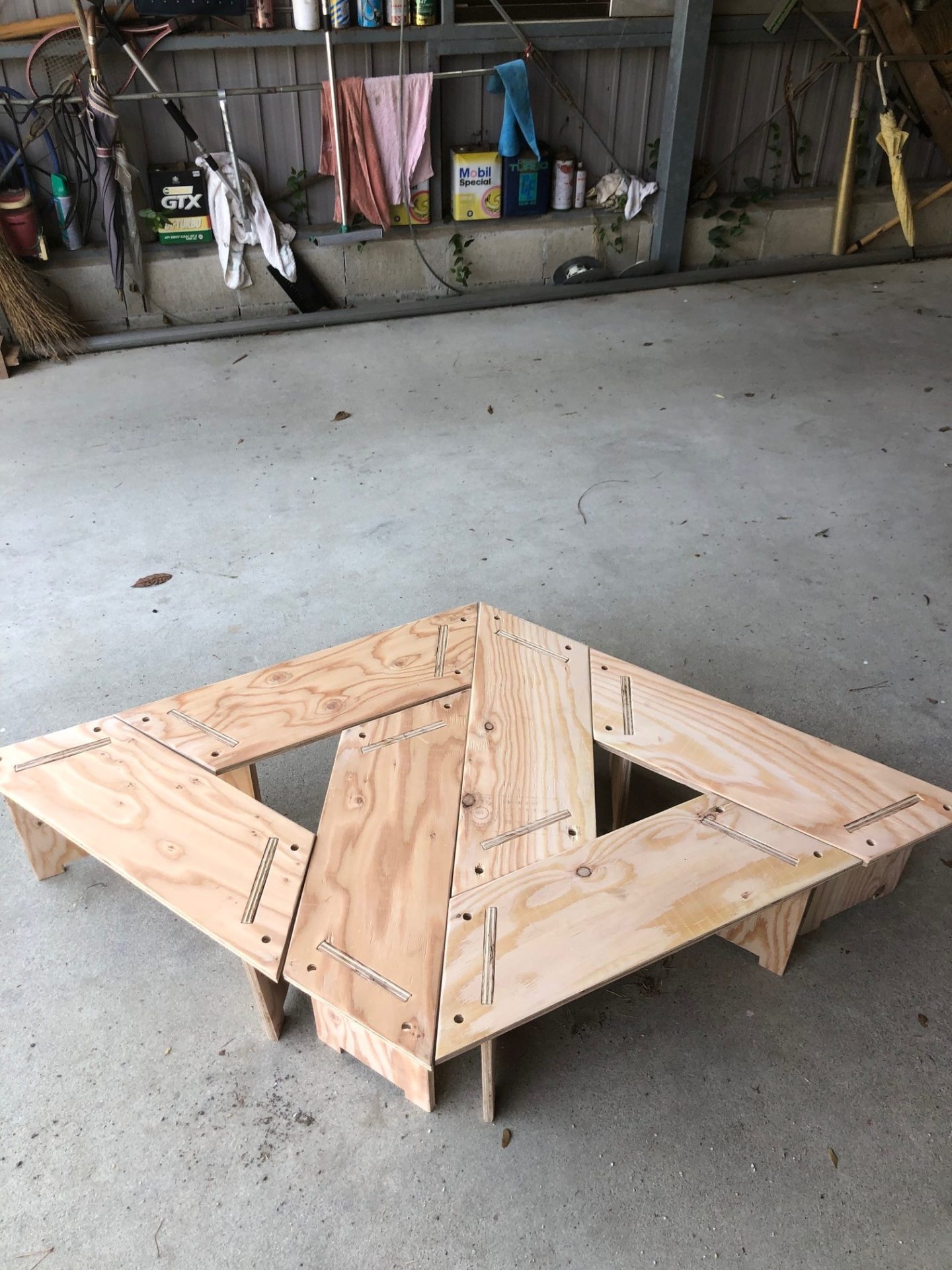 寸法は、台形型の底辺が70cmで60°の角度でカット、幅は21cmが6枚。足材は高さ25cm、幅21cmで12枚を使用し作成しました!