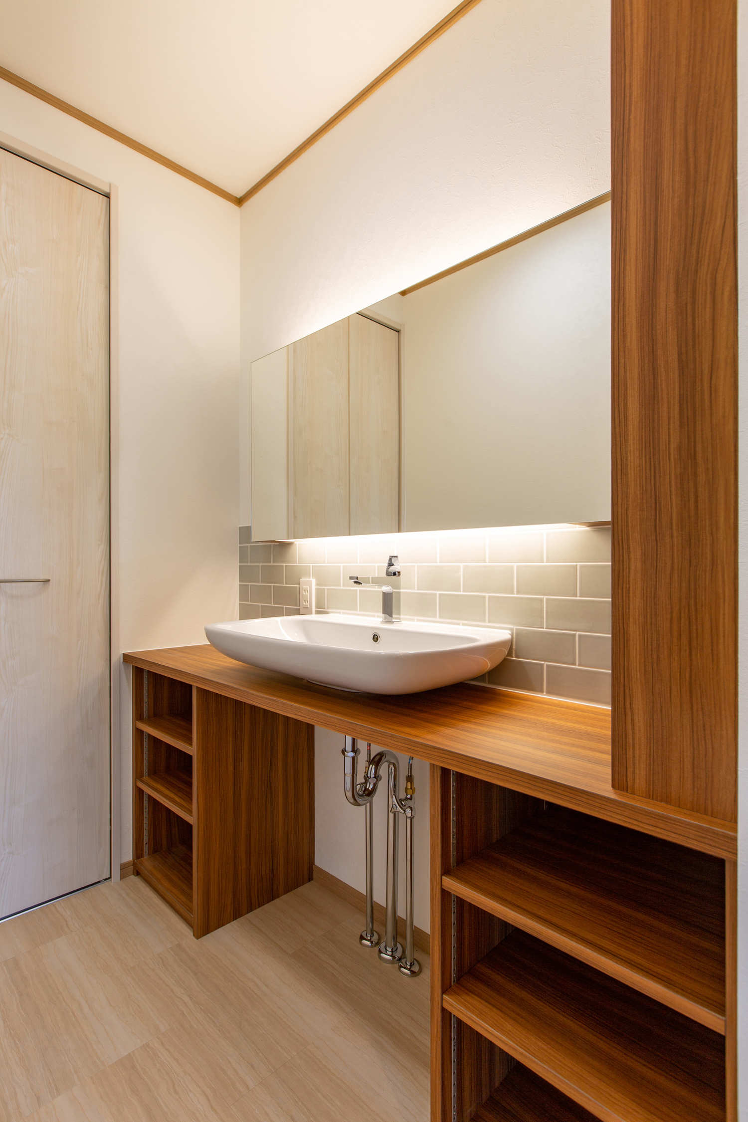 トイレは、広めのゆったりした空間になっており、楢のカウンターを使用した和の雰囲気になっております。
