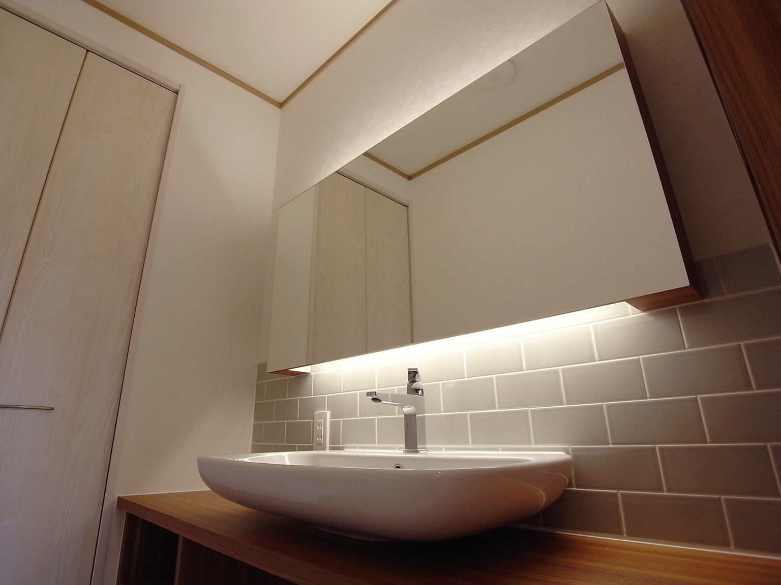 洗面台は、既製品ではなく、作製になっております。収納方法や間接照明完備のミラーなど、こだわりが詰まった仕様になっております!