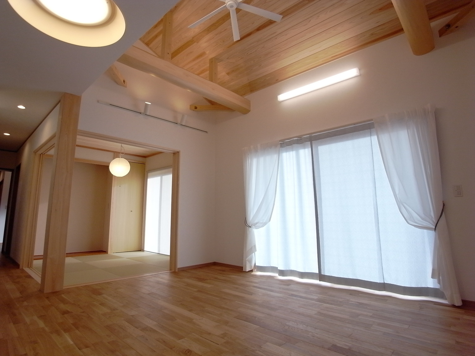リビング・ダイニングに入ると、天井には桧の丸太梁と杉板がお出迎えをしてくれます!
