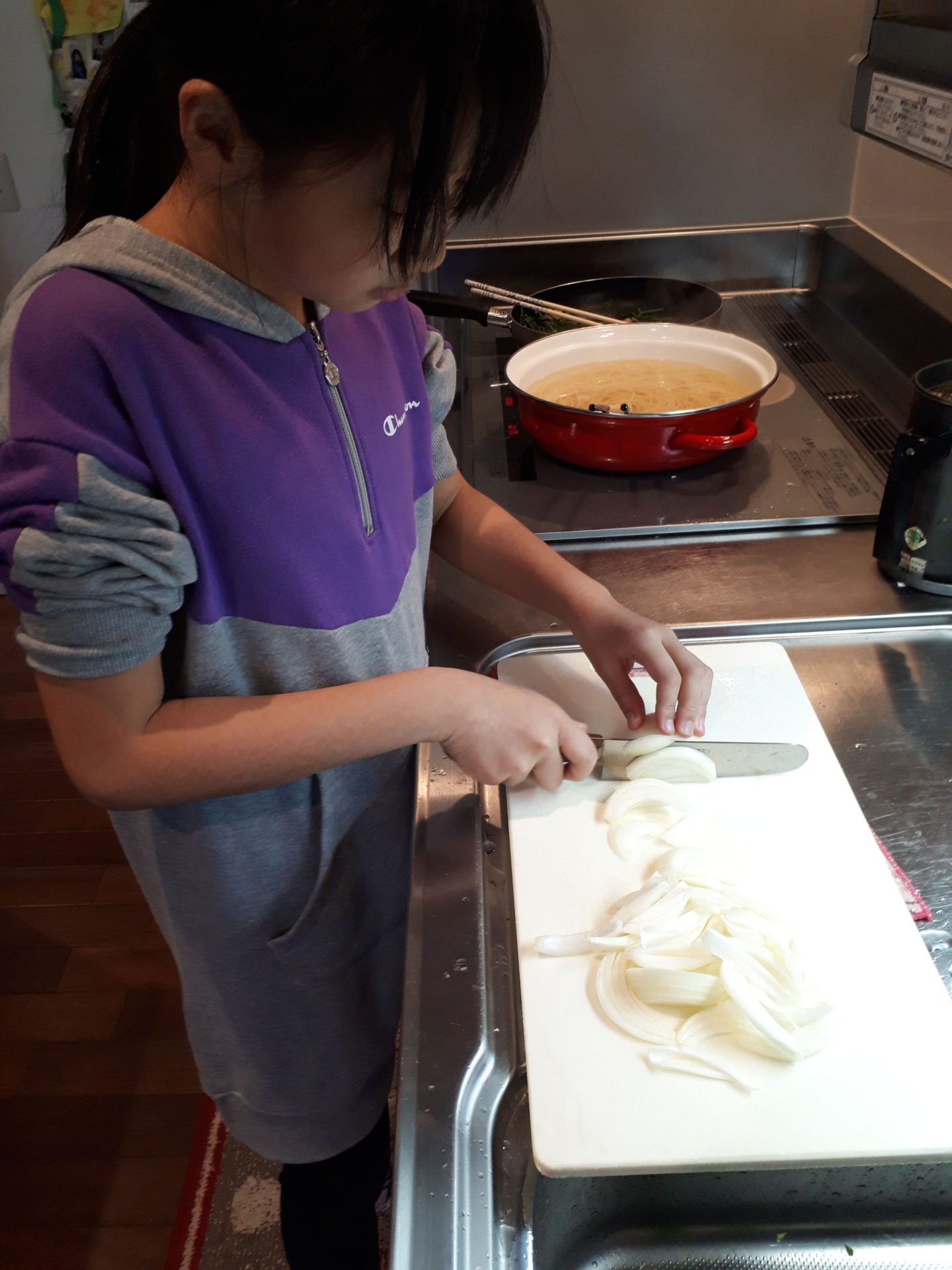 子供たちのマイ包丁を使い、野菜を切り、ベーコン、ウインナーを切り、