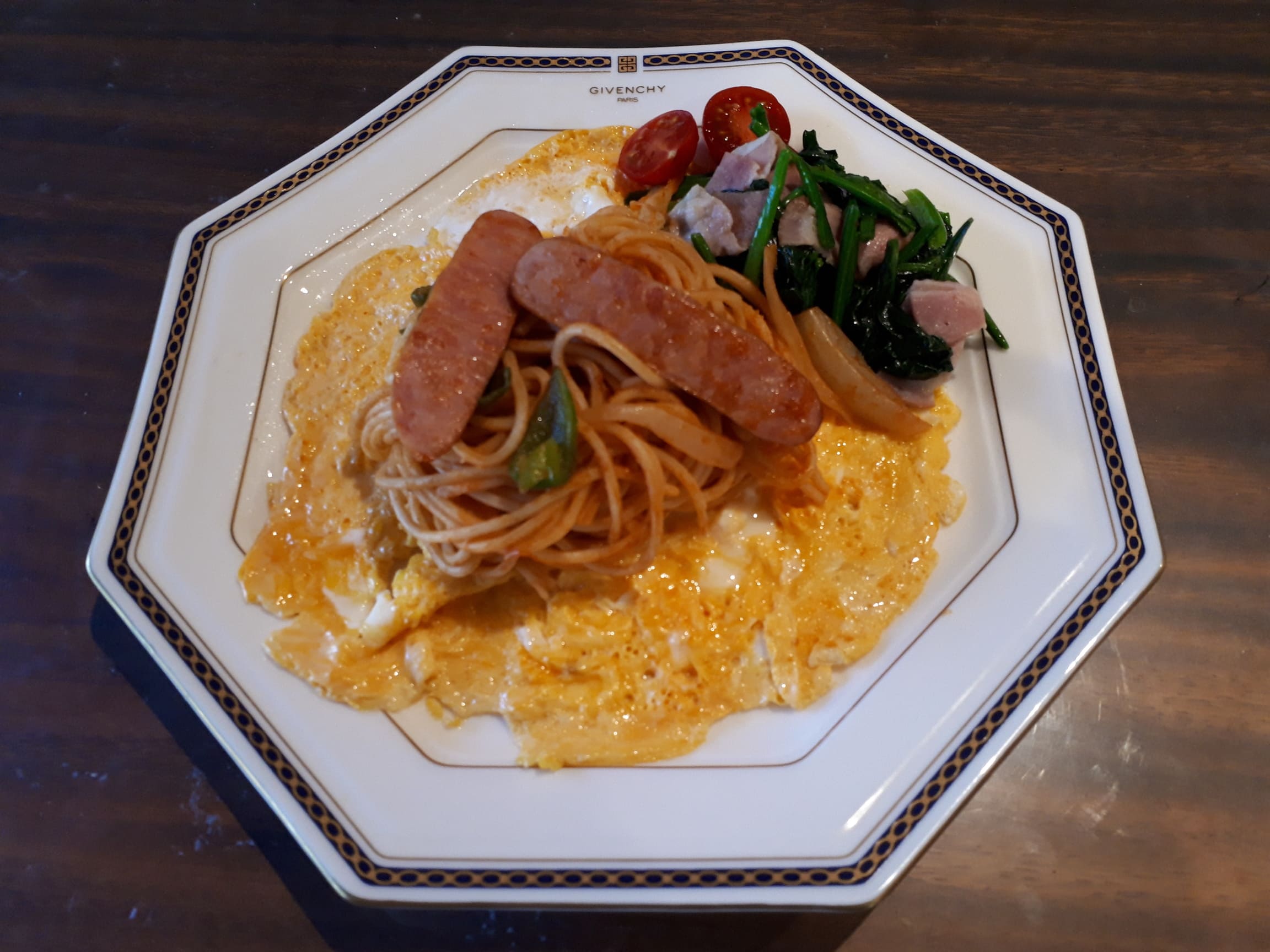 メニューはナポリタンスパゲティとほうれん草とベーコンのソテーです。