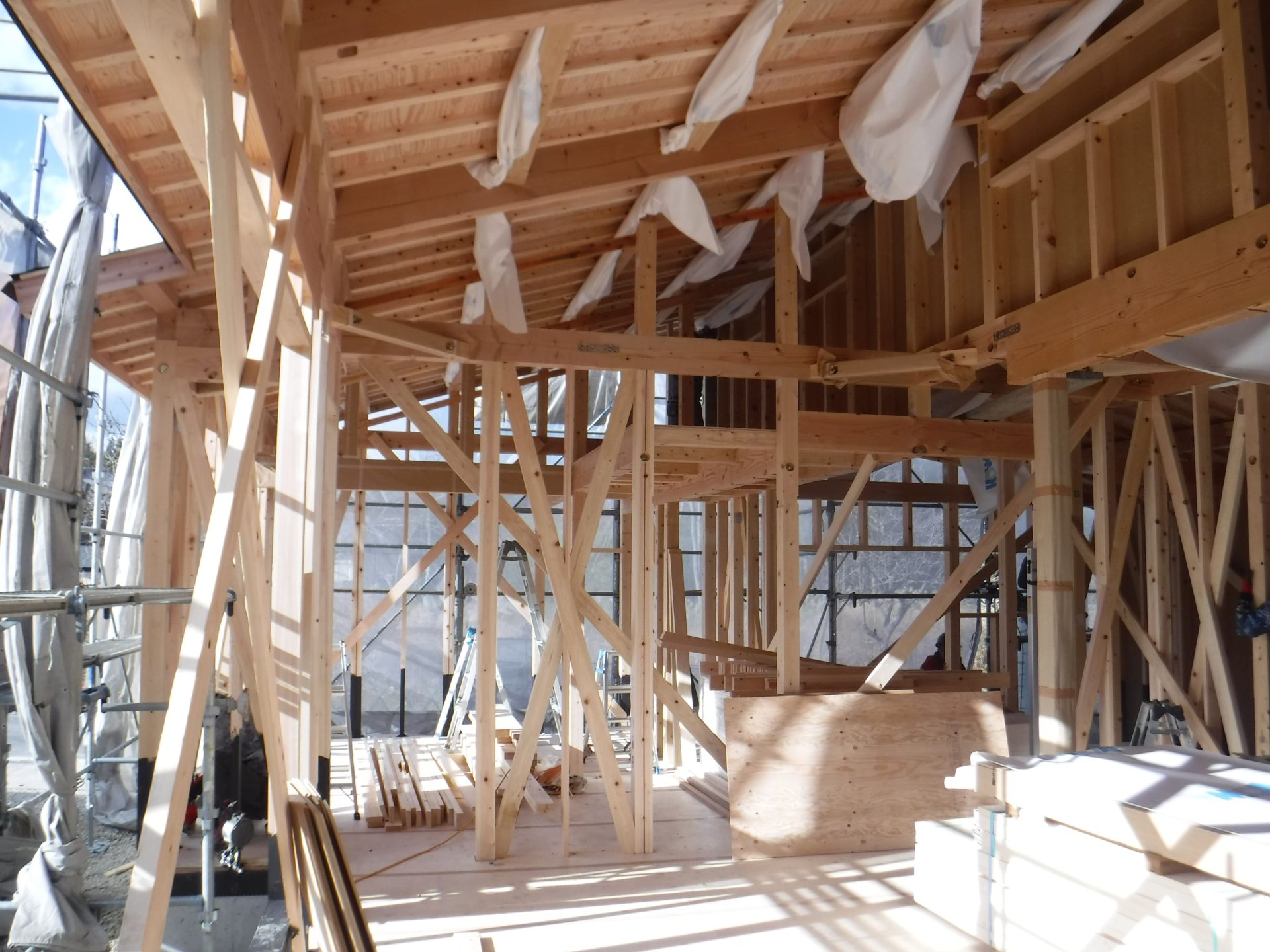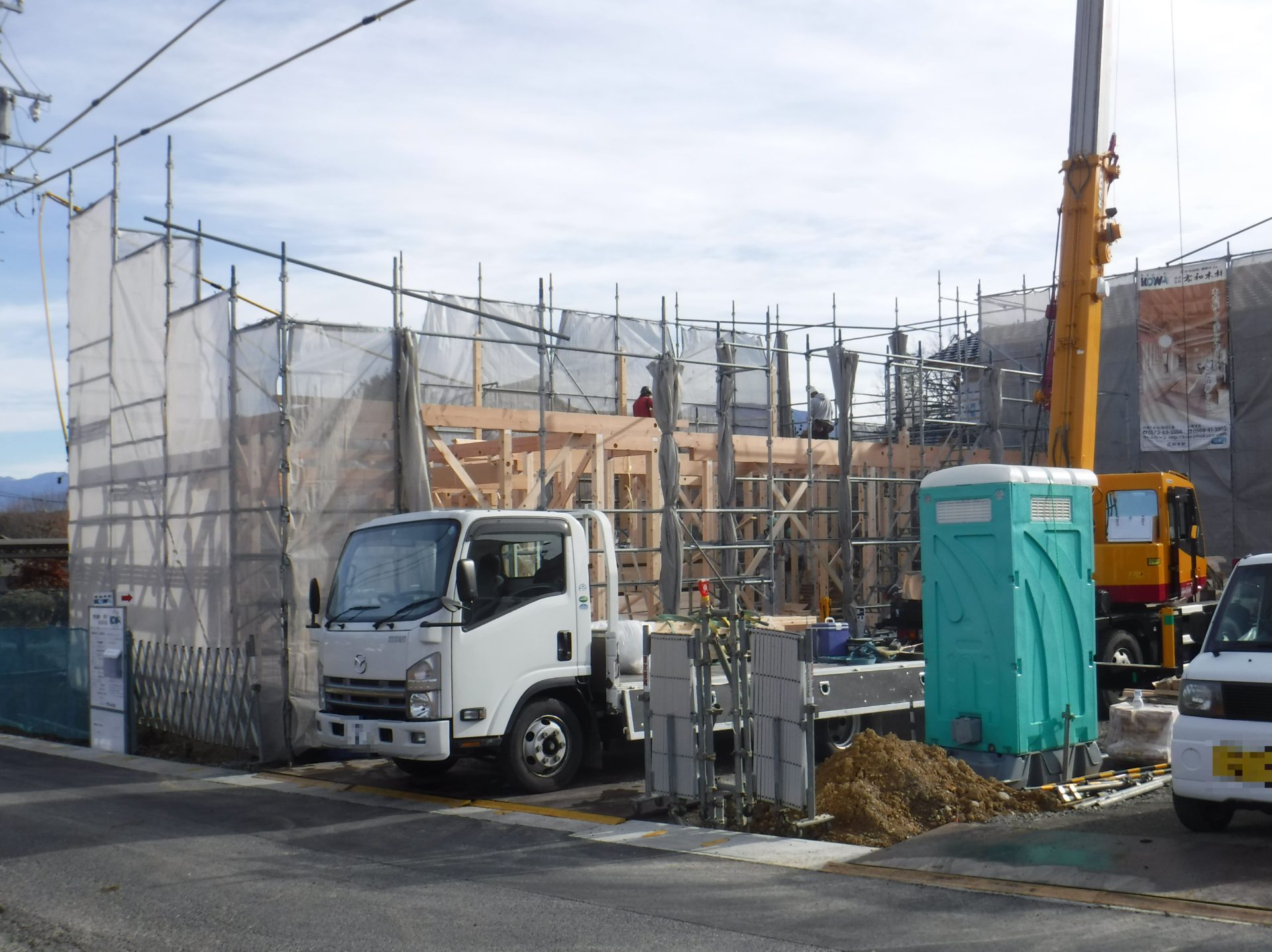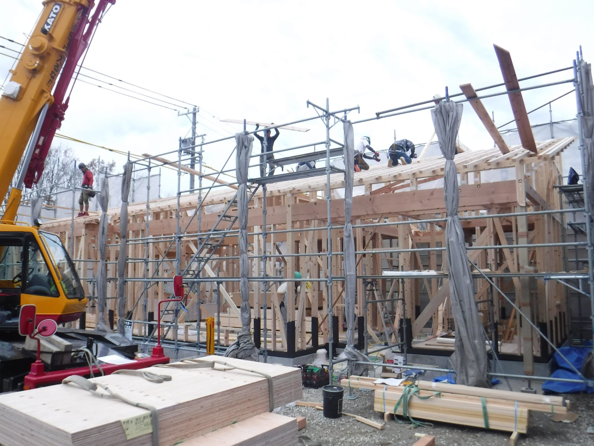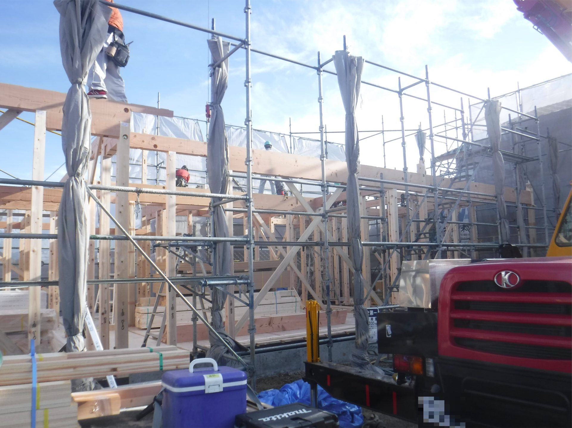 建て方初日、暖かく晴れ晴れとした良い天気の中、柱おこしから桁組みの流れで施工をさせて頂きました!