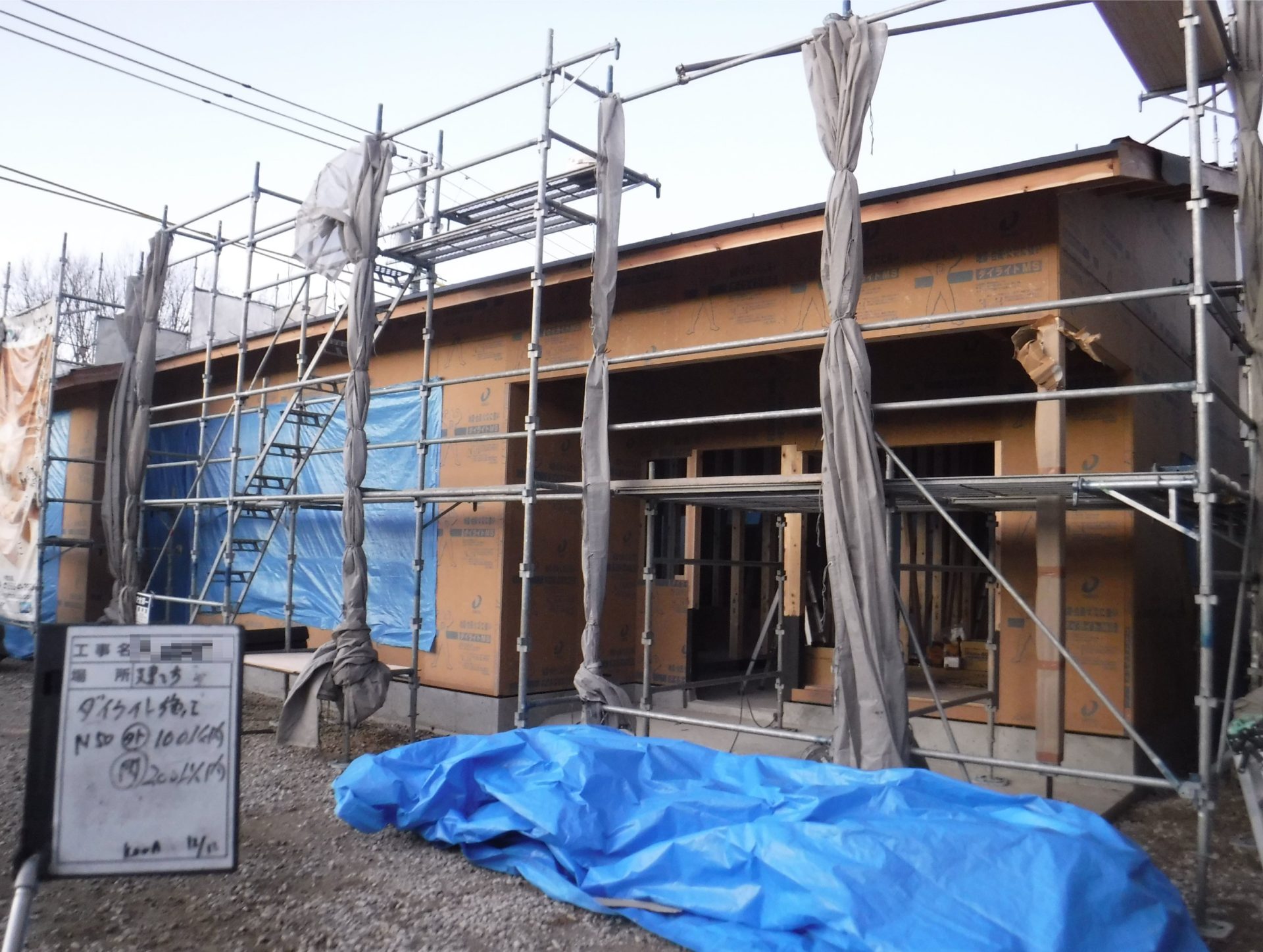 大工さんや瓦屋さんには、午後からも工事を進めて頂き、屋根はルーフィング施工完了、大工さんの作業はダイライトを施工し、耐震金物まで施工完了しました!