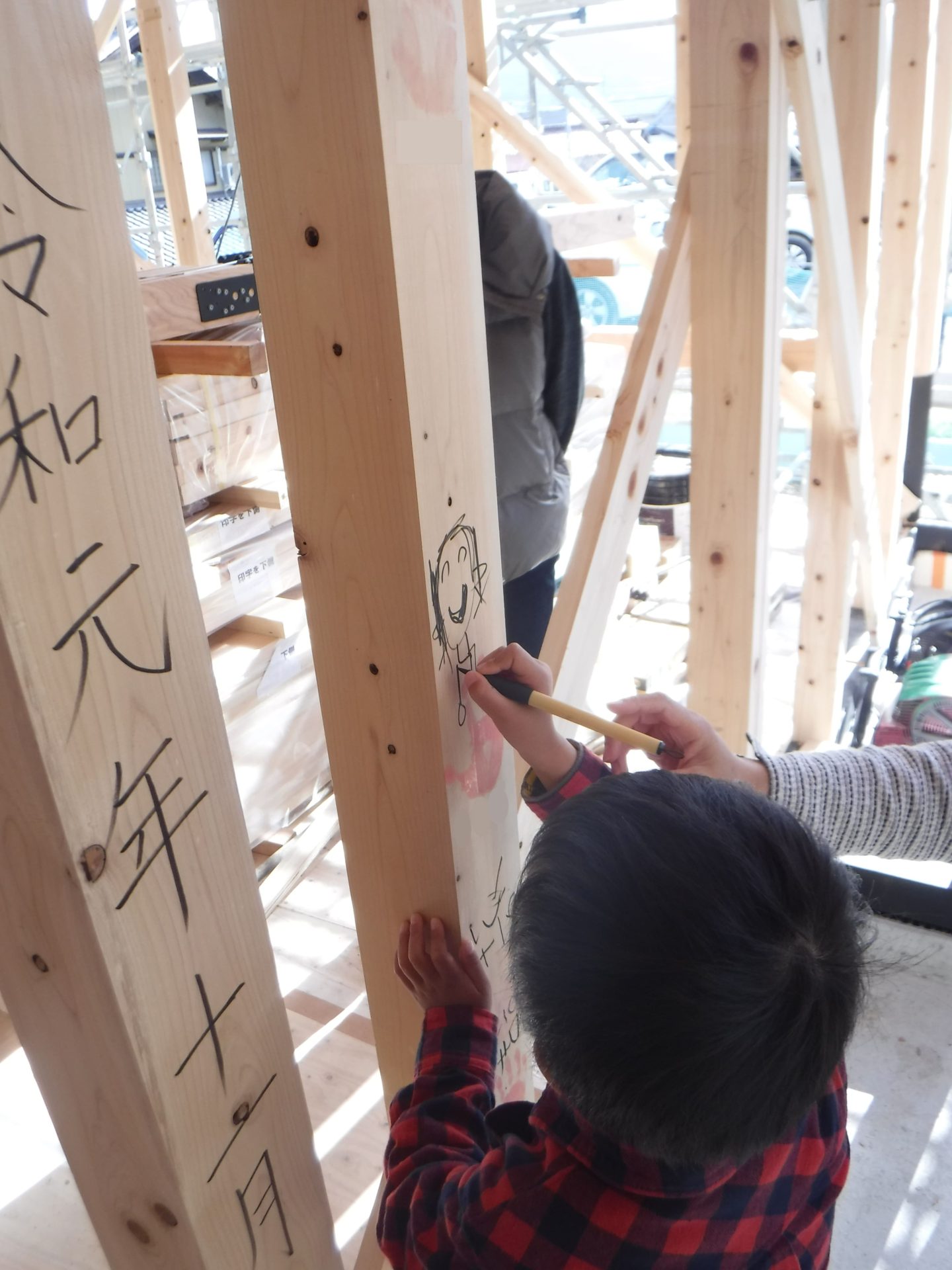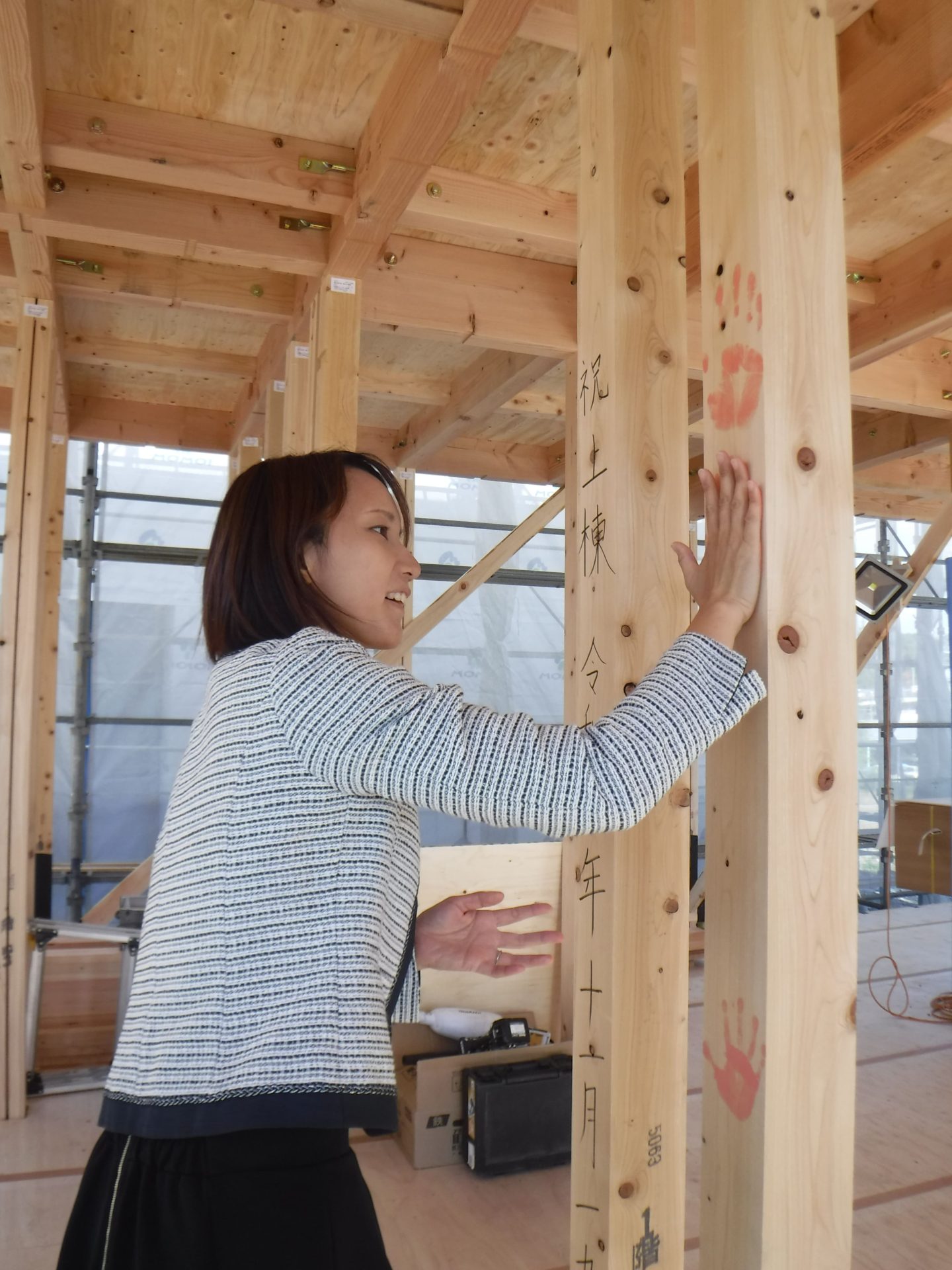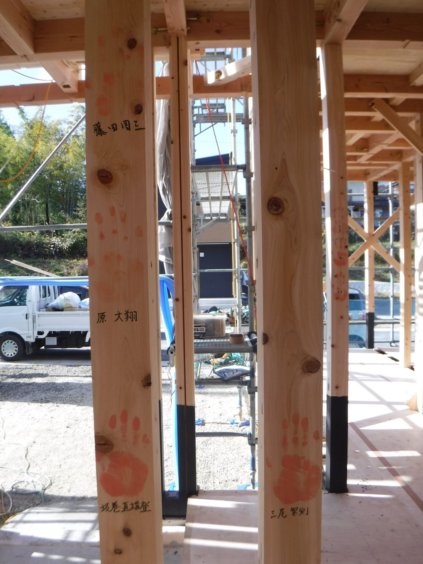 昼食後、H様ご家族と広和スタッフ、棟梁と一緒に、柱に手形を付け思い出づくり!
