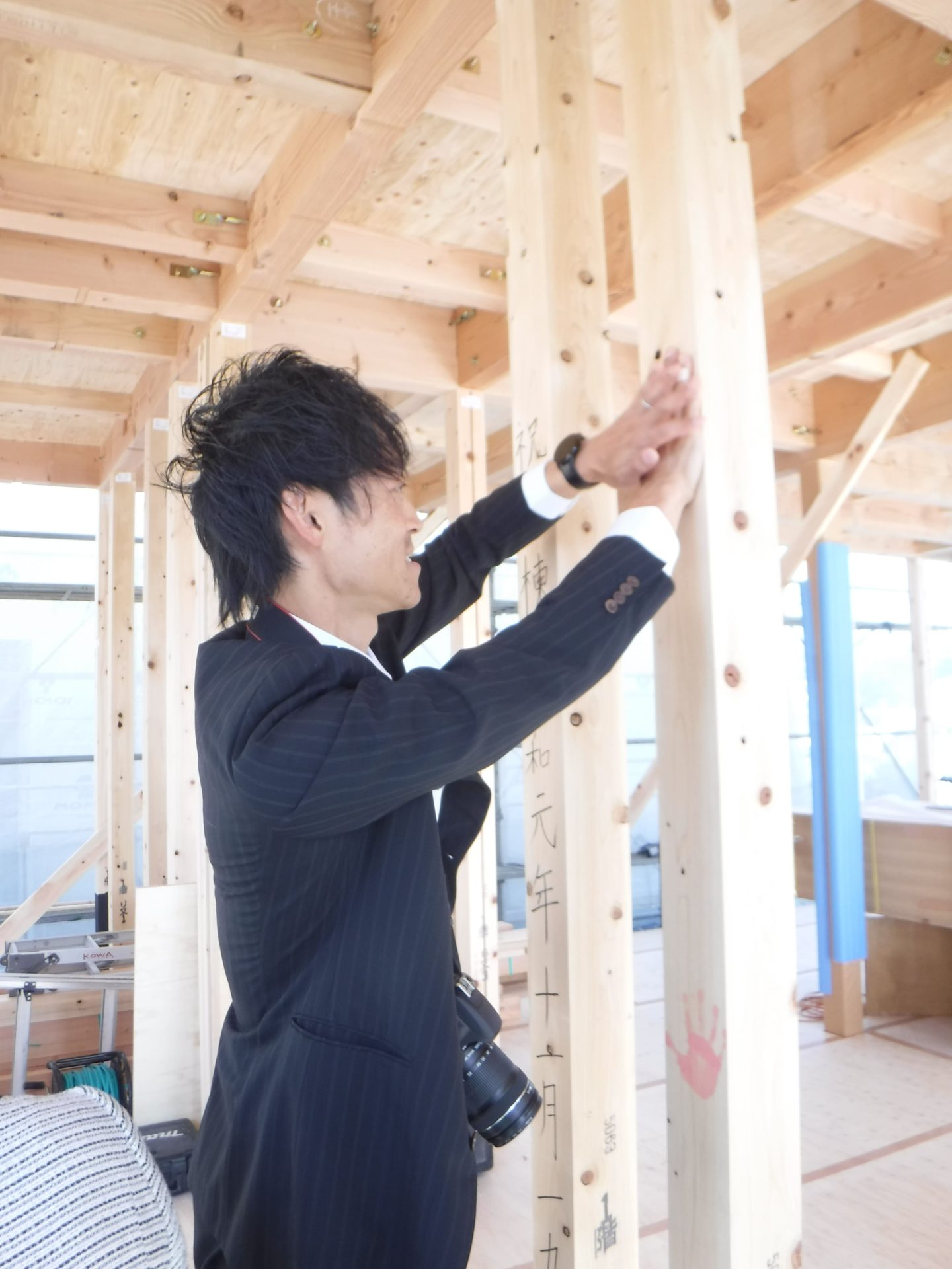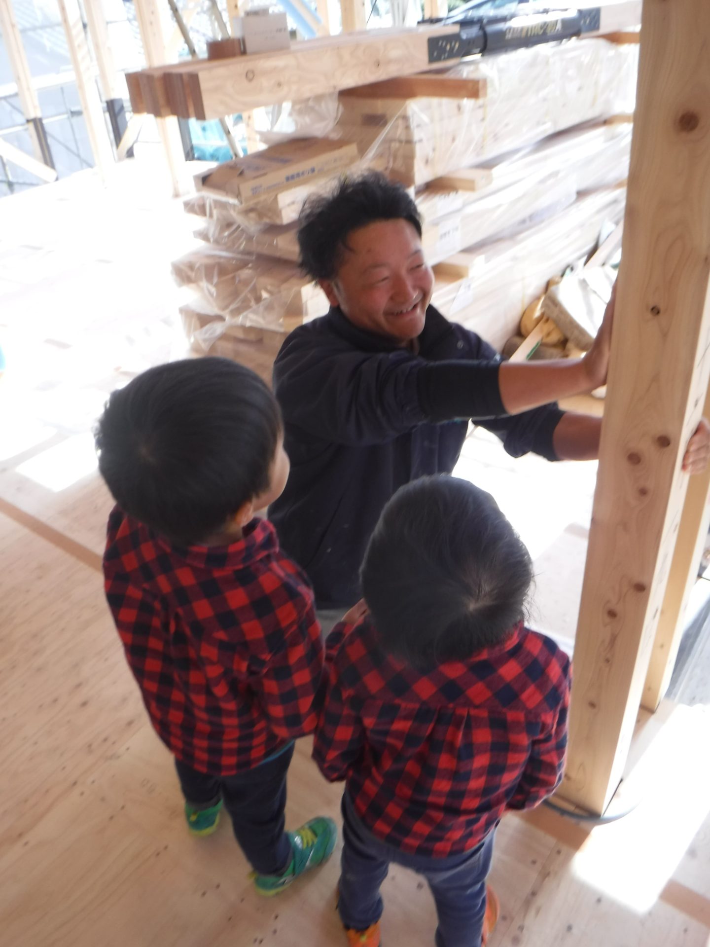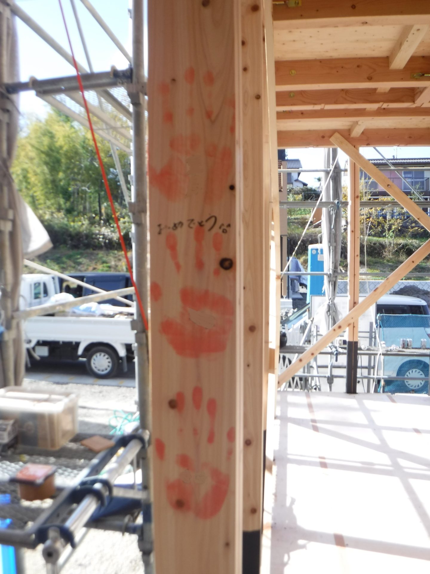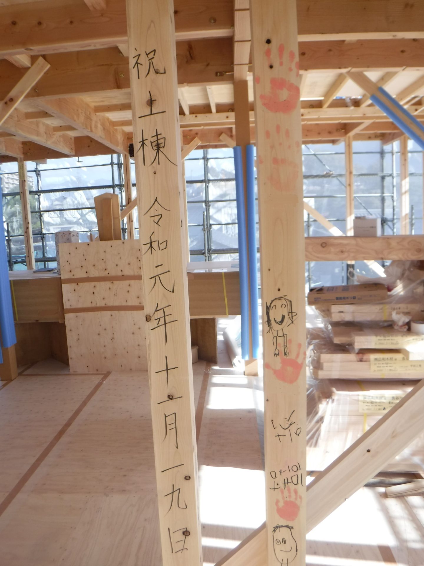 昼食後、H様ご家族と広和スタッフ、棟梁と一緒に、柱に手形を付け思い出づくり!