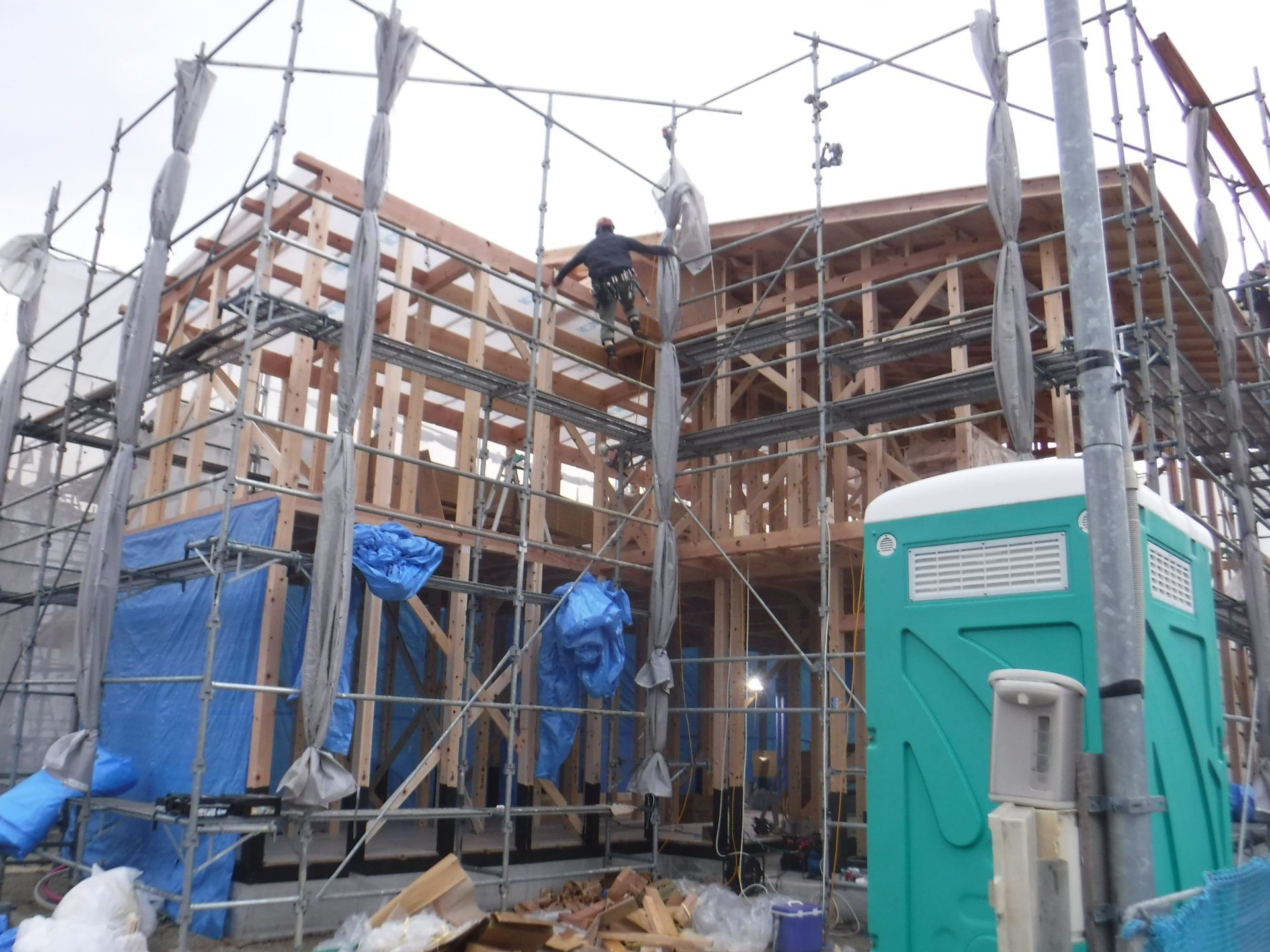 大屋根の下地まで出来て雨養生も完璧!