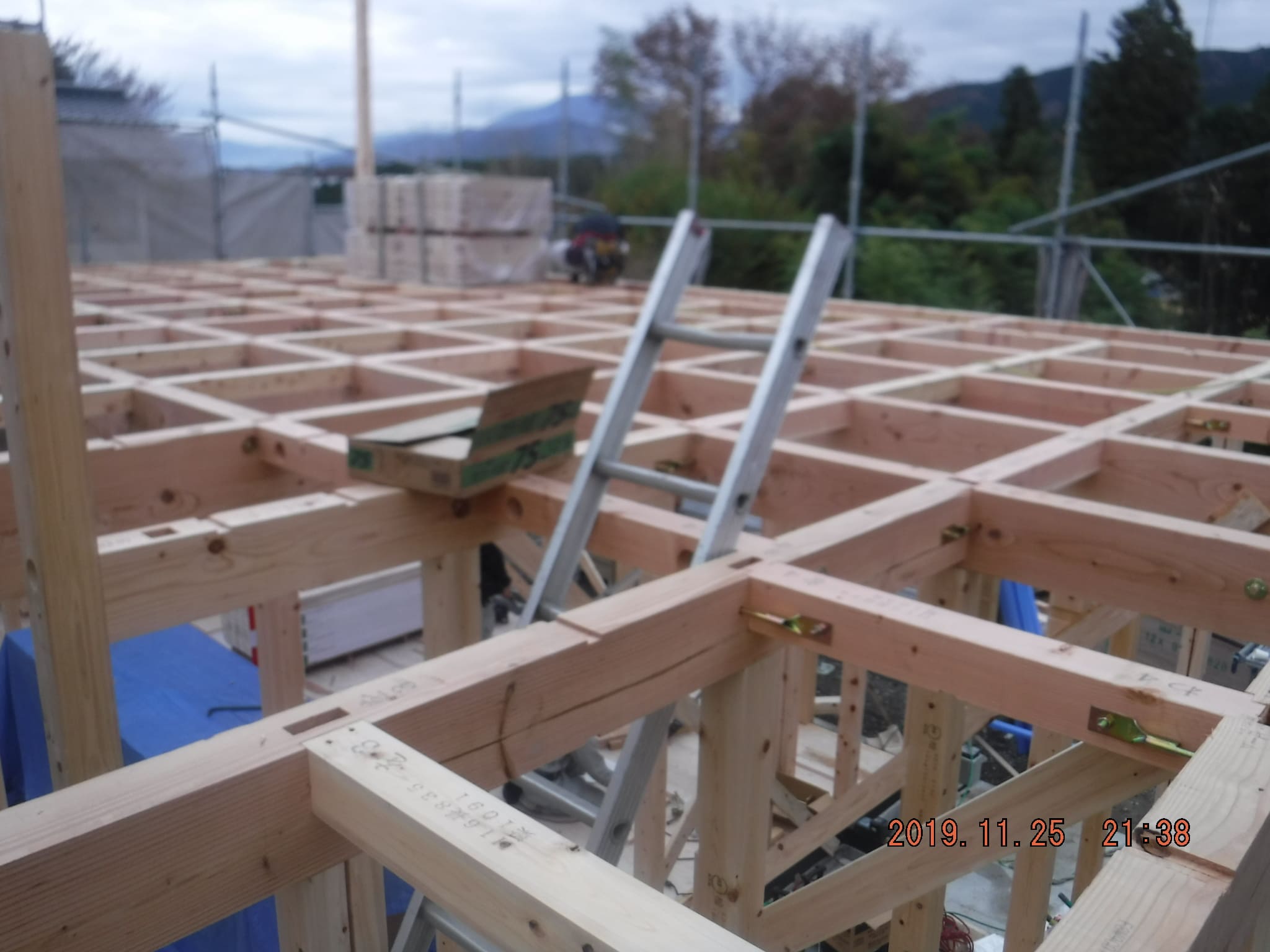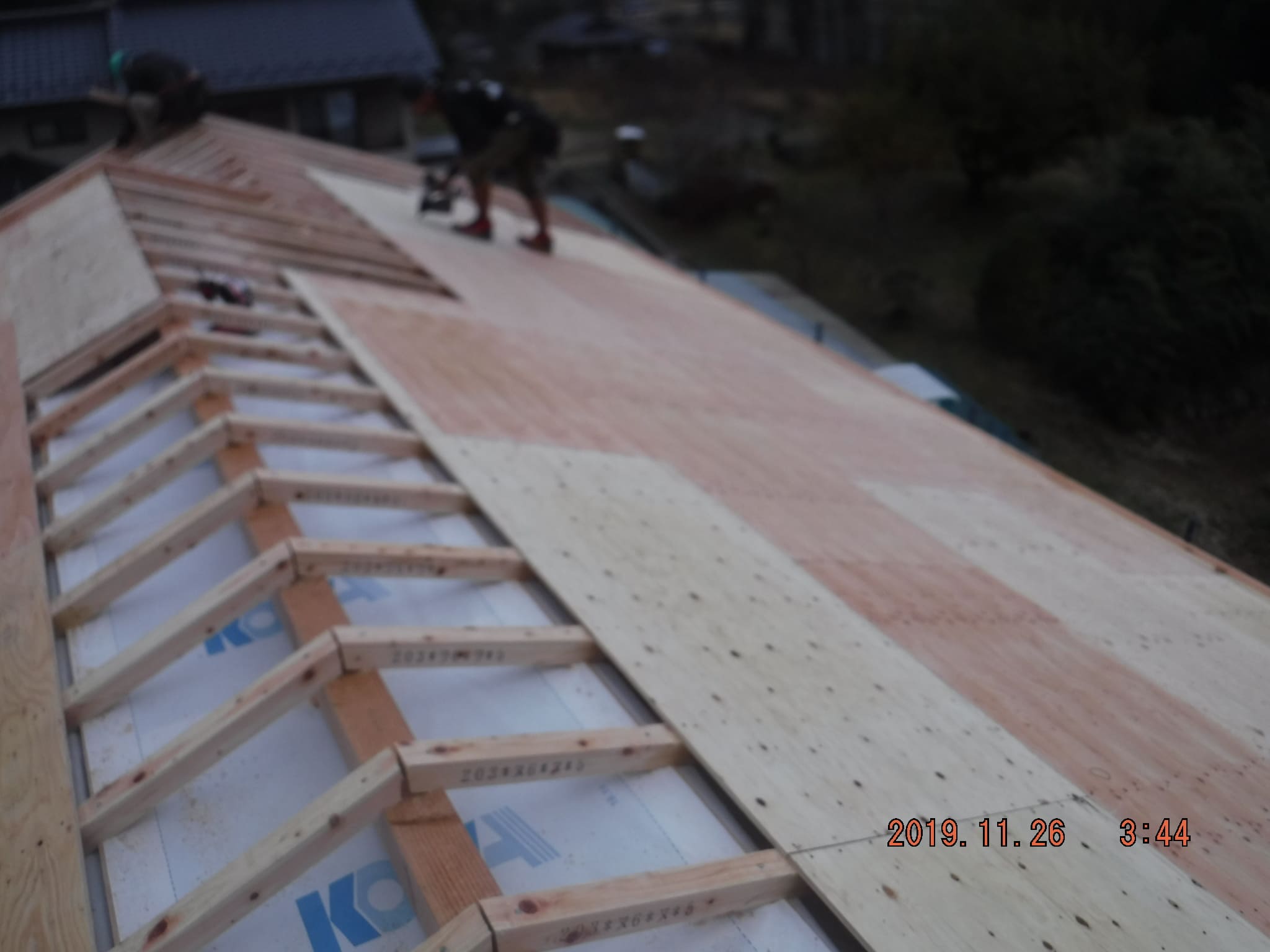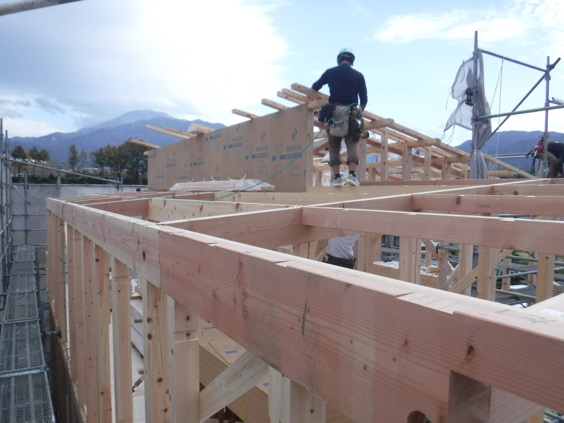 建て方初日、天気予報は夕方雨がふる予報だったので、屋根まで完了!