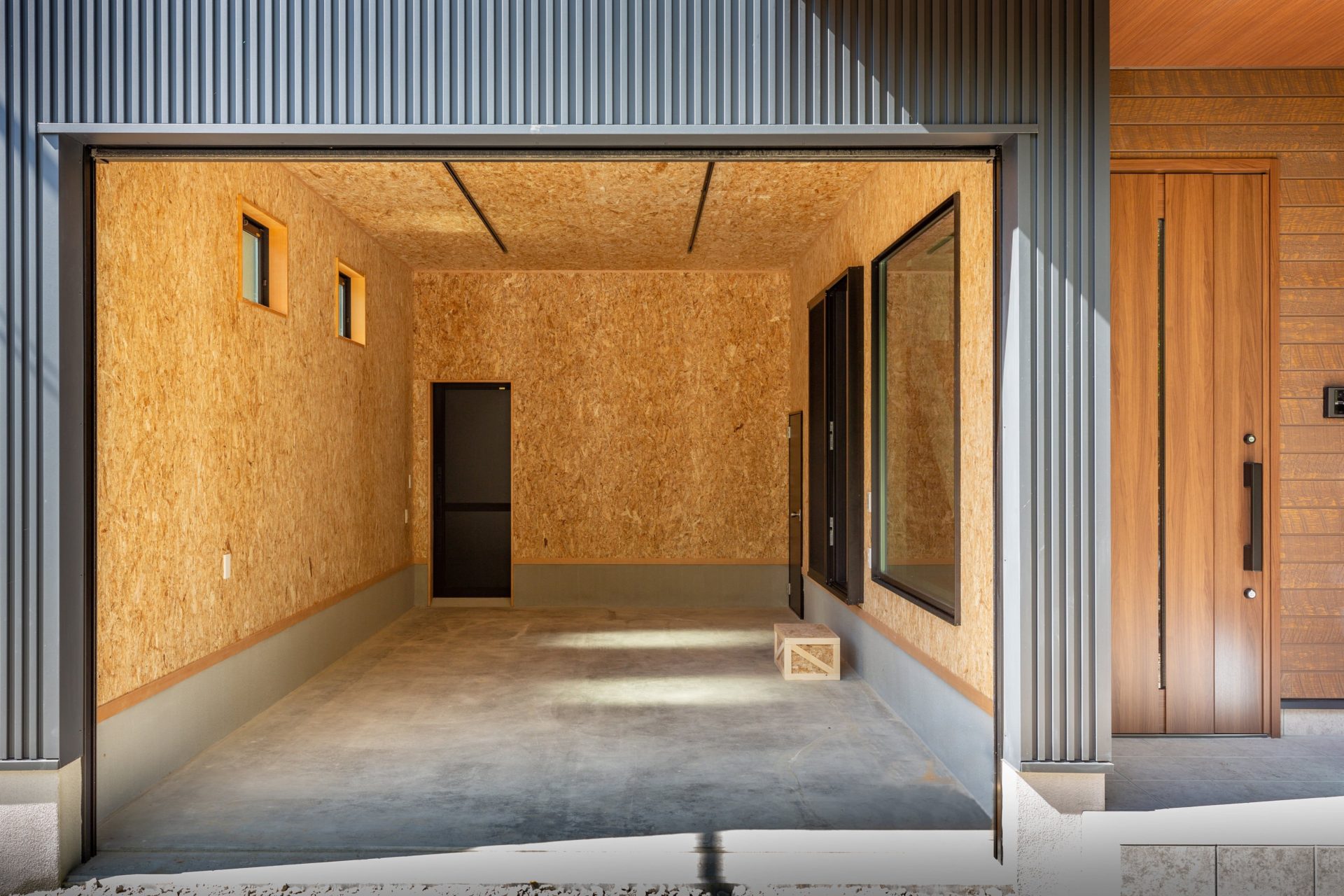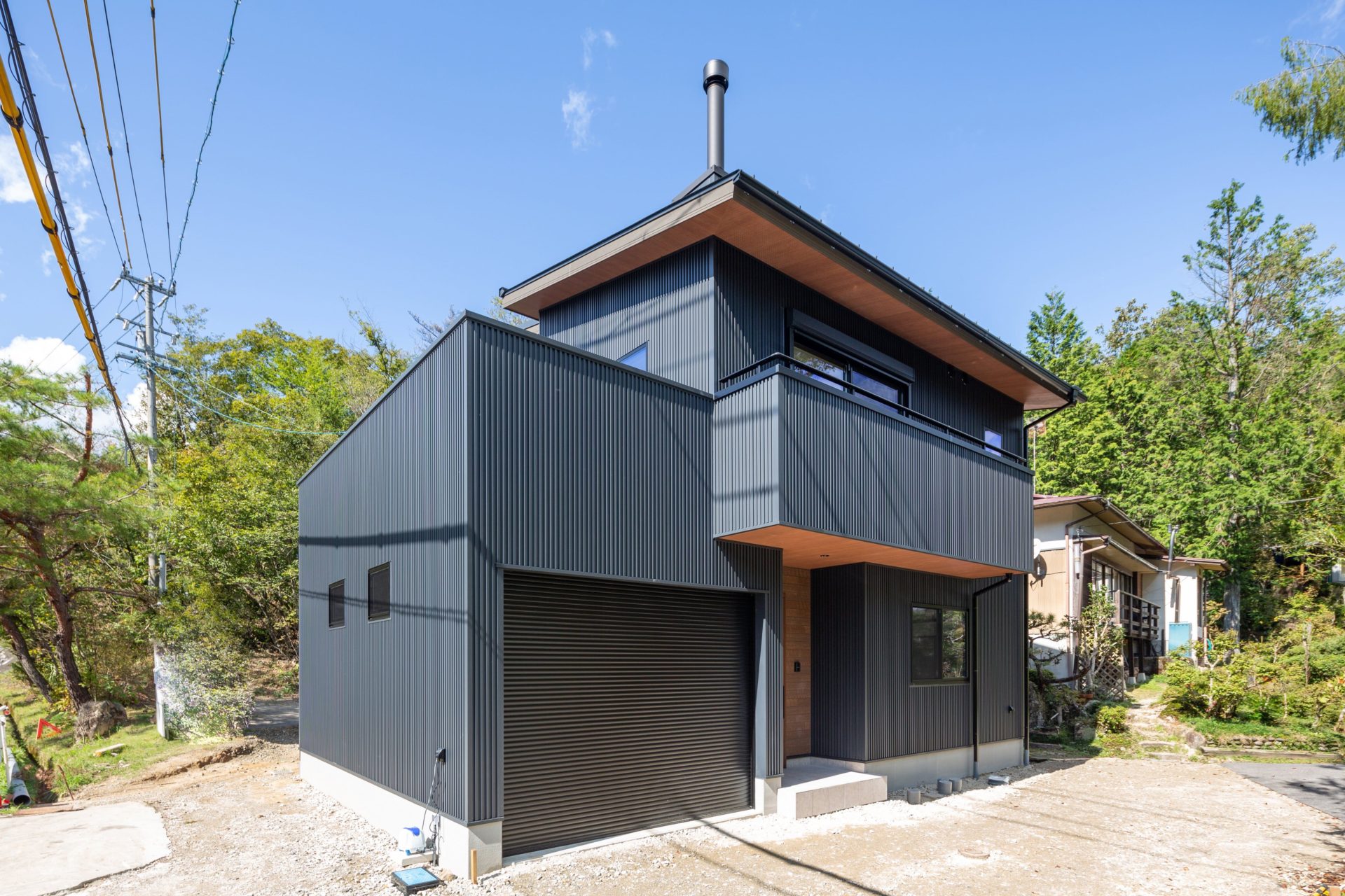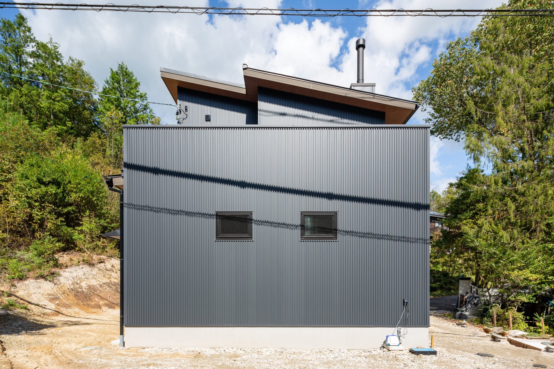 外観は、片流れの板金の屋根に、外壁は黒のガルバリウムKスパンと木目調のサイディングを施工した、