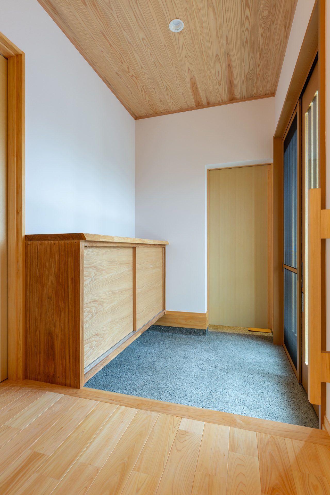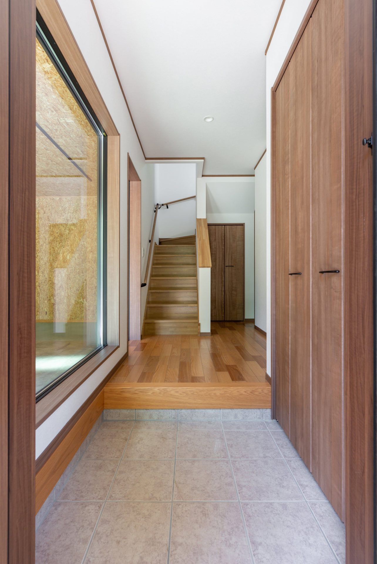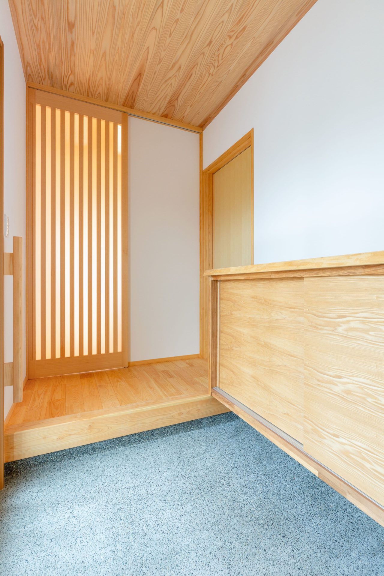 玄関ホールからリビングに入る入口は、天井までの建具になっており、狭いホールも圧迫感のない解放的な空間をつくることができます。