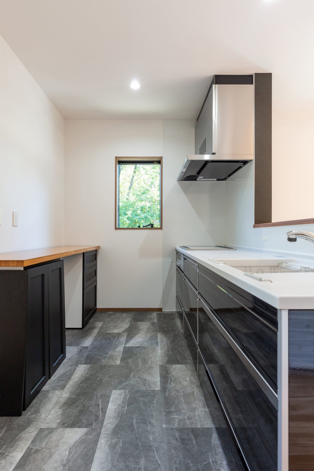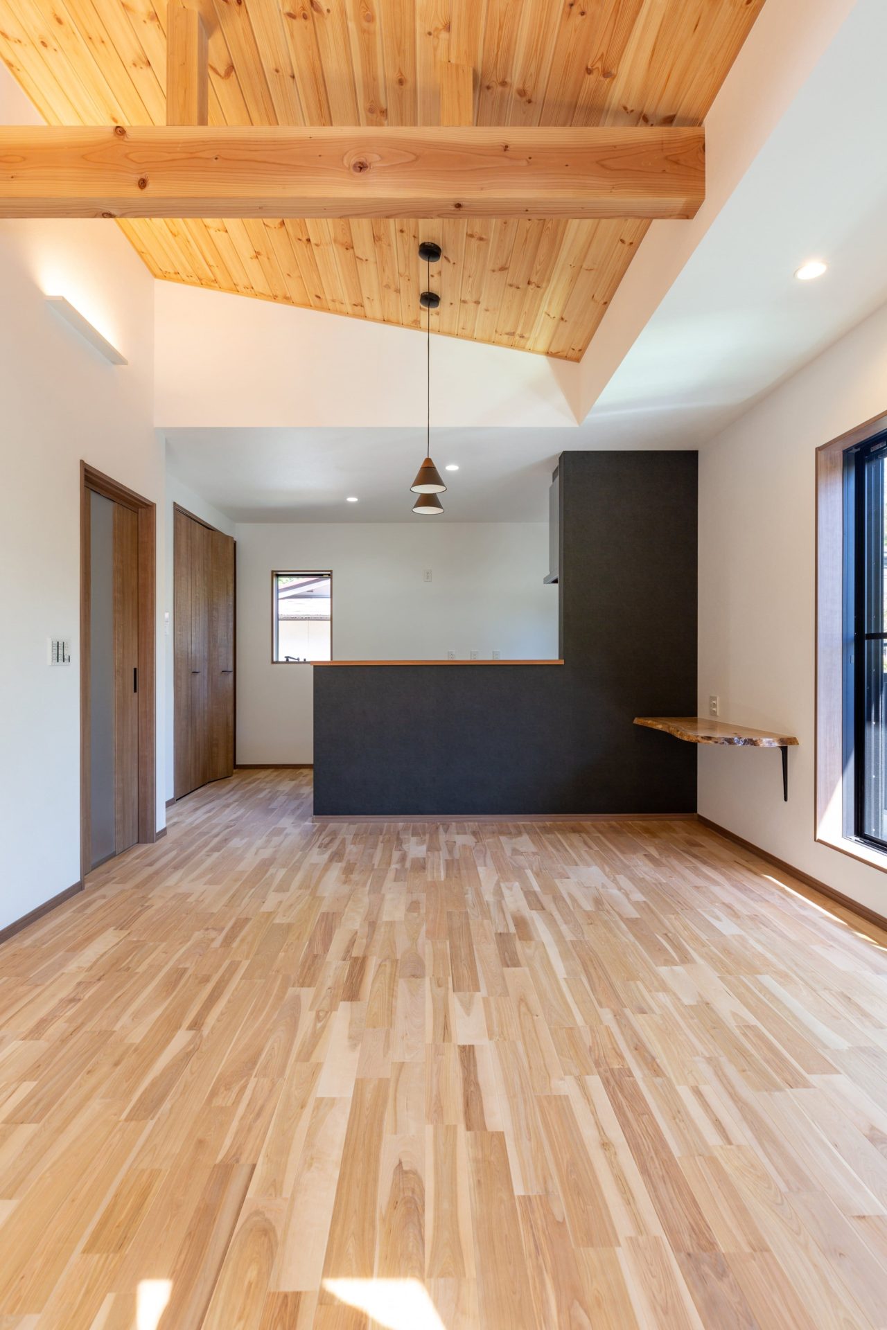 LDKは、天井にはパイン板を施工し、床はカバ桜、無垢カウンターにはクスノキを使用したナチュラルな雰囲気になっております。