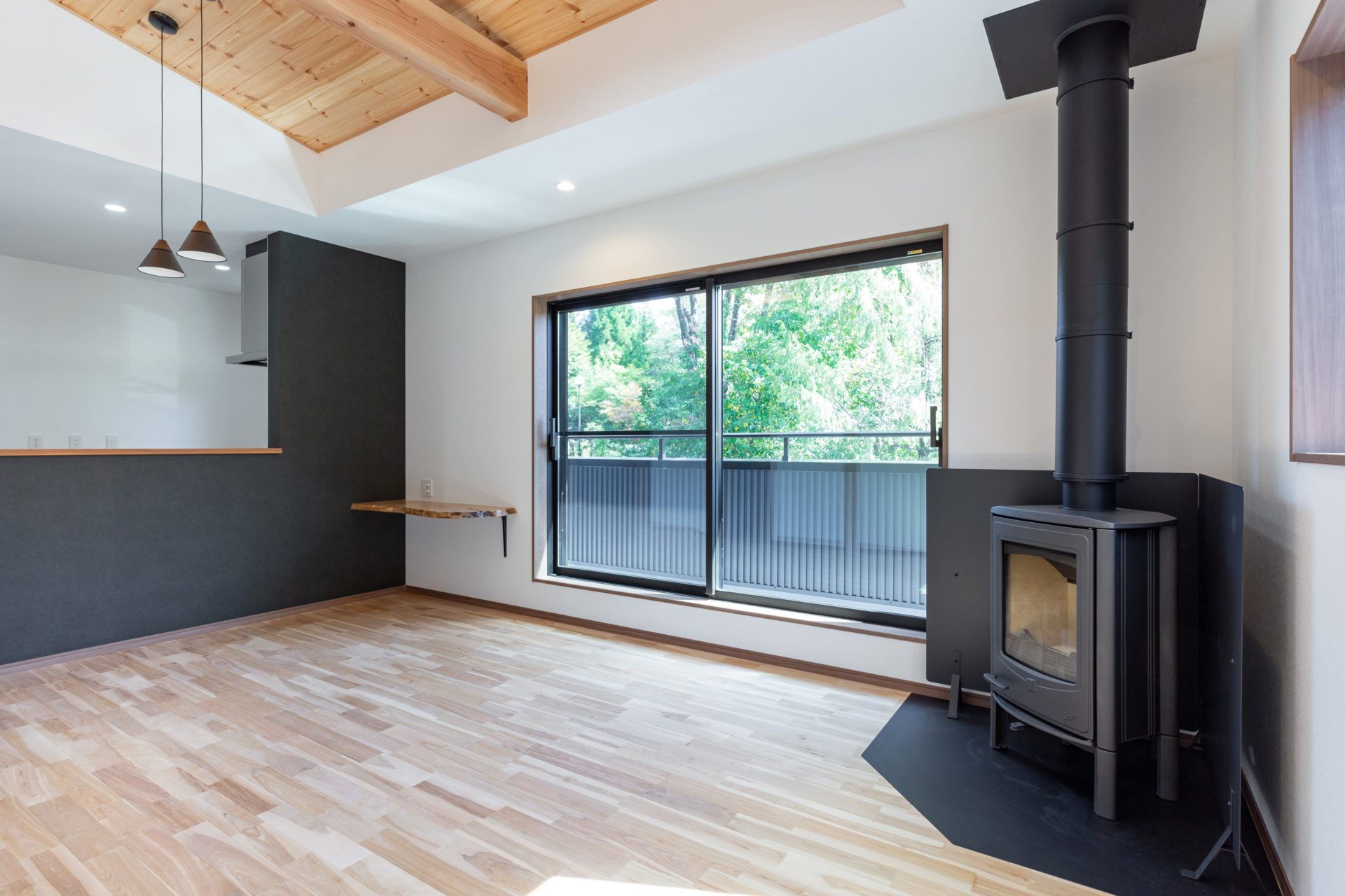 暖炉やプロペラファン・クロスにブラック色をアクセントとして取り入れた、