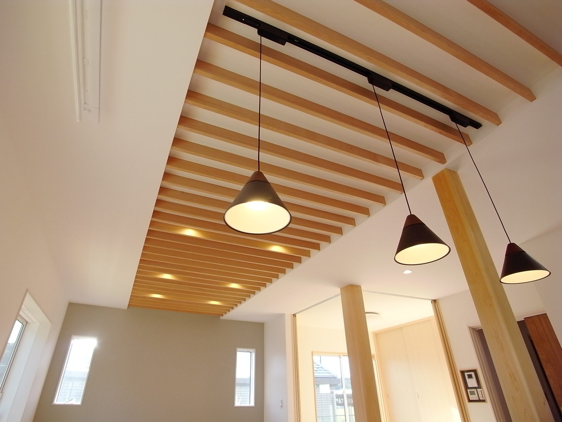 - ダイニングテーブル上にはレール式照明