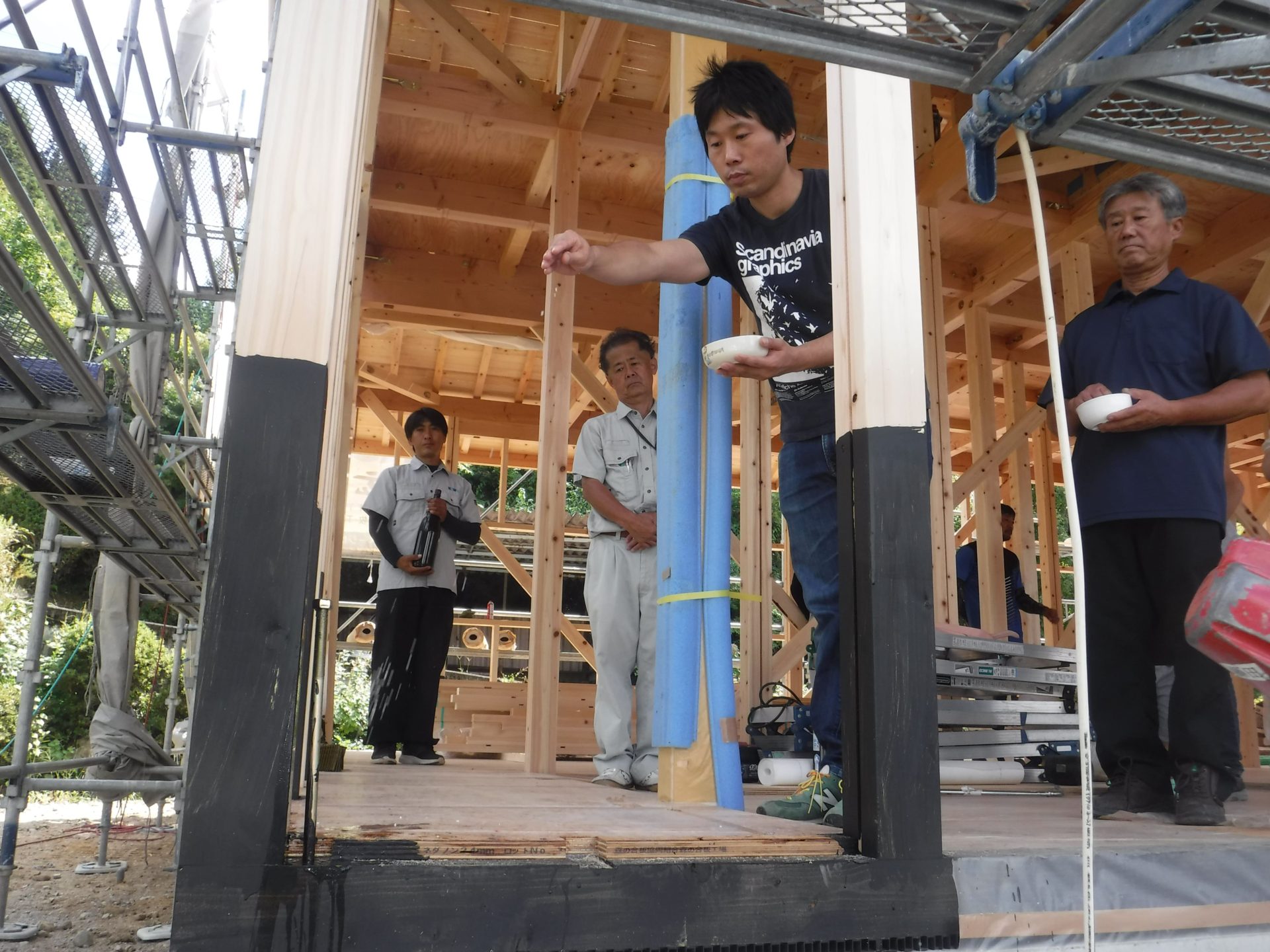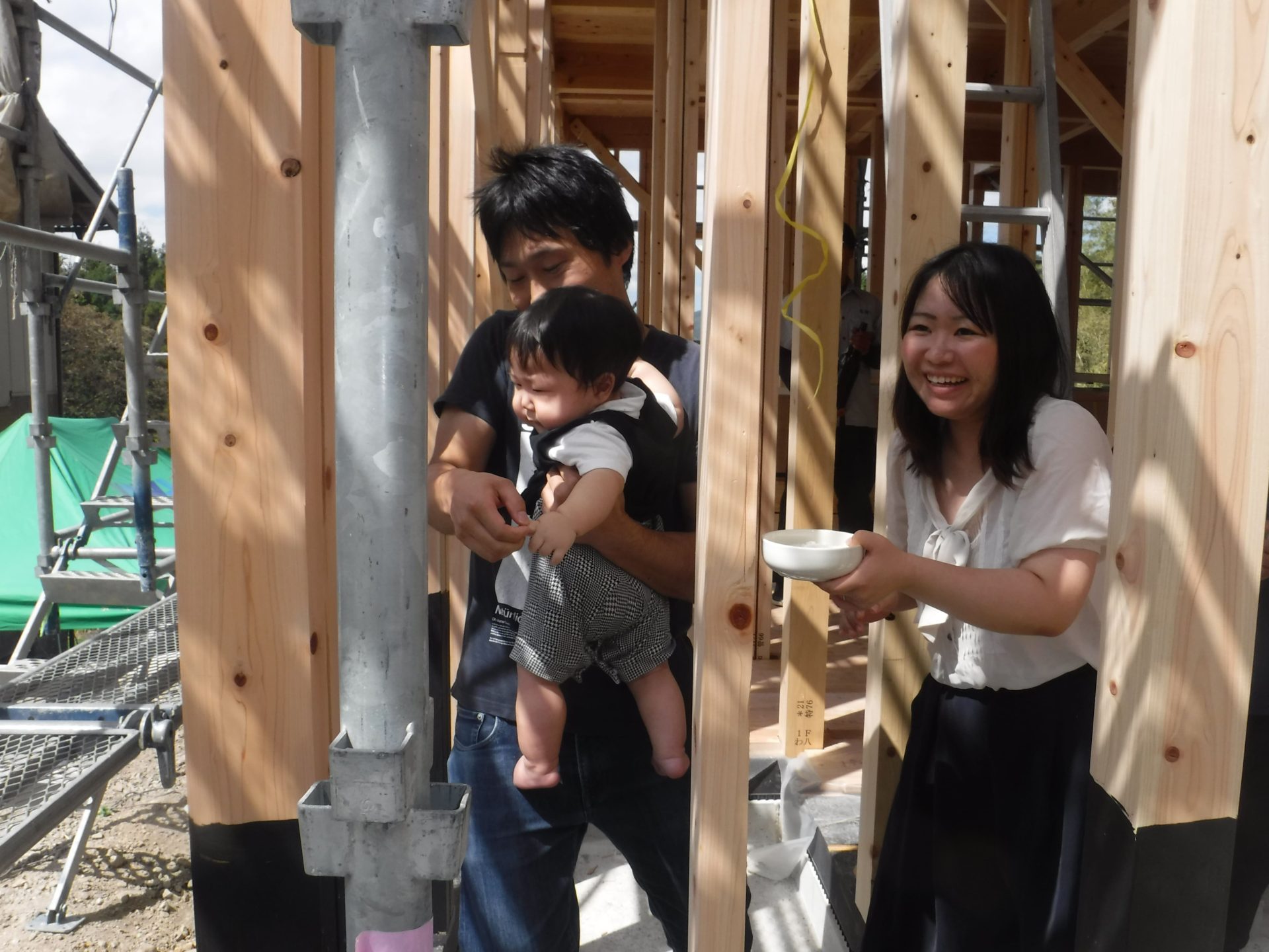 上棟式は建物の中で、H様ご家族、棟梁、職人さんと共に行いました。