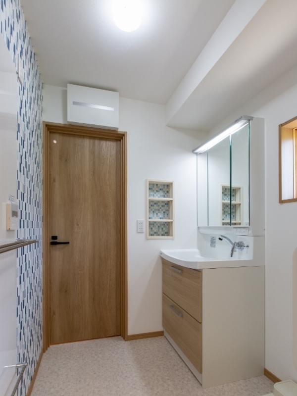 グレーと青のクロスを使用し、アイアン風の棚受け金具を使用した、ブルックリンスタイルな仕上がりになっております!