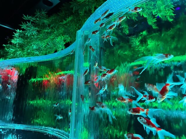 金魚が泳ぐことによって同じ柄になることがなく光の色も相まってとても綺麗でした。