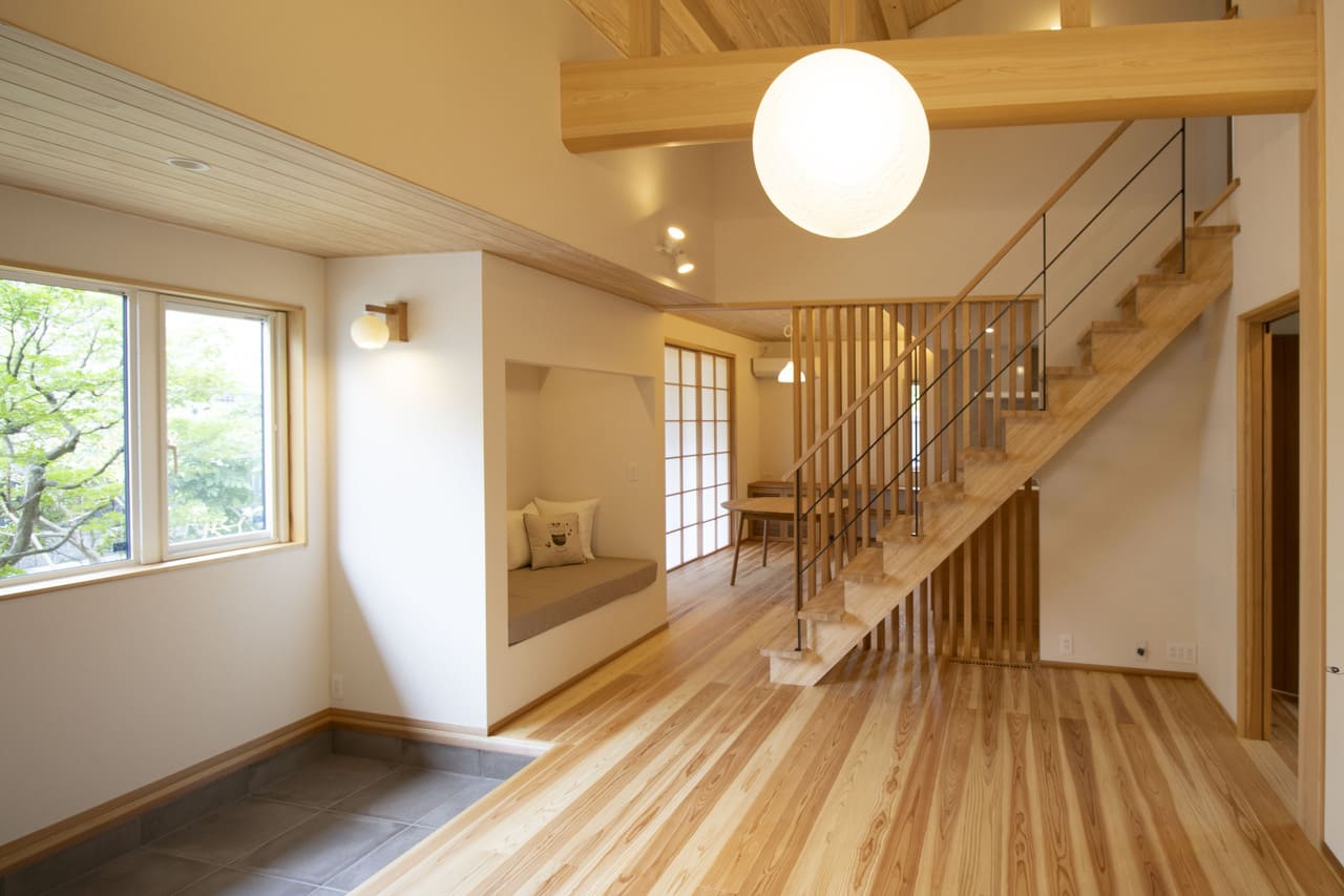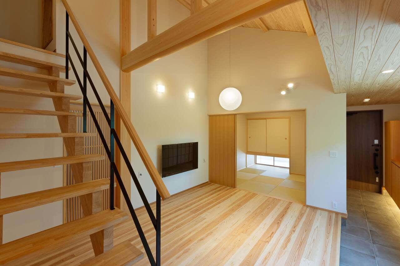 勾配天井によって空間が広がり、自然素材の杉の香りと木目の美しさが