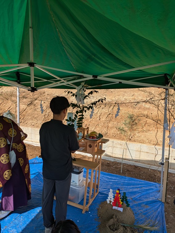 準備は雨に降られましたが、地鎮祭では雨が止みました。