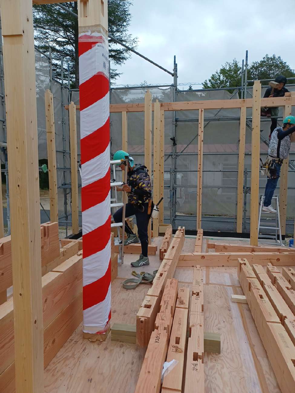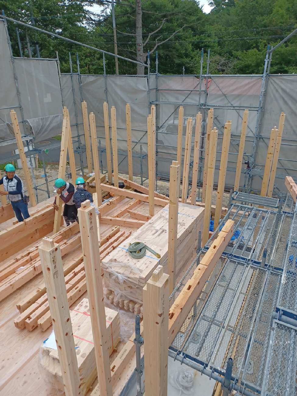 建て方の作業として、まずは柱を順番に建てていきます。