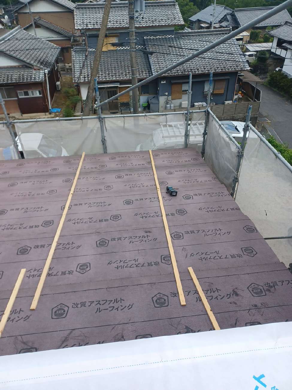最後に硬質ゴムアスルーフイング材で防水処理をして屋根下地まで完了