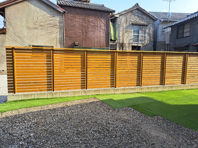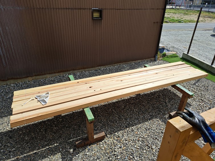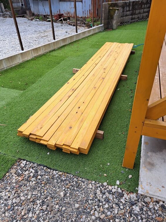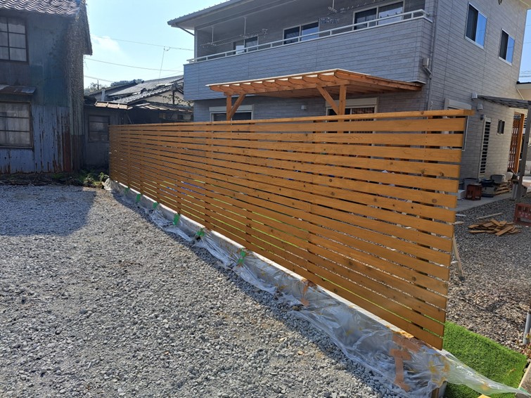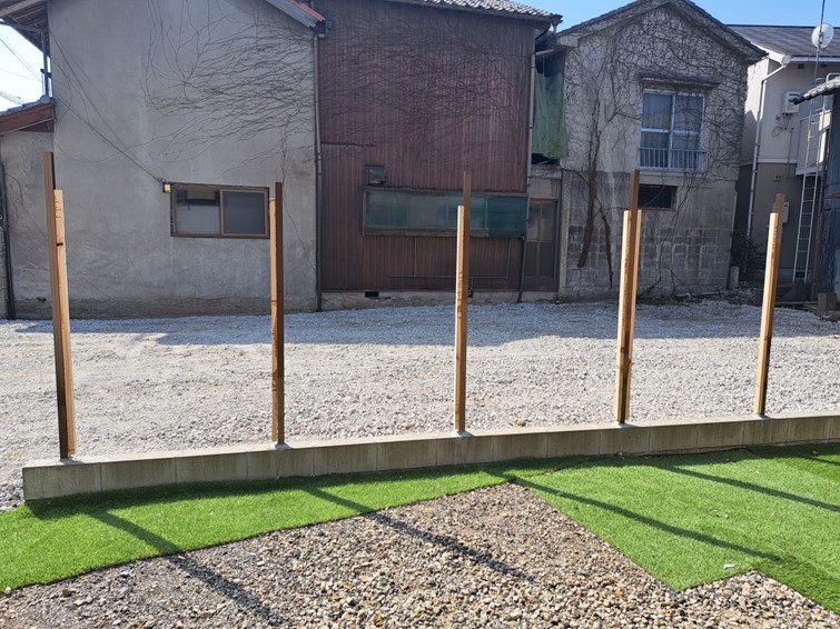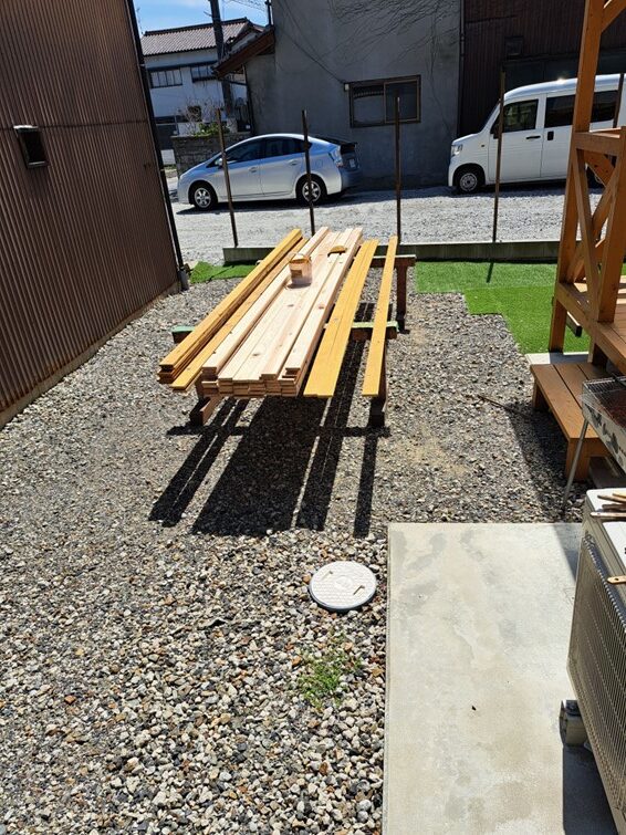 まずはアルミの柱を立てて、ここに杉の板を貼っていきます。
