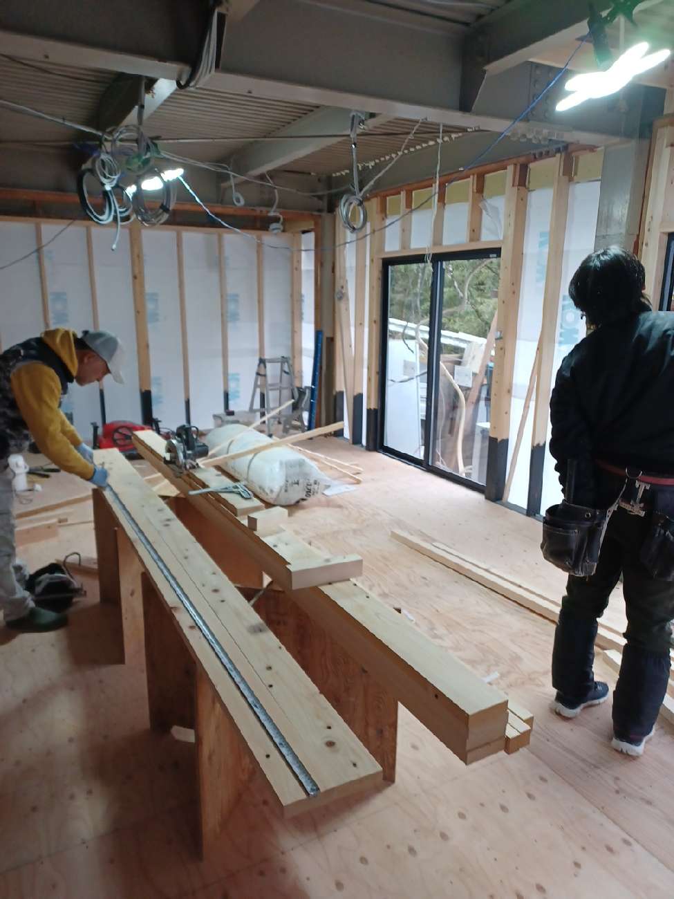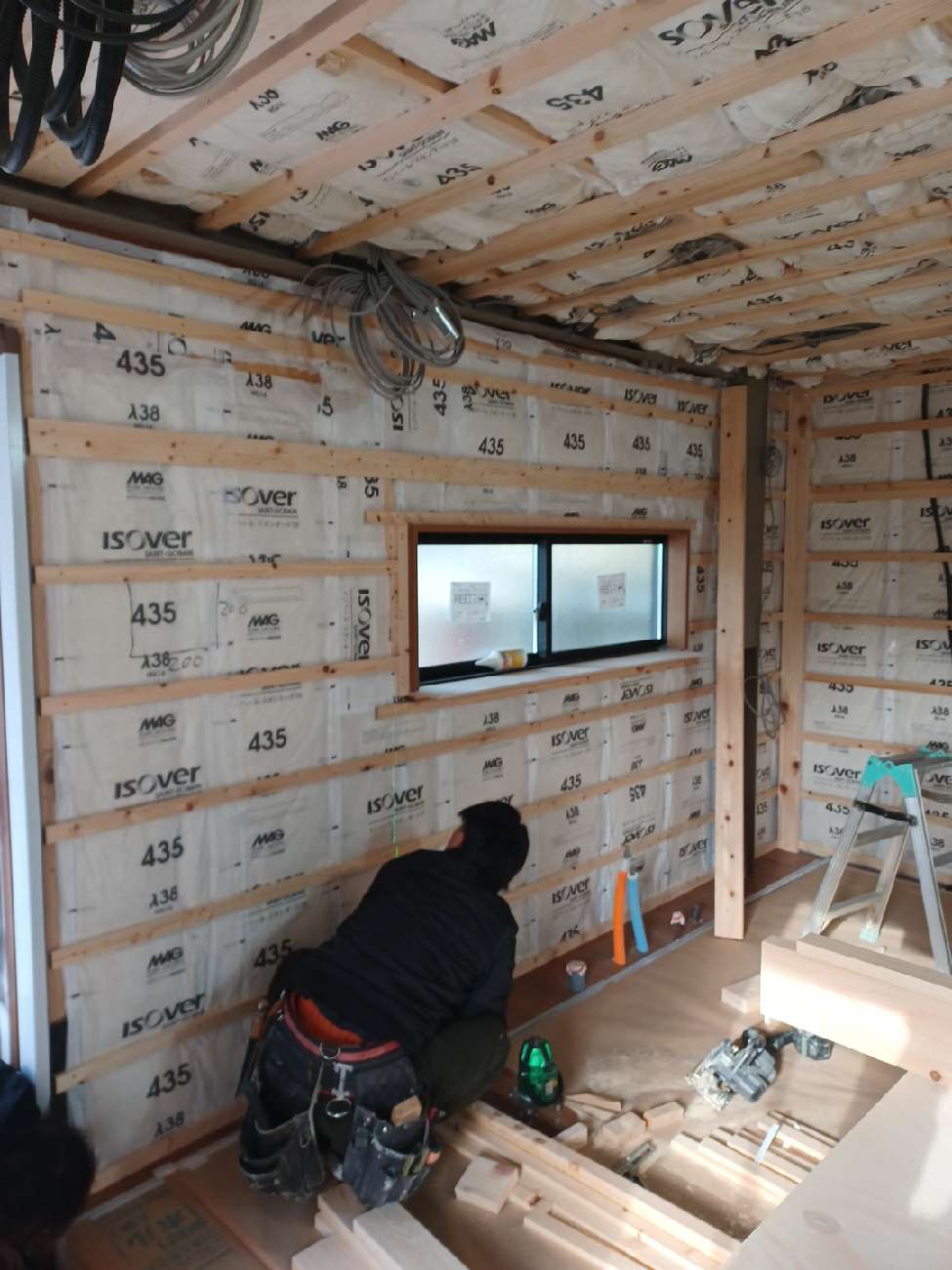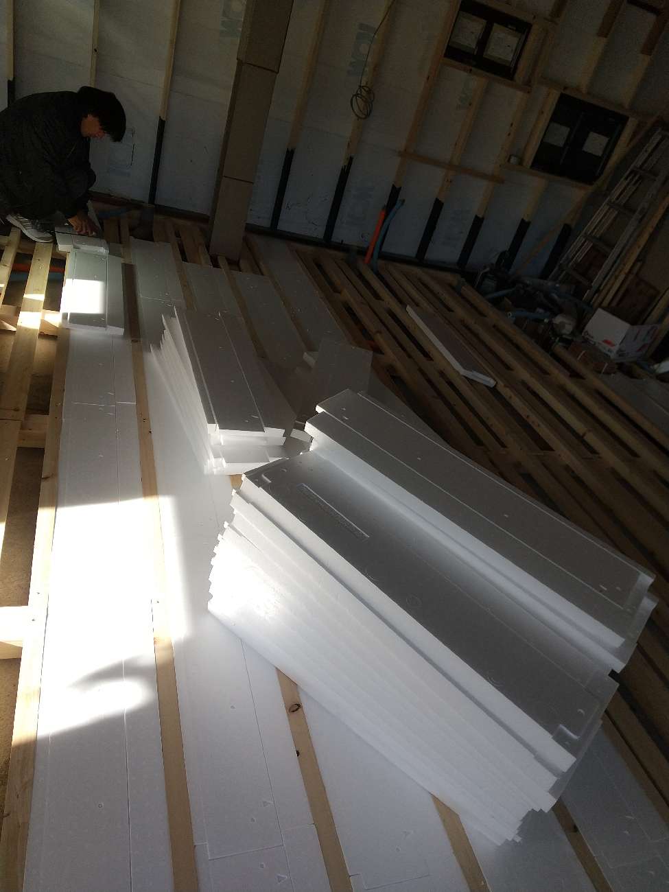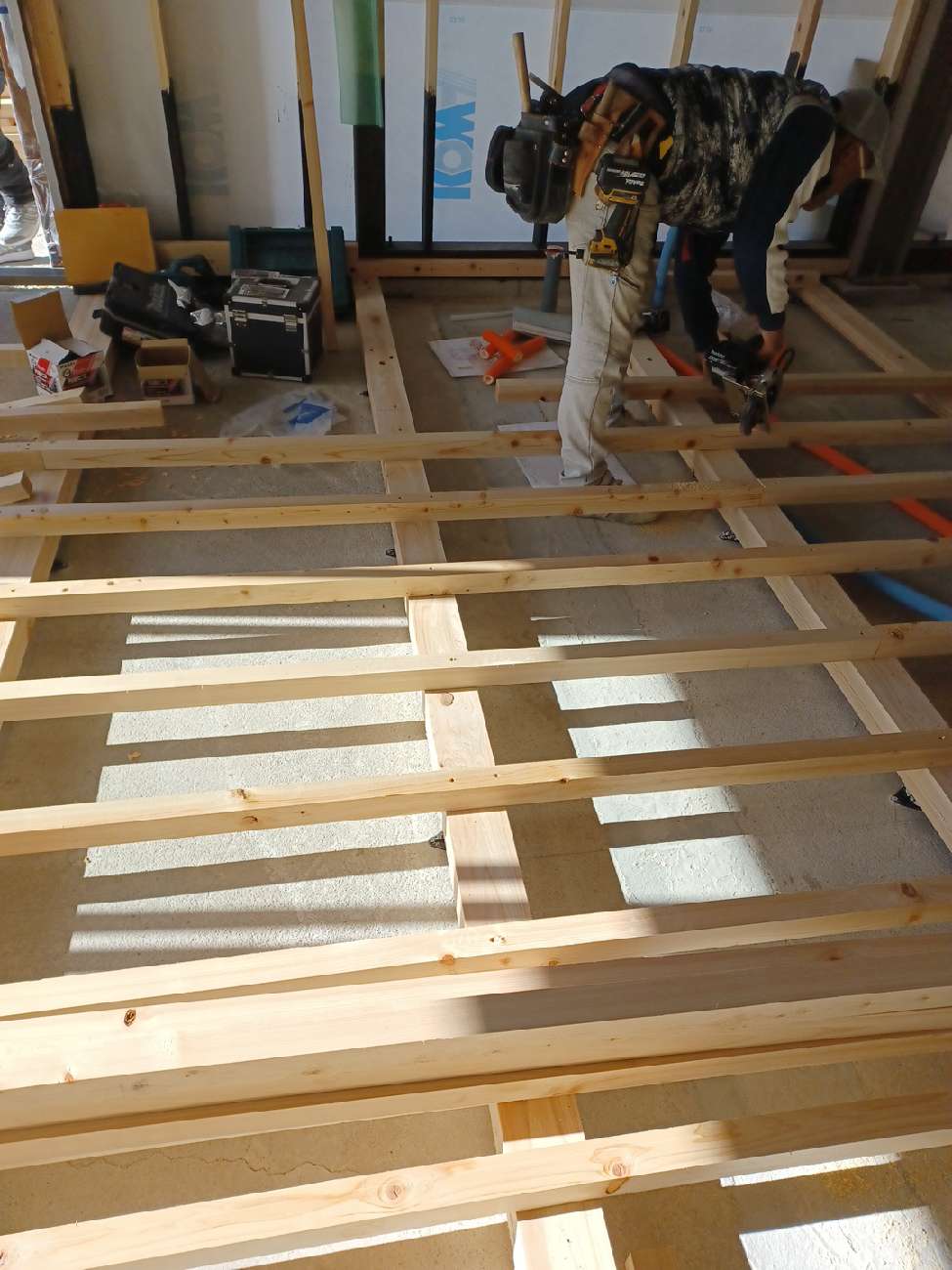 内部造作に入り、まず床の水平、断熱材を施工します。