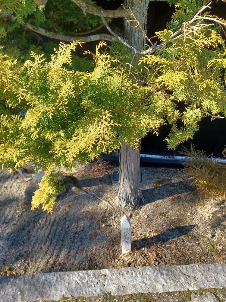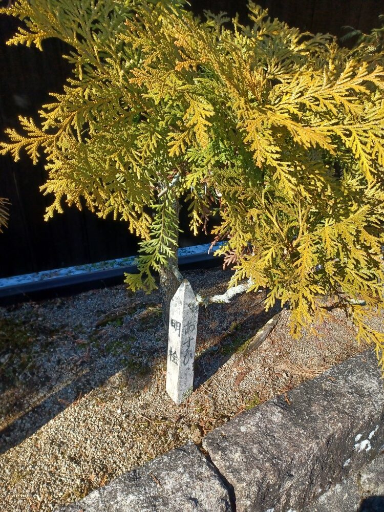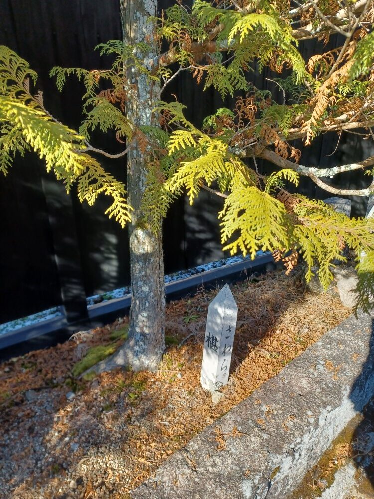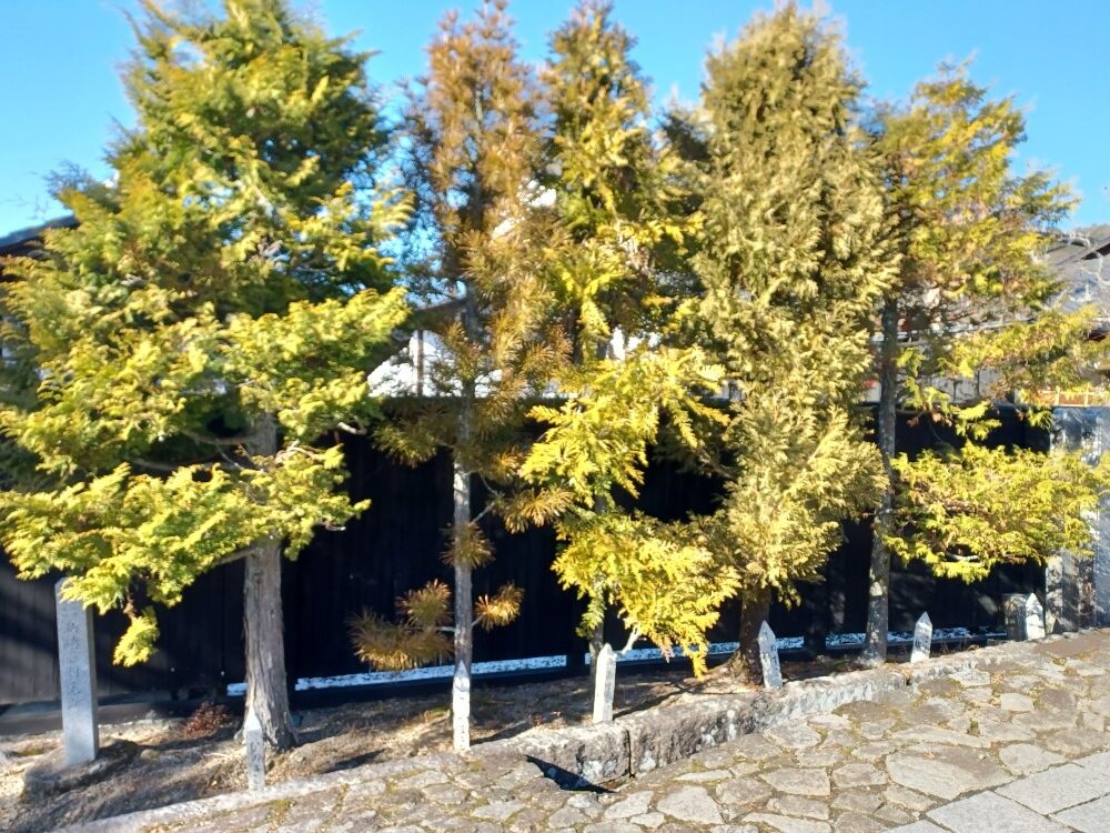 現場が馬籠宿にあり、石畳を歩いていると木曽5木がありました。