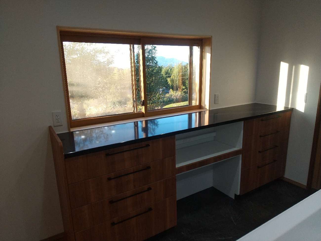 素材にこだわり、床材は、無垢のブラックチェリー材を使用し、
