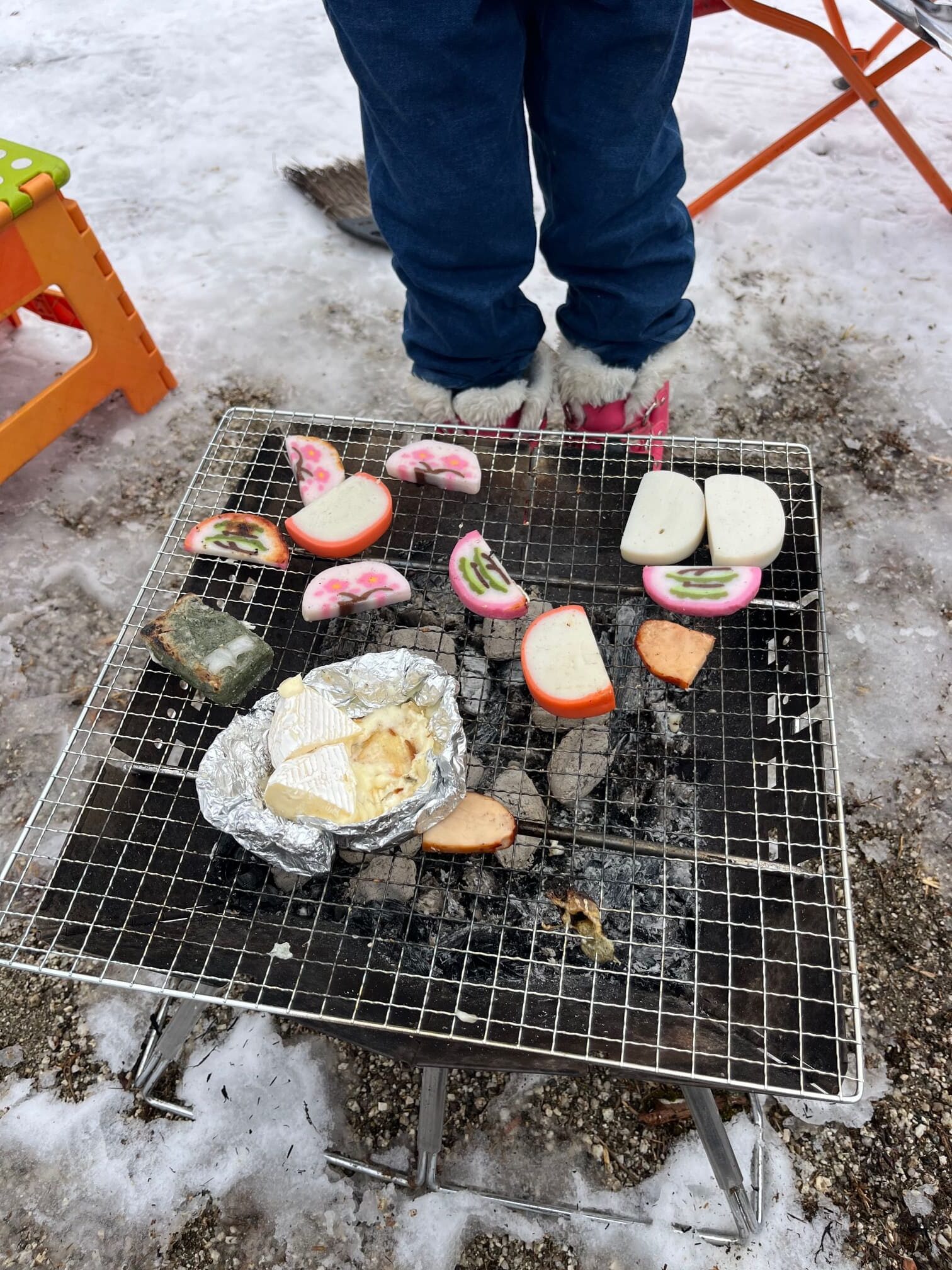左義長の炭で餅やハム、かまぼこやチーズを焼いて食べました♪