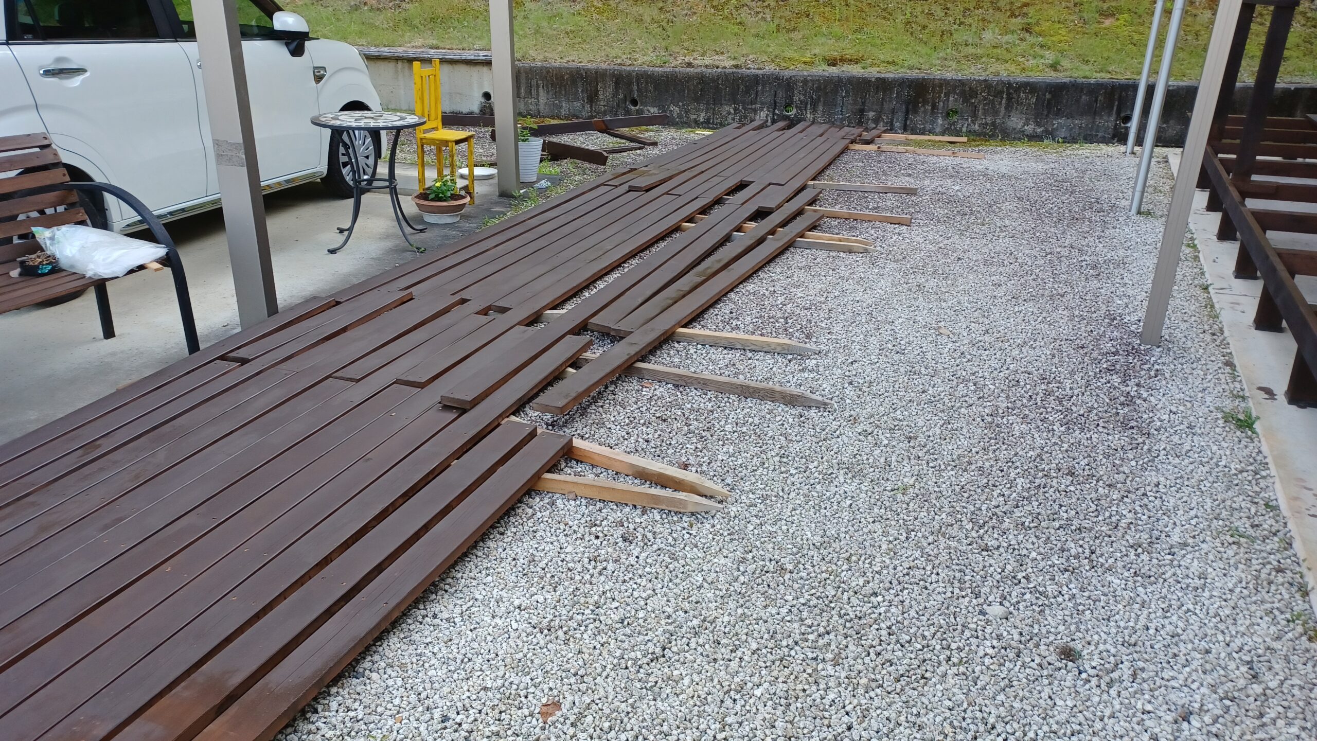 作業1日目はデッキ材を取り外し、