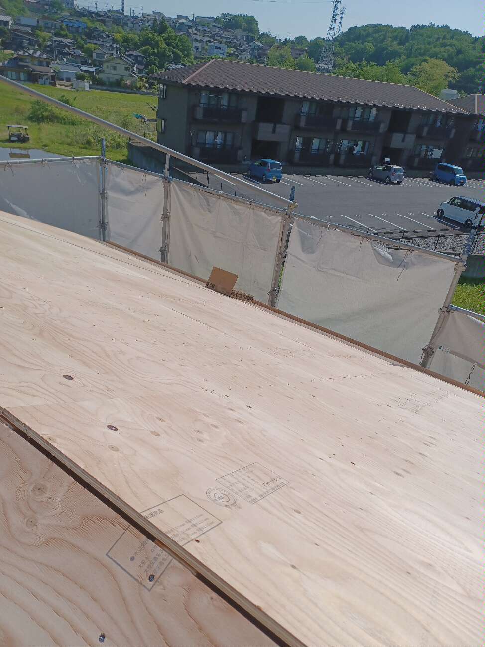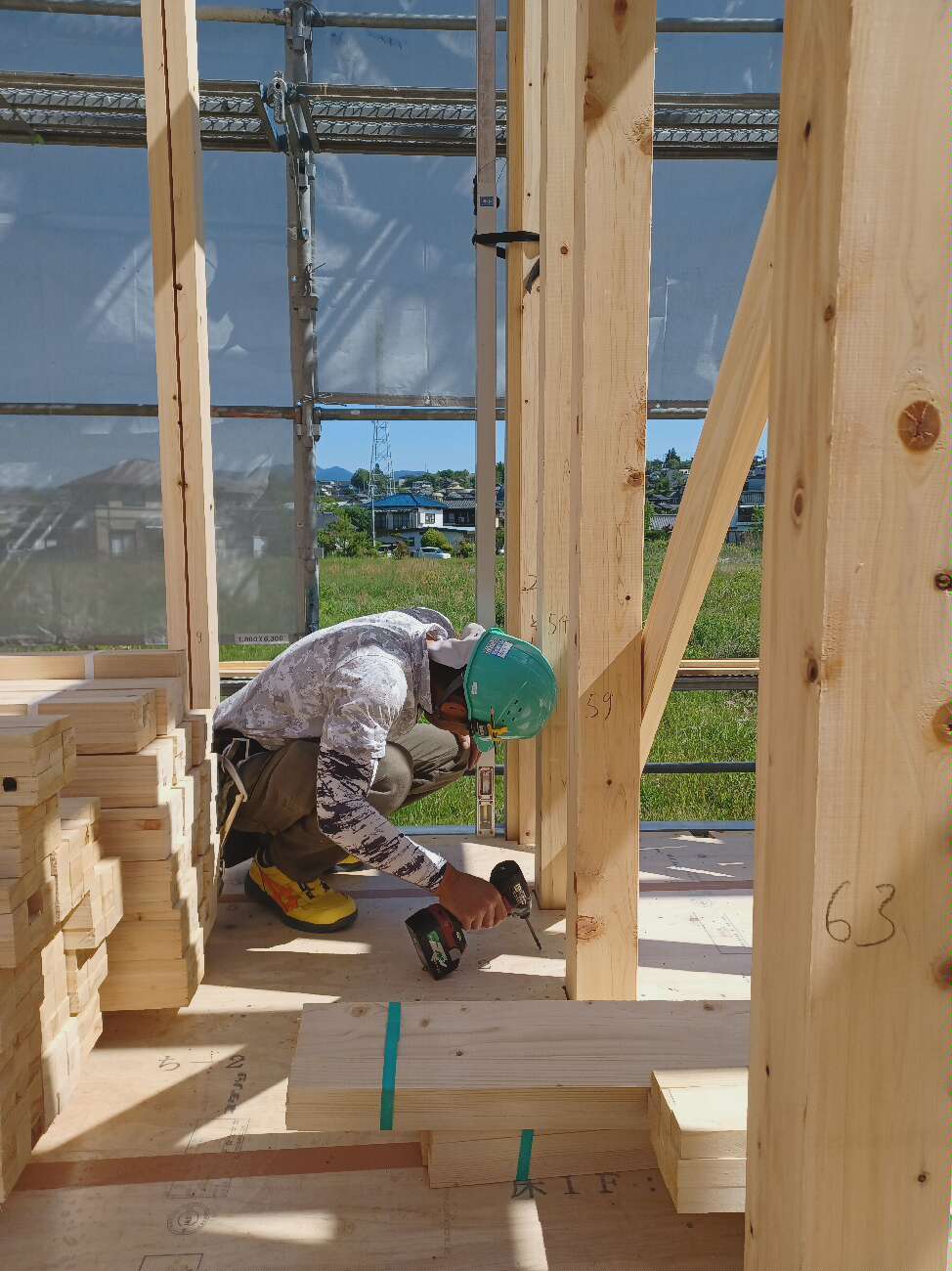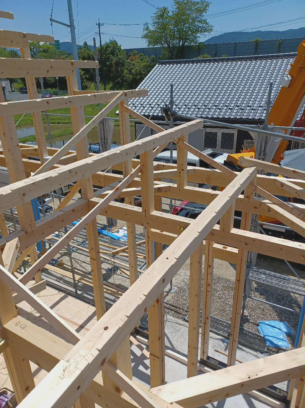そのおかげで初日にしてはかなり順調に進み、1階の柱おこし、桁組、2階も同様に柱、桁等、屋根の下地の垂木、合板の一部まで施工できました。