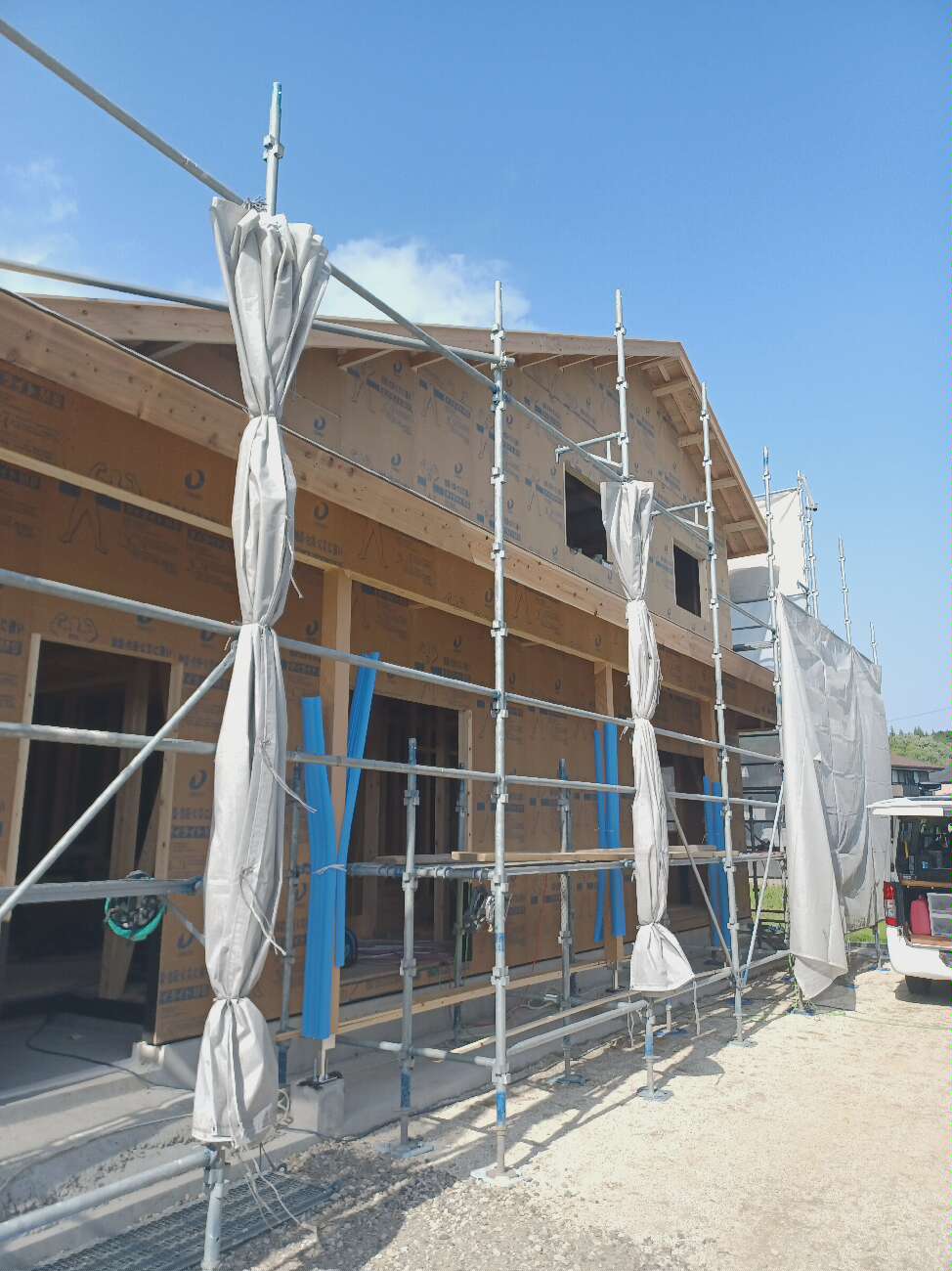 その後、先行足場を施工し、建て方の初日を迎えて次の日が上棟本日となります。