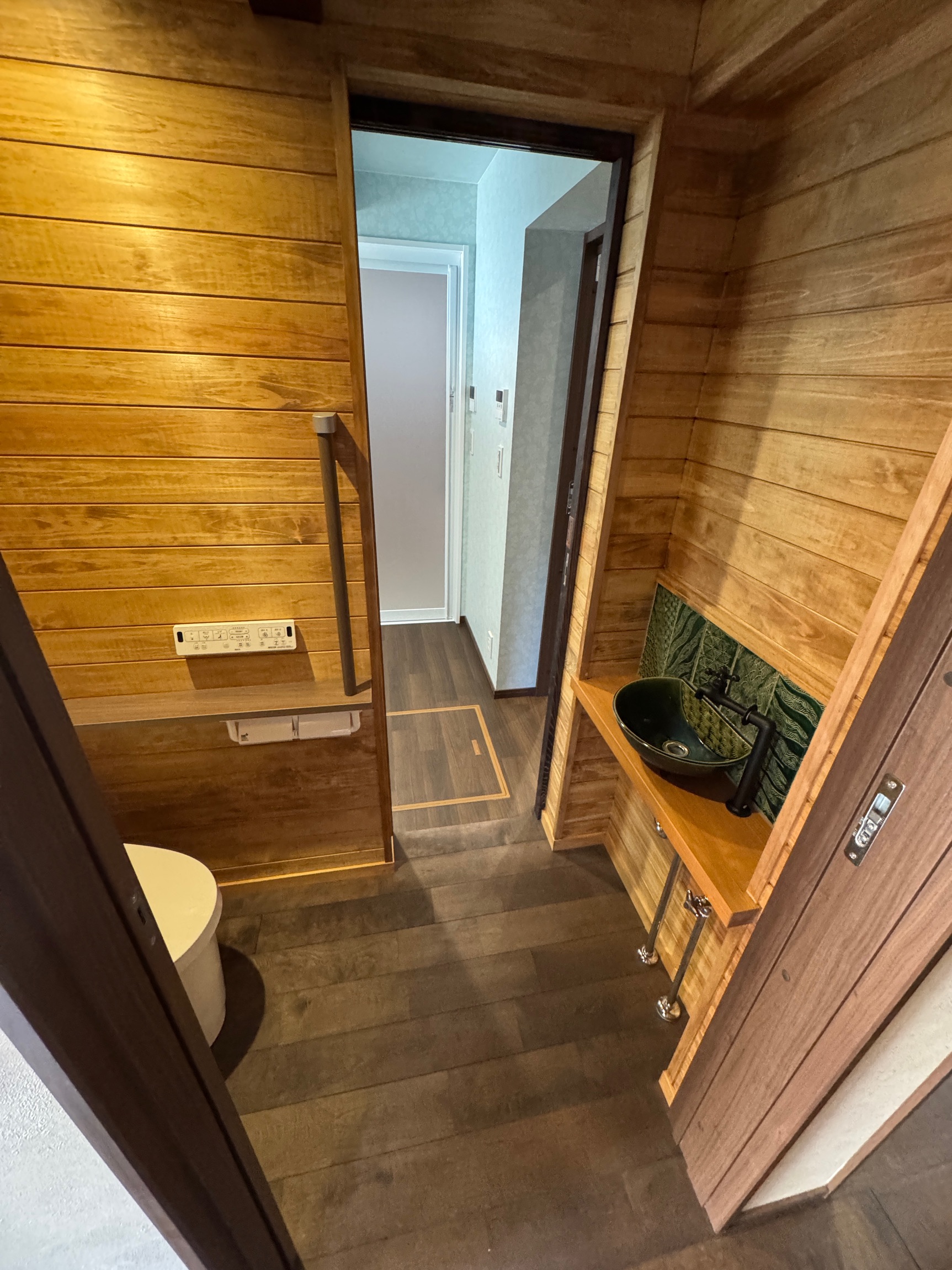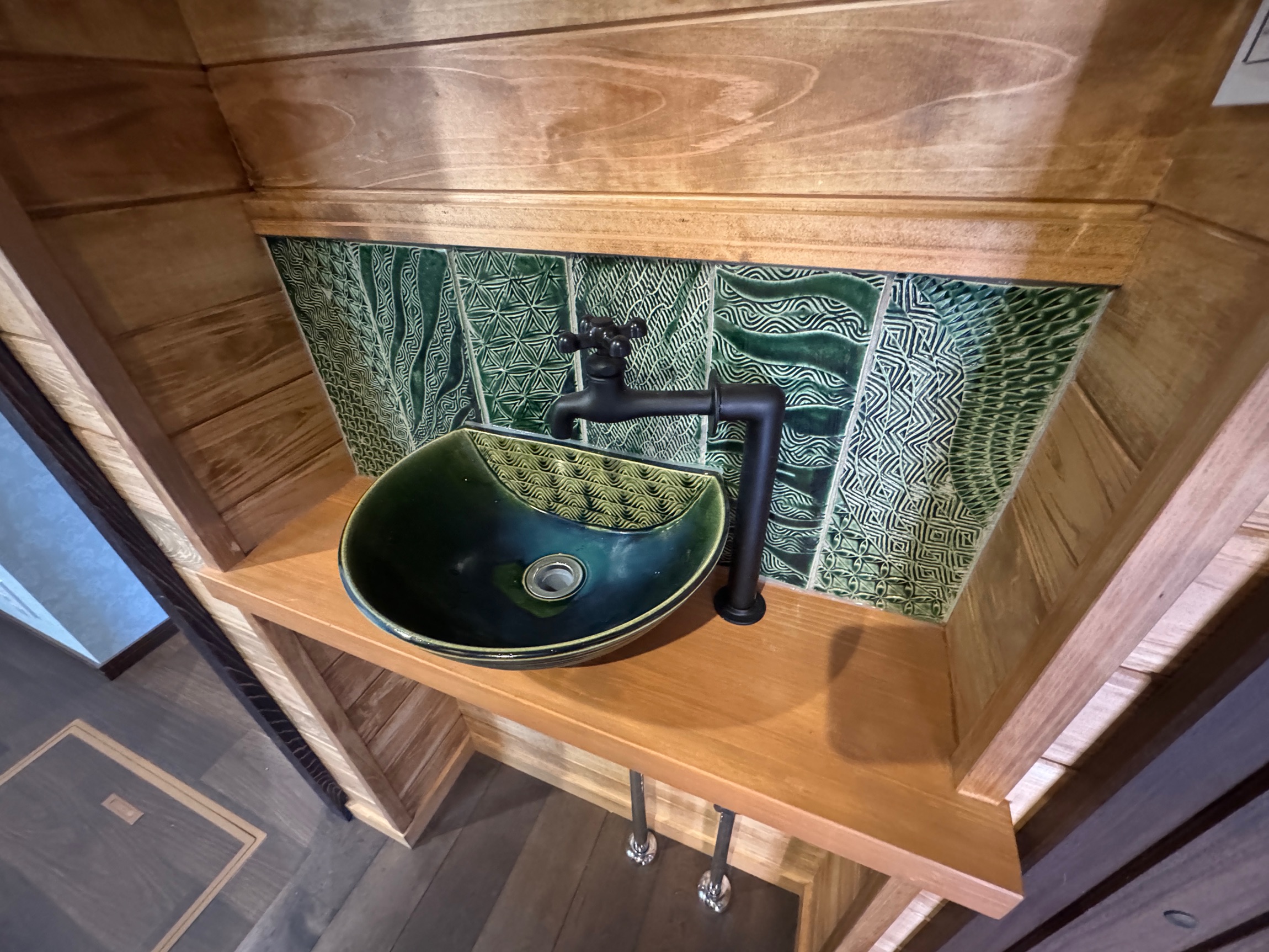 ご自身で焼かれた土間タイルや手洗い鉢なども設えてあり、