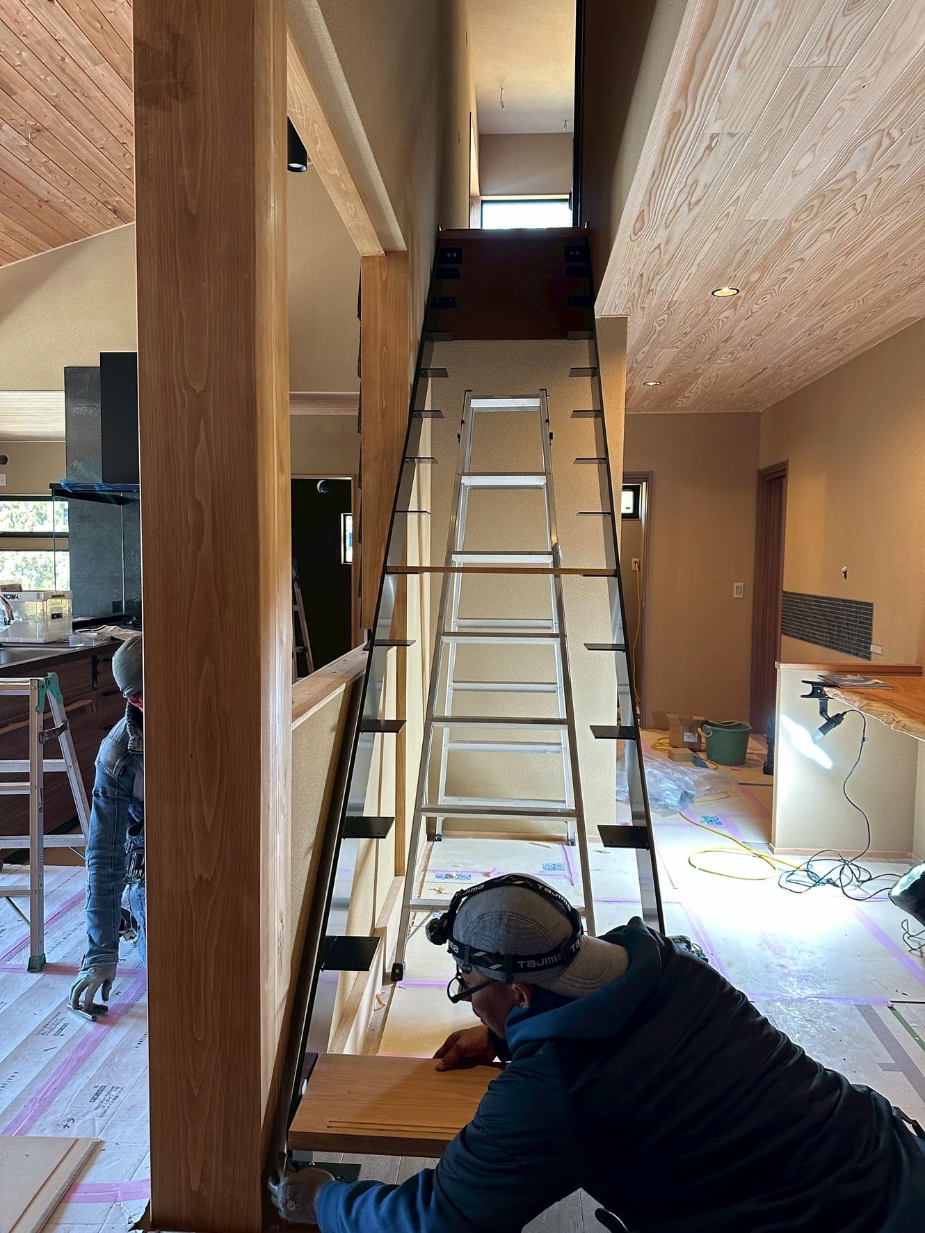 左官工事中の左官屋さんに協力いただき、計5名で施工です!