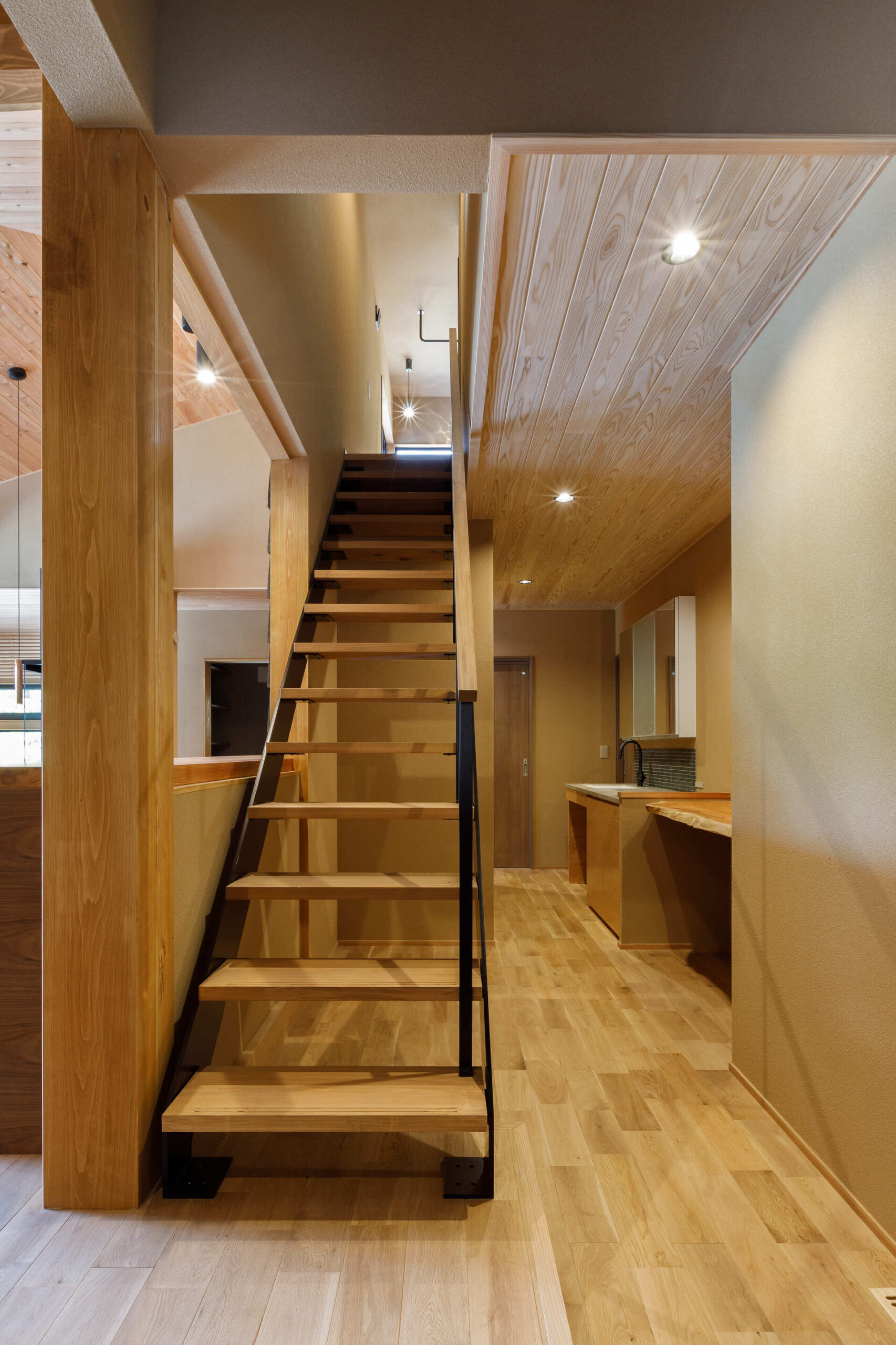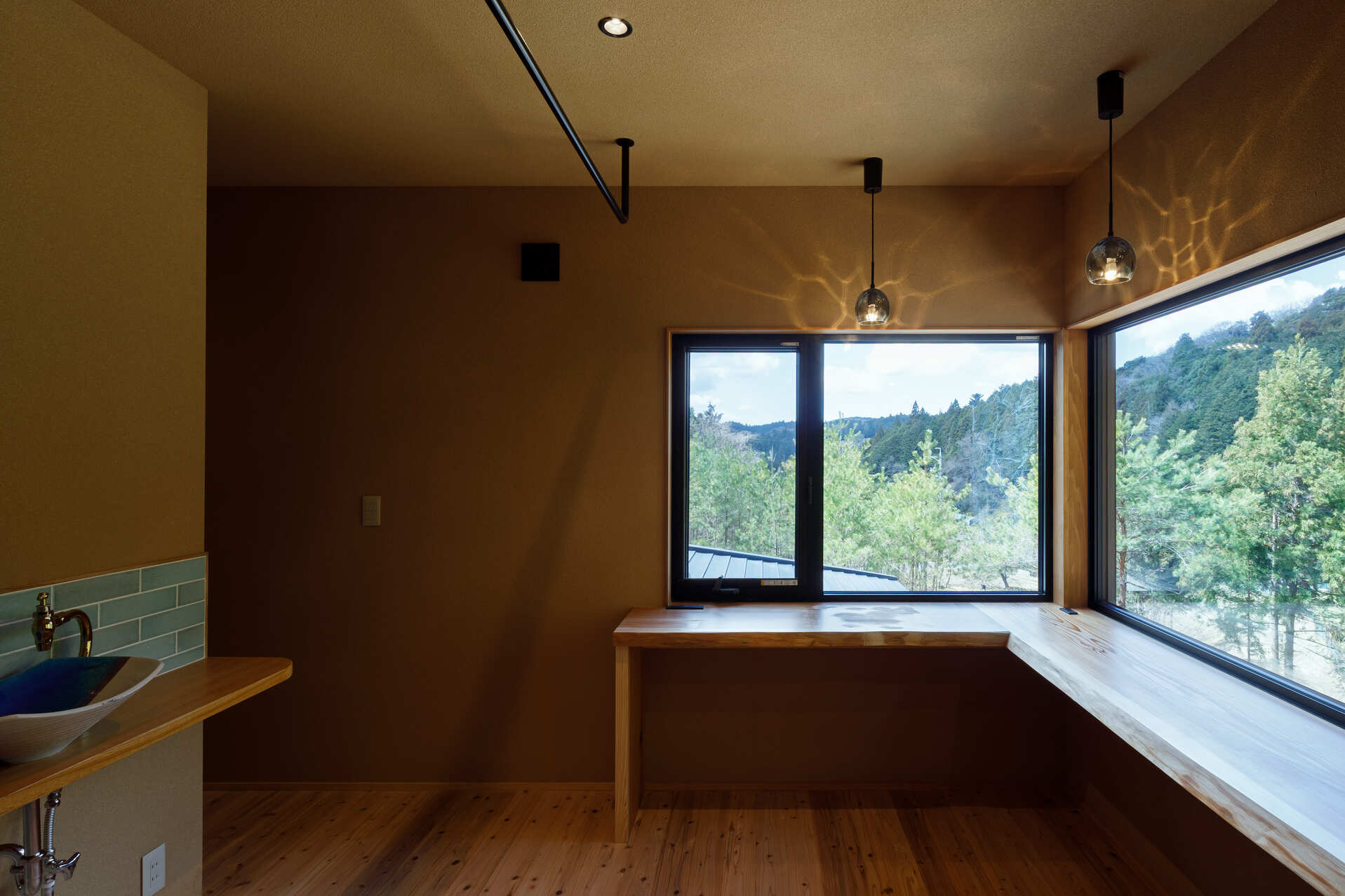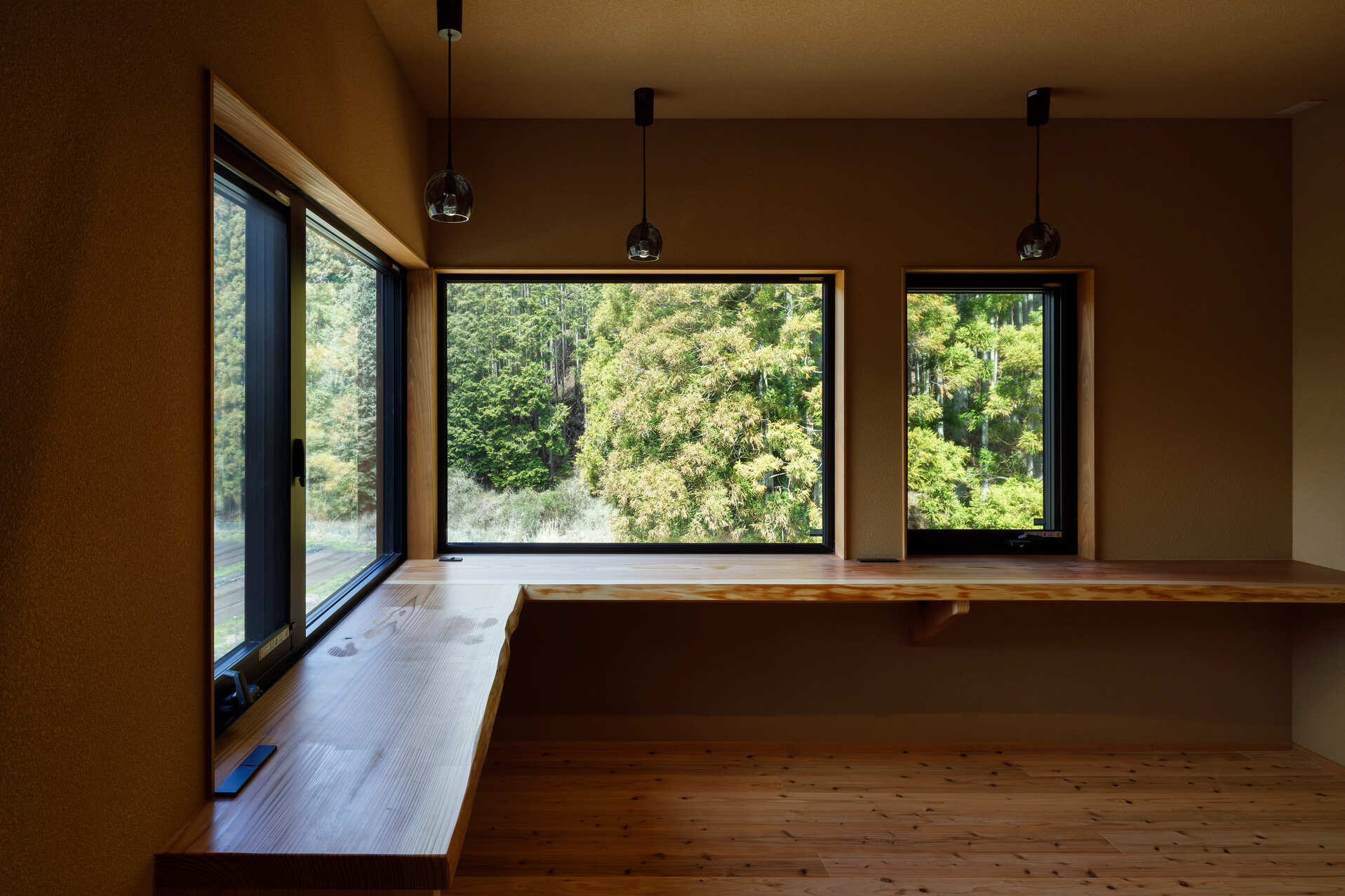 ブログでも上げました鉄骨の階段を上がりますと、2FのホールにはL型に窓と無垢カウンター(杉)が配置されており、窓からの眺めが畳コーナー同様、大自然を感じられます。
