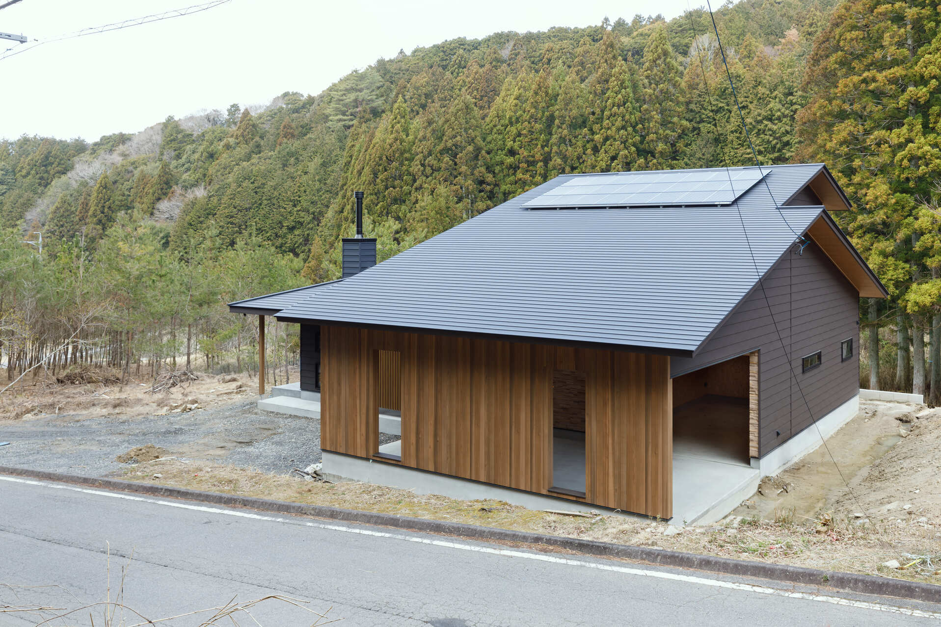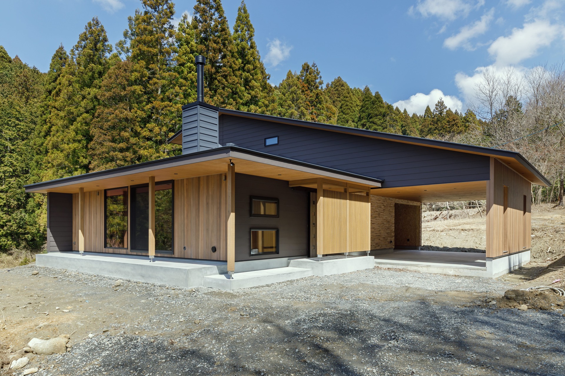 ガレージまで続く圧巻の大屋根と、ストーブの煙突がトレードマークの下屋