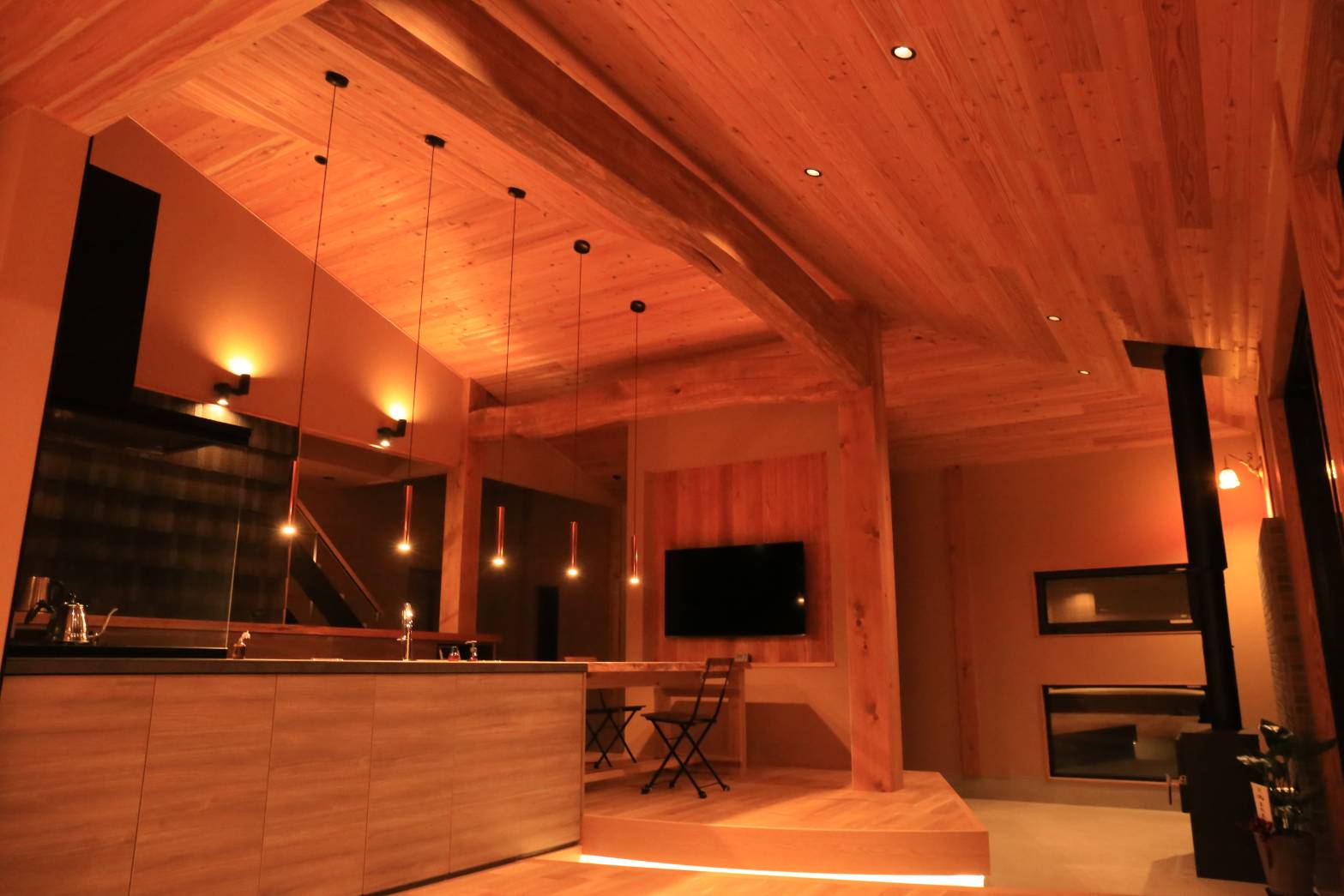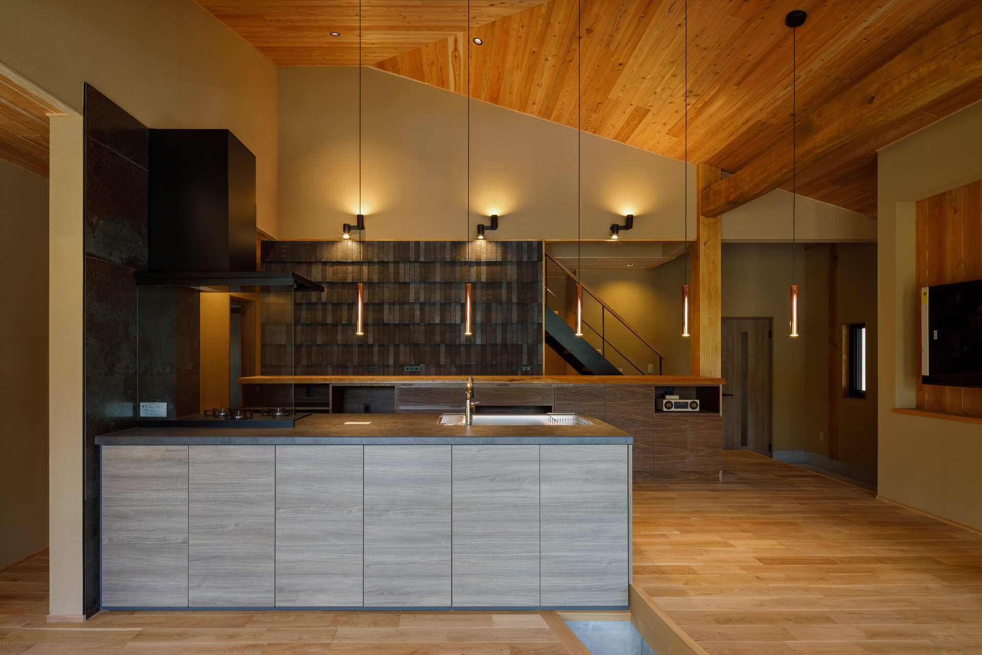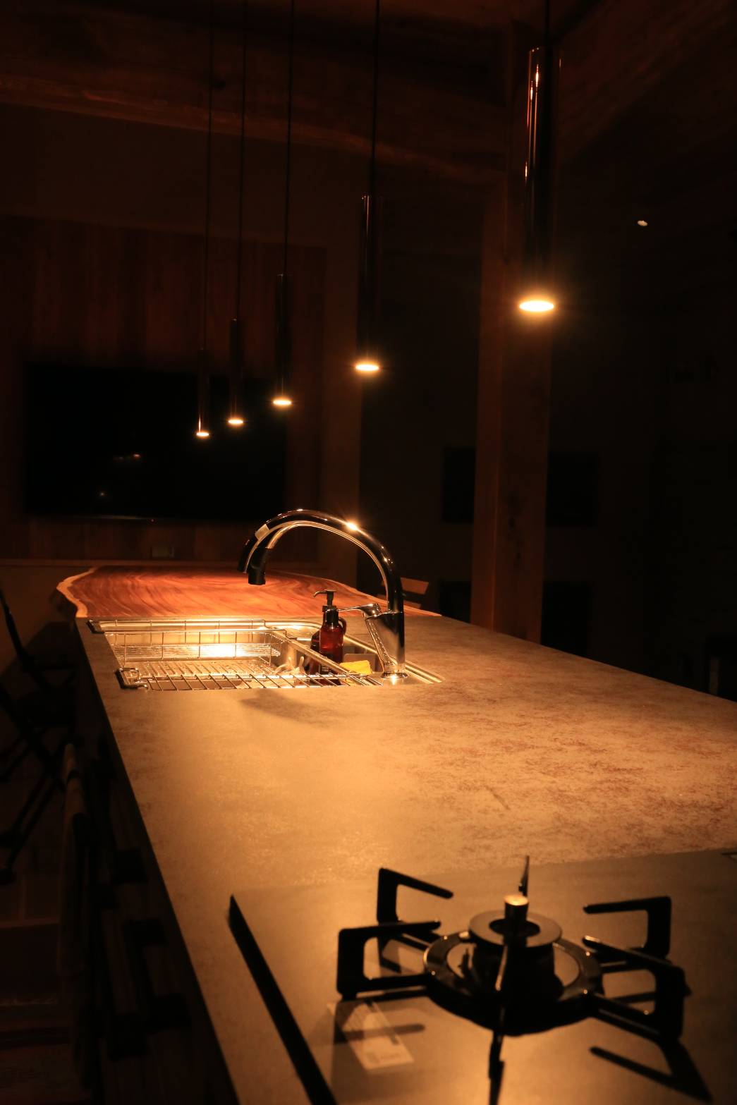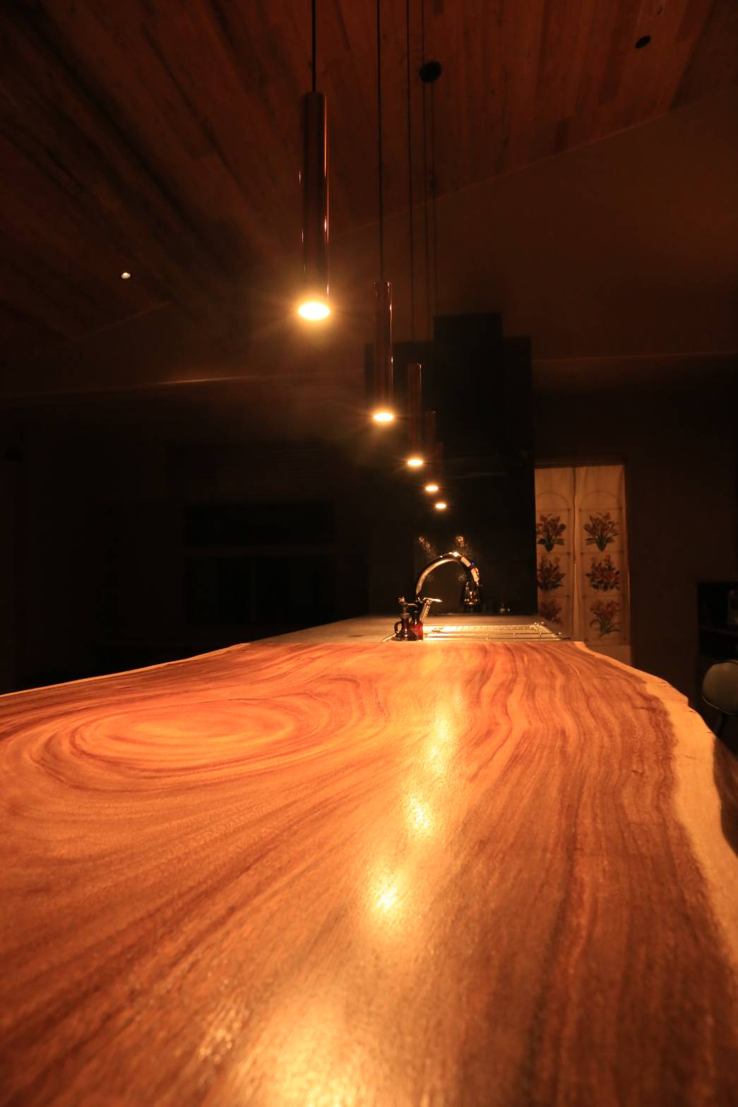 キッチンからダイニングへ続くペンダントライトの高さも施主様こだわり。